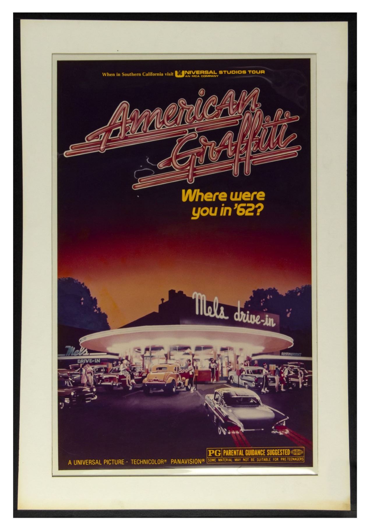 (Universal, 1973) An original promotional imagery concept for "American Graffiti". This concept comes from the collection of Bill Wallen, and was created with printed background imagery, a hand-trimmed and applied title, and a clear overlay sheet with silkscreened yellow text. The artwork has an art board backing and measures 24.25"x17.25". The condition is very good with some yellowing around the edges of the mat.
