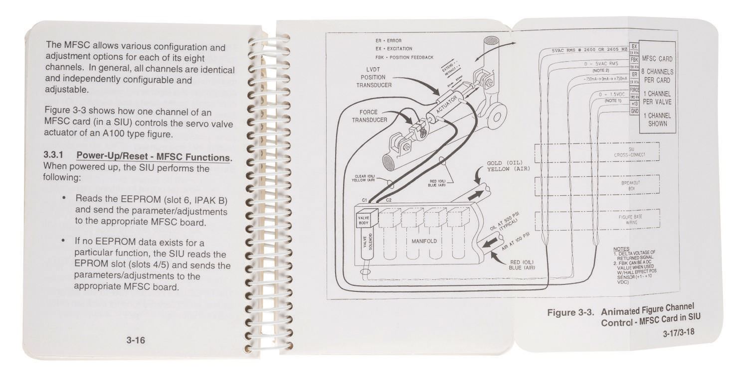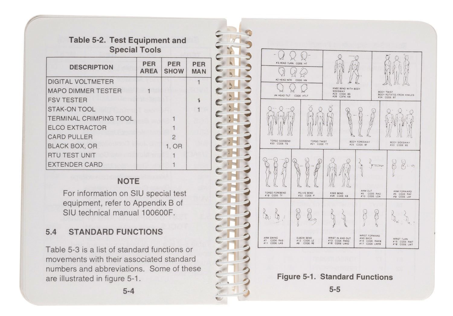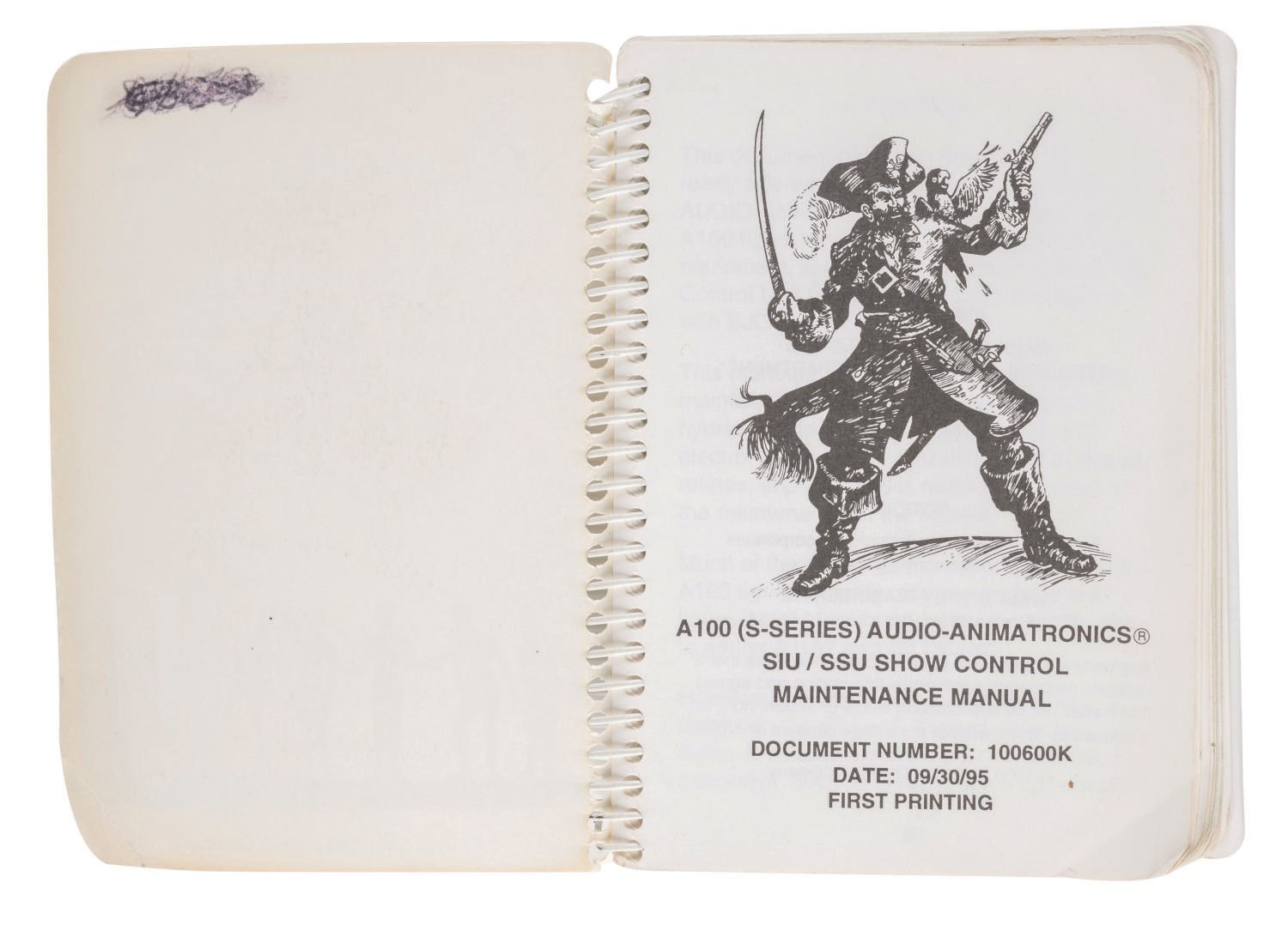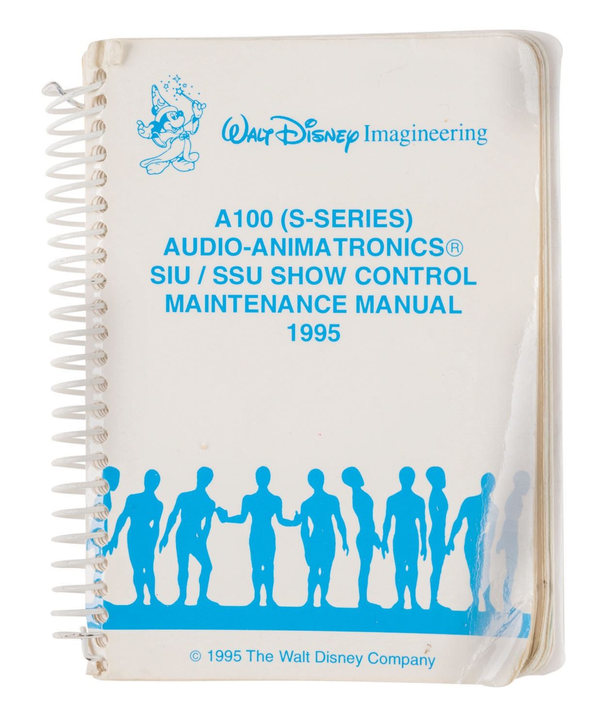 (Imagineering, 1995) A first printing of a manual prepared for the Show Control and Maintenance of A-100 (S-Series) Audio-Animatronics Figures – the most complex to date. The 125-page Walt Disney Imagineering publication features diagrams, tables, within sections dedicated to the operation of the Show figures. Measuring 4"x5", the spiral-bound publication is in very good condition with scuffs, minor creases, and wear throughout from use.