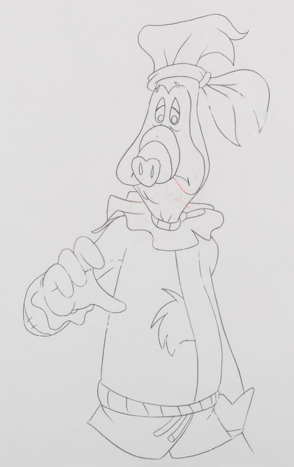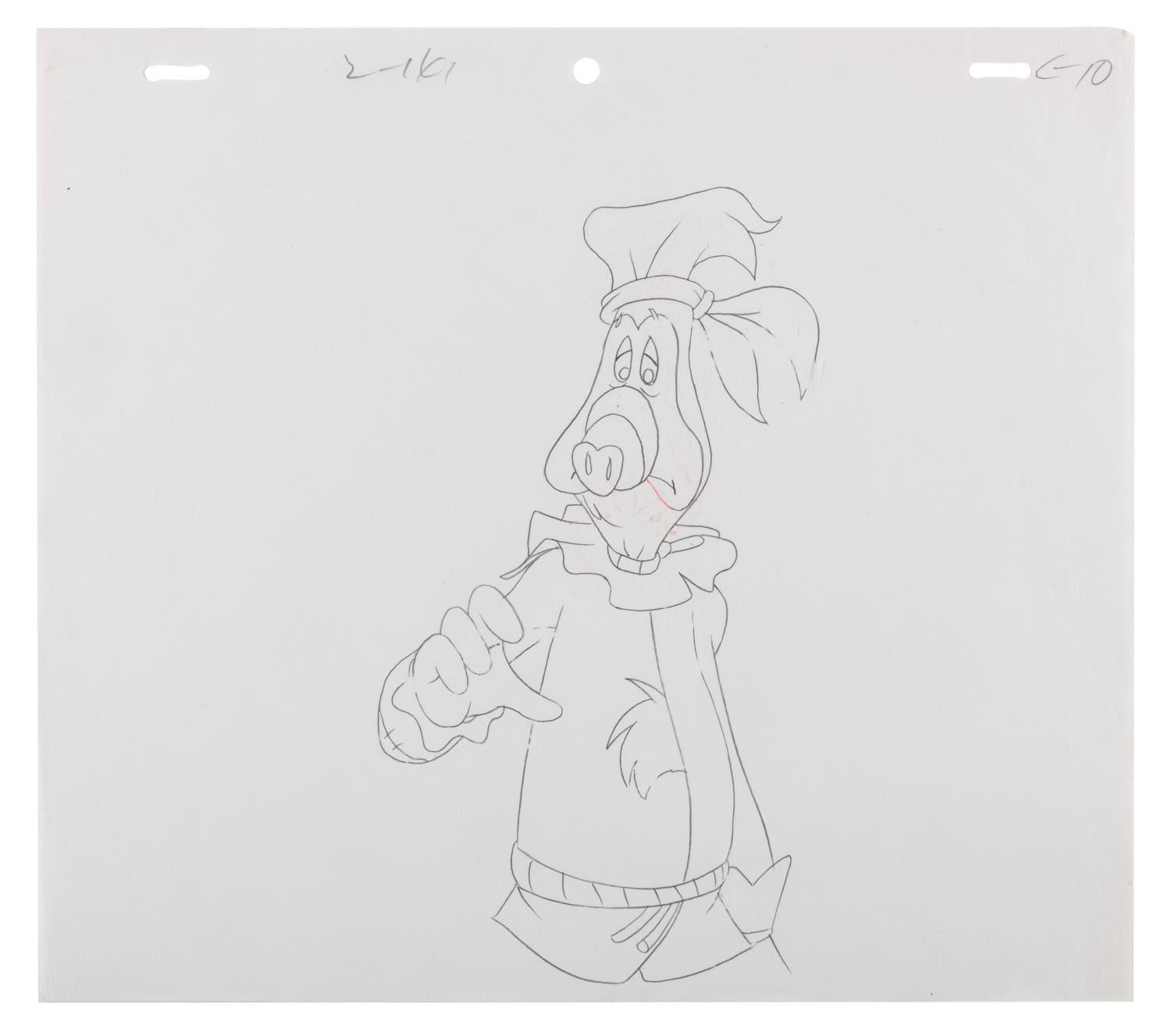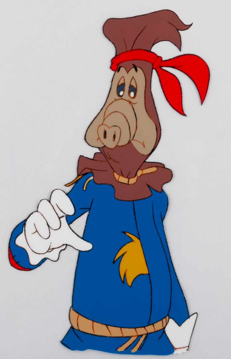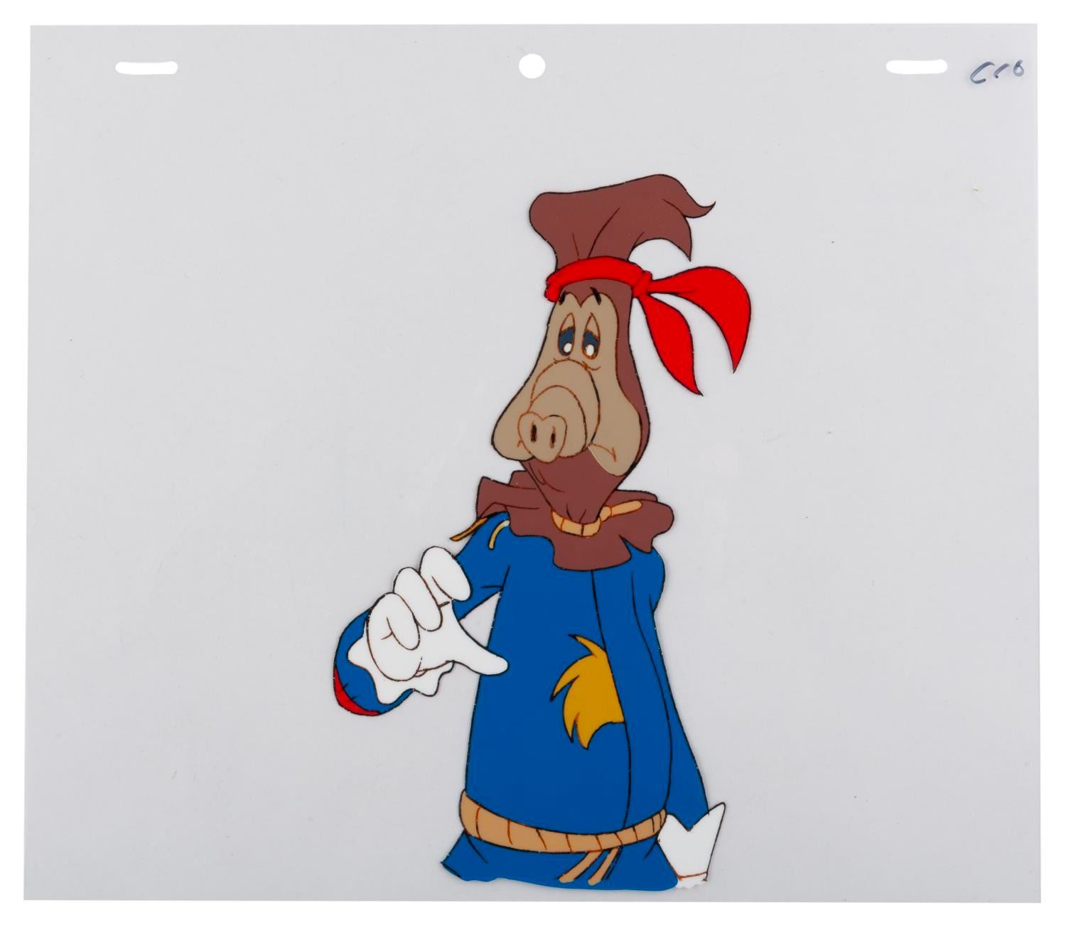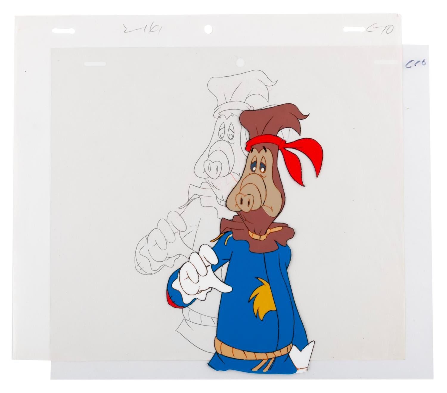 (DiC, 1988) An original production cel and drawing from "ALF Tales " of Skip, Alf’s Melmacian friend, as the Scarecrow in the Wizard of Oz. With a character image size of 3.75 " x 7.5 " on the 9 " x 10.5 " cel and paper, the piece displays in good condition with fading to some lines, mainly seen in the face.
