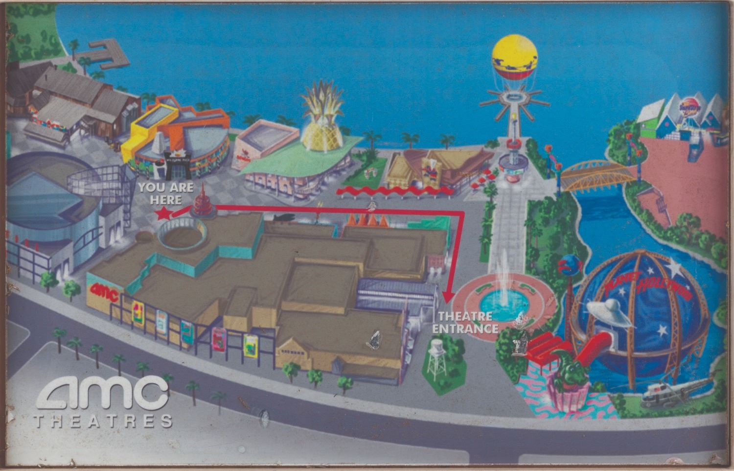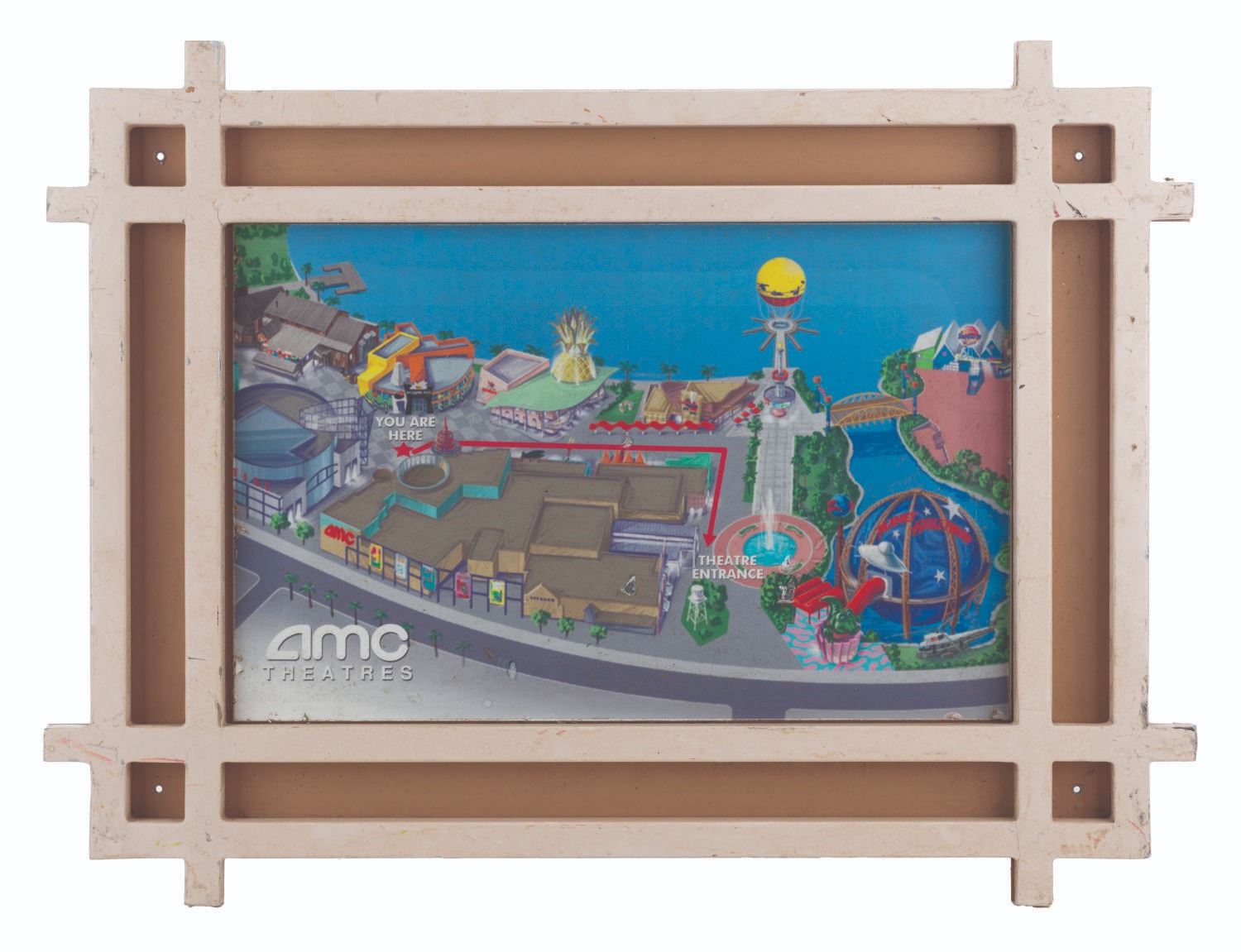 (Downtown Disney, 1997-2000s) A uniquely framed wall map with directions to AMC Theatres at Walt Disney World's Downtown Disney. With an image size of 10.5” x 16.5” in an 18” x 24” display, the metal wall map is in fair condition with heavy stains, cracks, scuffs, scratches, and wear from Resort use.