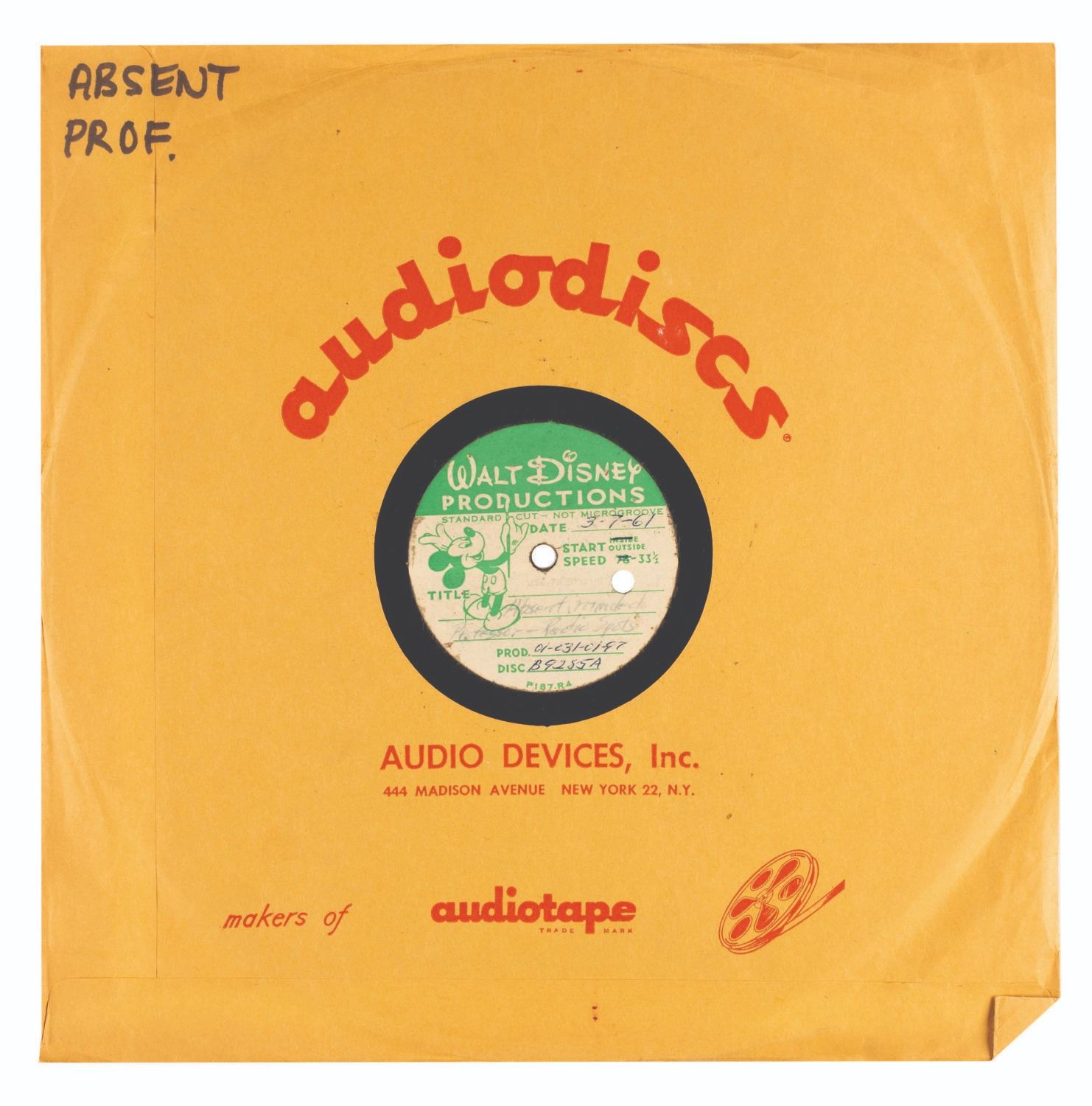 (Disney, 1961) An acetate of commercial radio spots for “The Absent-Minded Professor,” recorded March 7, 1961. Measuring 12” in diameter, the 33 ⅓ RPM record is in very good condition with scratches.