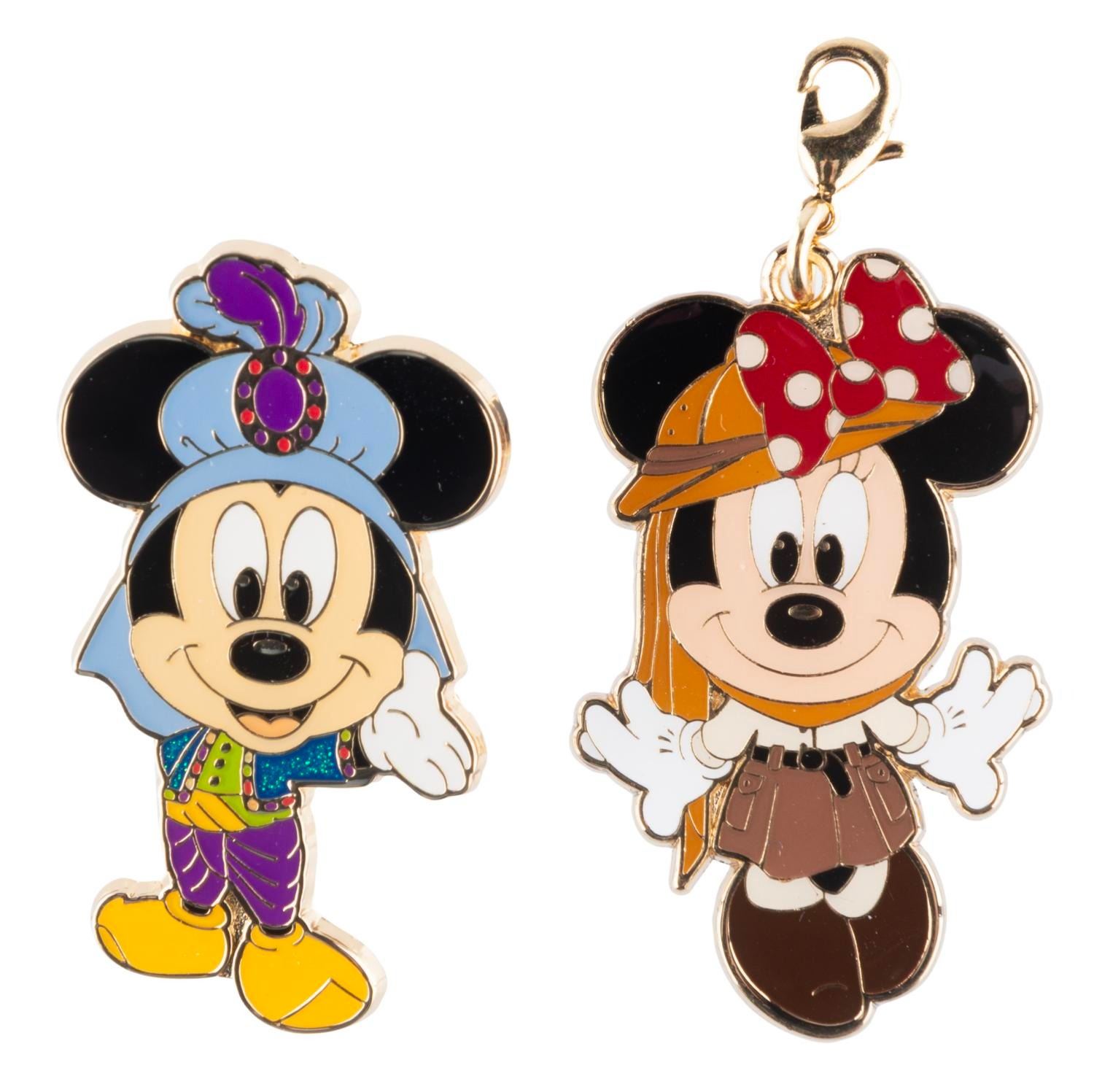 (Tokyo Disney, 2008-2020s) An Abu's Bazaar Mickey pin and Jungle Carnival Minnie charm. Abu’s Bazaar at Tokyo DisneySea and Jungle Carnival at Tokyo Disneyland are areas where Guests can play games of skill for a chance to win prize pins and charms. Measuring 1" x 1.75" each, the pin and charm are in fine condition and sealed in their original bags.