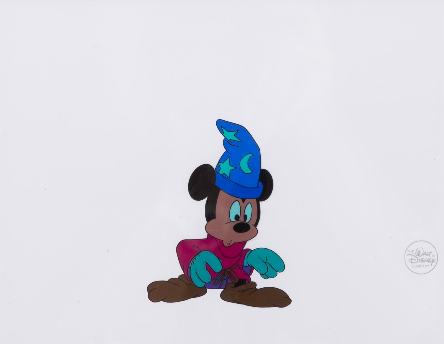 (Disney, 1988) An original Sorcerer’s Apprentice production cel and drawing from the 1988 Academy Awards. In celebration of his 60th birthday, Mickey and his friends made an appearance at the awards show to present the Oscar for the Best Animated Short film. Mickey measures 3” x 3.75” on a 7” x 9” visible cel and 14.5” x 16.5” framed overall. The pencil drawing features a 3” x 3.75” Mickey on a 10.5” x 12.5” animation sheet. Overall the piece is in very good condition with light scuffing to the frame, and the drawing displays light discoloration and creasing from age and production use.