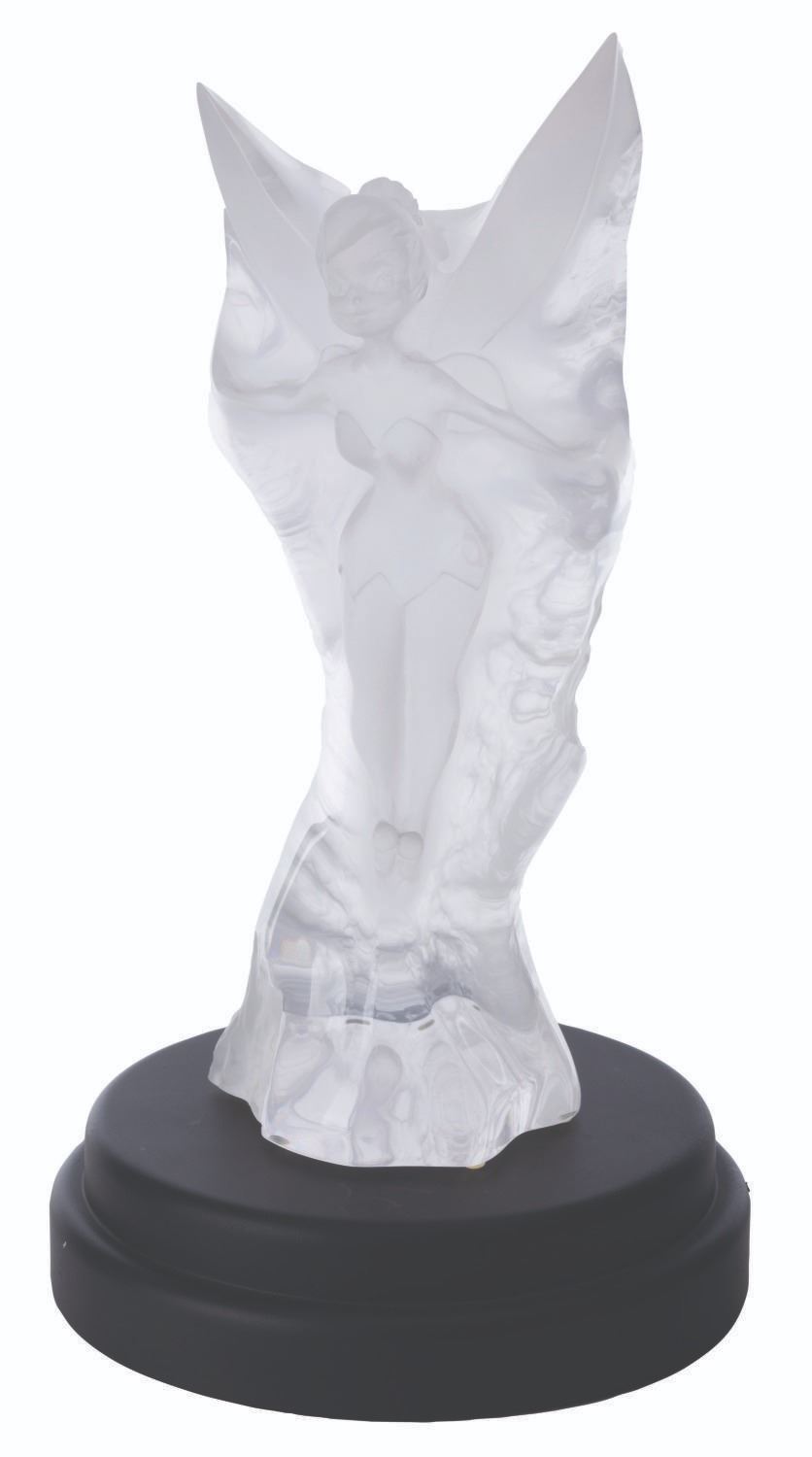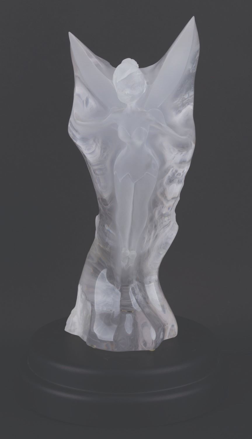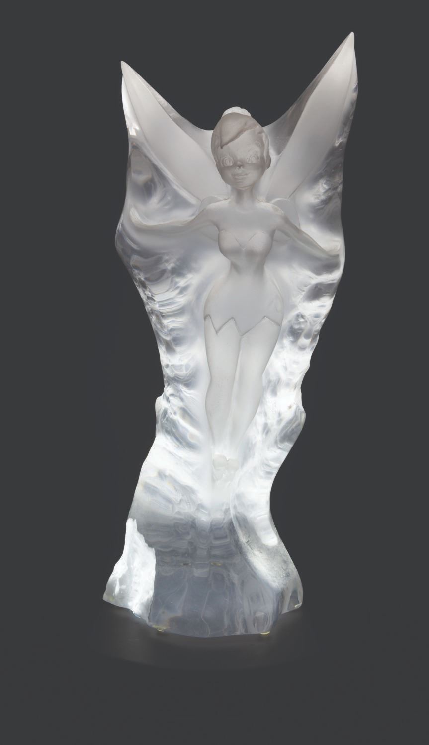 (City Art, 1998) A rare acrylic sculpture of Tinker Bell from Walt Disney’s “Peter Pan." Featuring Tinker Bell with her wings outstretched and ready to take flight, the gorgeous sculpture was designed by Lars Loma and released in 1998 in a limited edition of only 500. Loma’s signature is carved along the bottom right edge with the edition number 105/500. Measuring 18" tall and 8" in diameter, the sculpture is in very good condition with light handling wear. This piece comes with a 12" diameter x 2.75" high light-up base.