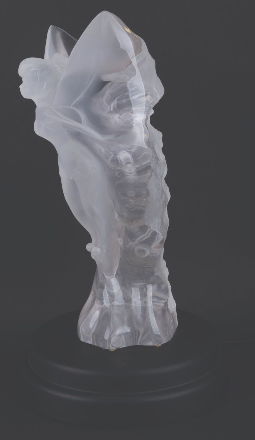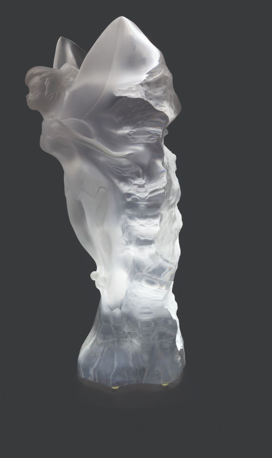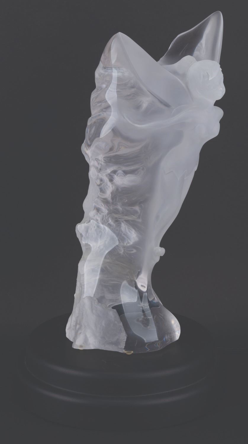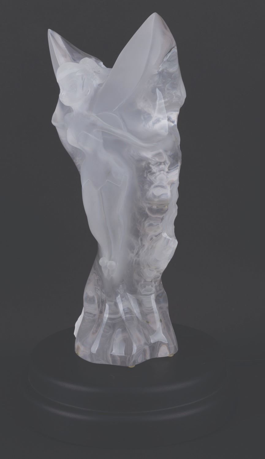(City Art, 1998) A rare acrylic sculpture of Tinker Bell from Walt Disney’s “Peter Pan." Featuring Tinker Bell with her wings outstretched and ready to take flight, the gorgeous sculpture was designed by Lars Loma and released in 1998 in a limited edition of only 500. Loma’s signature is carved along the bottom right edge with the edition number 105/500. Measuring 18" tall and 8" in diameter, the sculpture is in very good condition with light handling wear. This piece comes with a 12" diameter x 2.75" high light-up base.