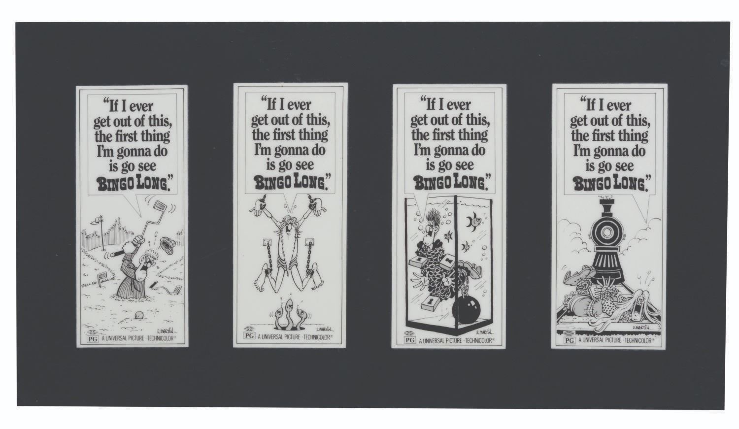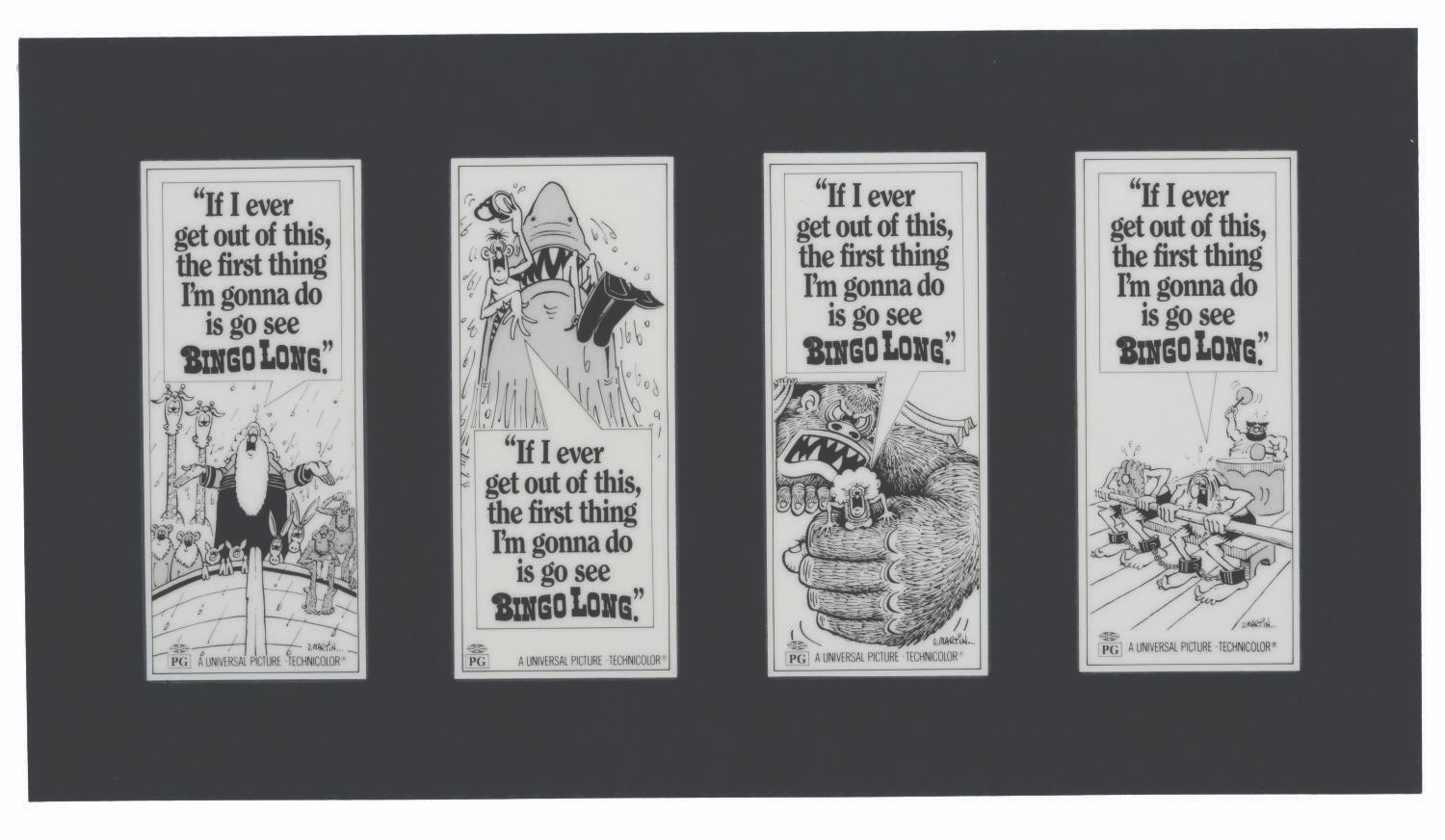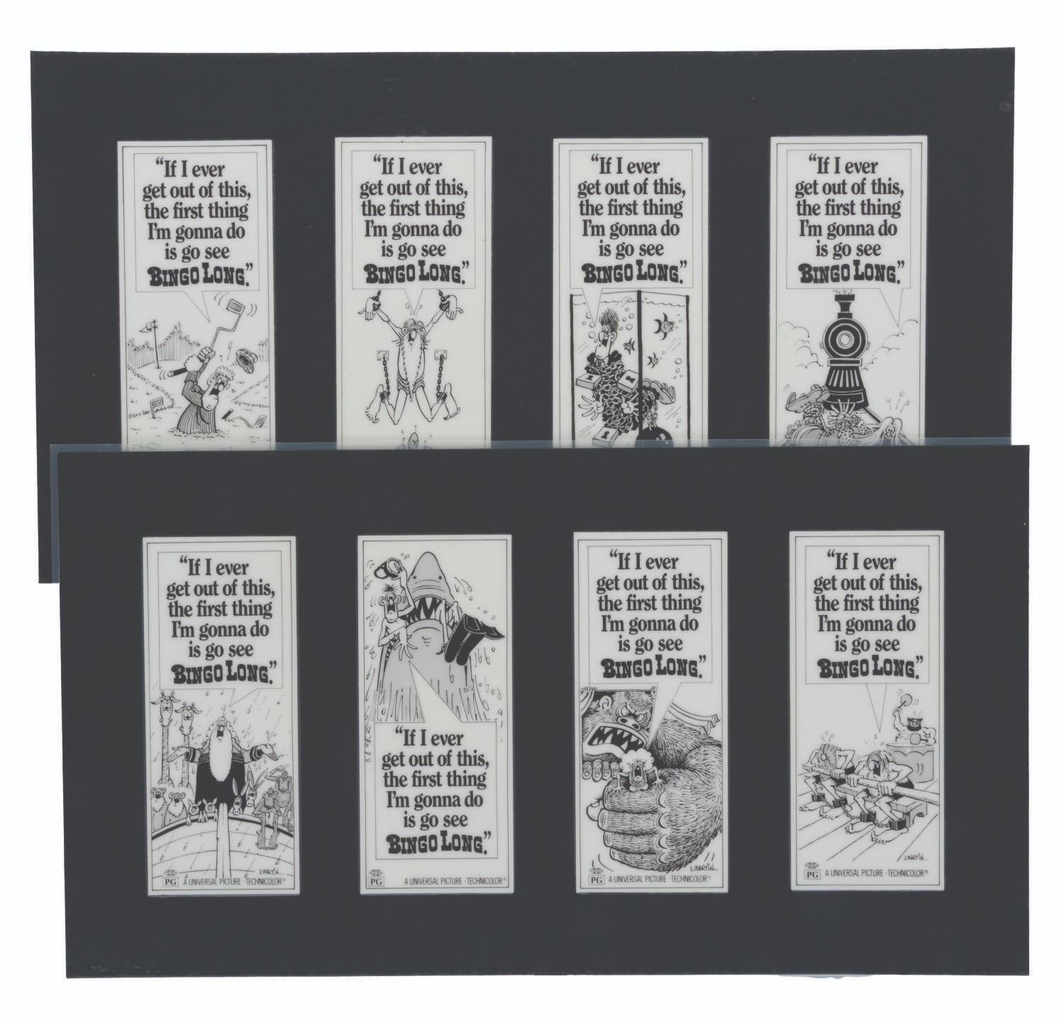 (Universal, 1976) Two pages displaying eight ads total for the 1976 film "The Bingo Long Traveling All-Stars and Motor Kings." The ads were created by Mad Magazine artist Don Martin. With no record of Martin drawing advertising before Joll Rancher candy in the 1990s, this unused campaign represents an unsung chapter in his career. With each image measuring 2.75" x 6.5" on the 10" x 18" laminated prints, the pieces display in very good condition.