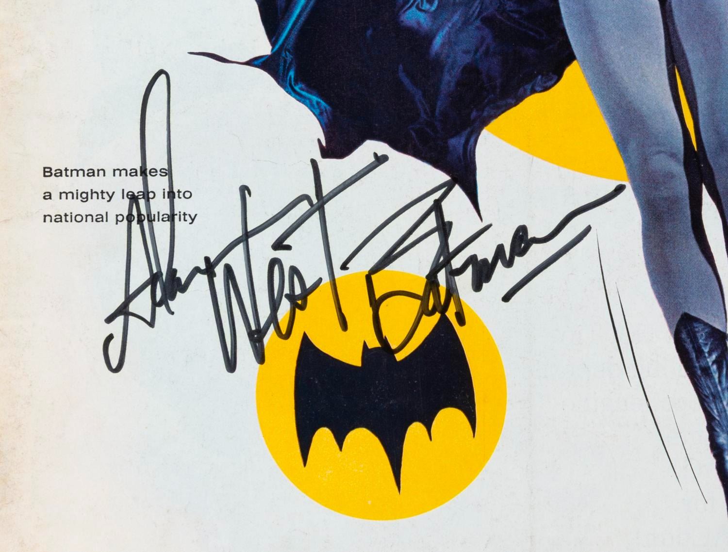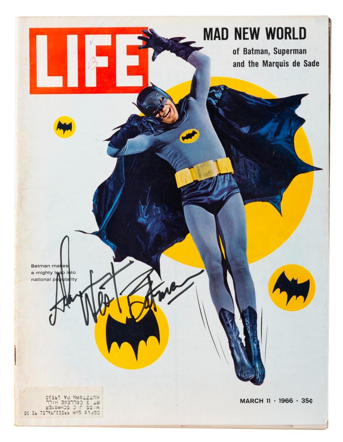 (LIFE, 1966) An Adam West-signed March 11, 1966, issue of LIFE magazine with a cover story on the Caped Crusader. Measuring 10.5 " x 13.25 ", the magazine is in good condition with discoloration from age, an address label, creases, stray pen marks, and handling wear.