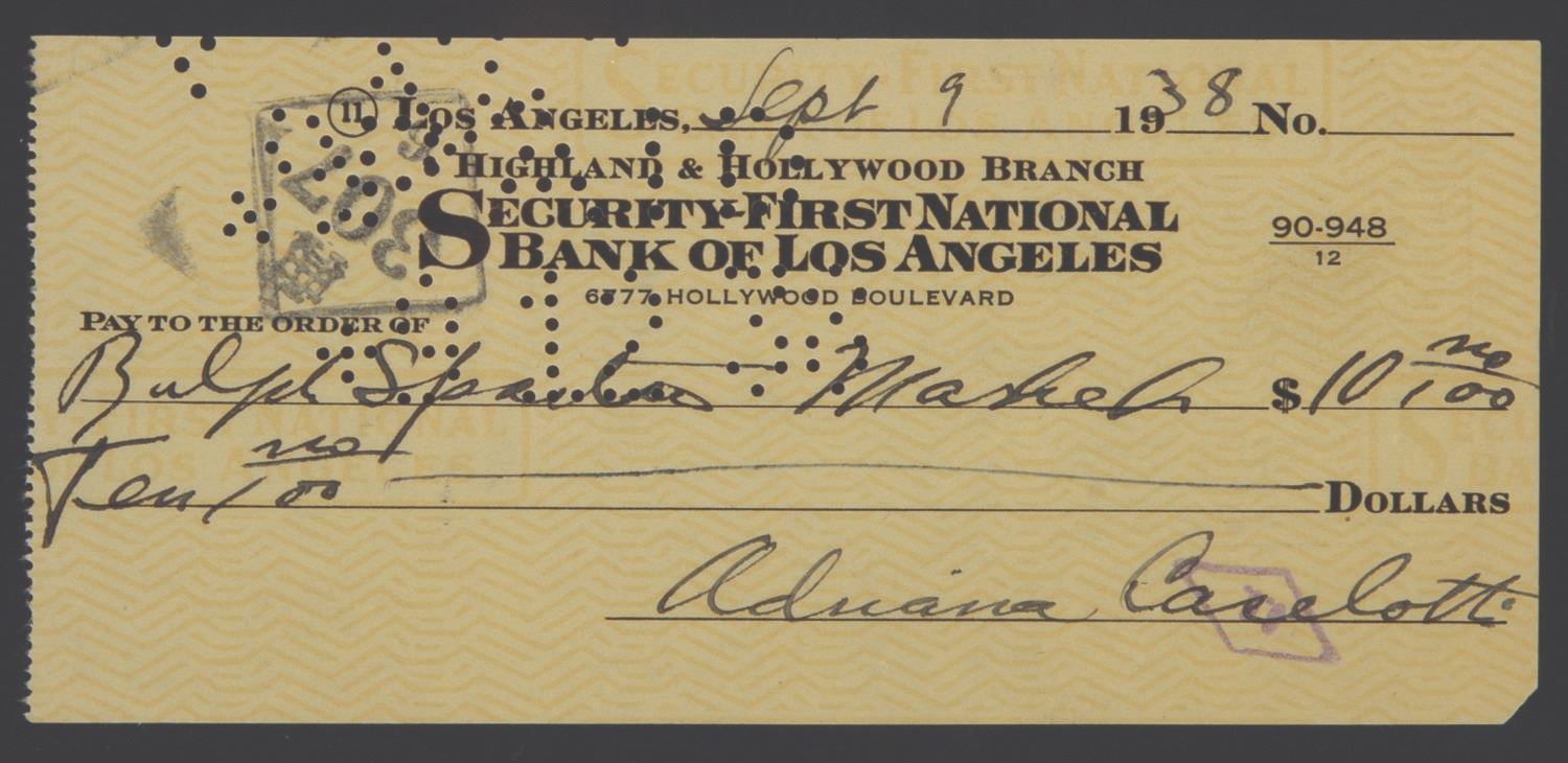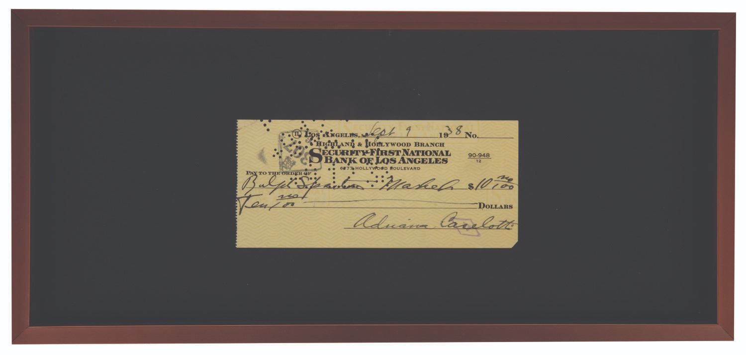 (Caselotti, 1938) A bank check signed by Adriana Caselotti, the voice of Walt Disney's Snow White. Measuring 3"x6", this check is in fine condition, exhibiting minor wear from use, and has been mounted within a 7"x15" frame for display.