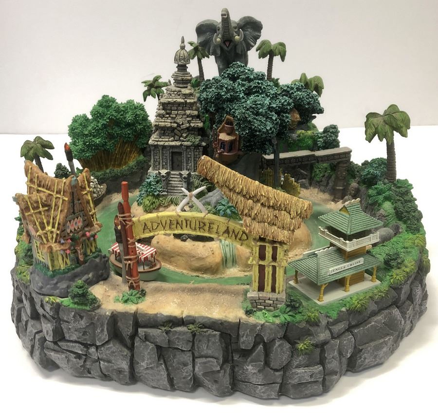 (Disneyland, 2005) An Adventureland Big Figure released to celebrate Disneyland’s 50th anniversary. The figure was sculpted by Imagineer Larry Nikolai and features the Adventureland Entrance with the Enchanted Tiki Room, Jungle Cruise, Tarzan’s Treehouse, and Indiana Jones Adventure. Battery-operated features include lights, 5 different attraction sounds, and a water pump that moves the boats around the river. The sculpture is still in its original box and has never been removed or displayed. Due to the very delicate nature of this piece, it has been inspected in the box, and appears to be in fine unused condition as shipped from the factory. Batteries are not included.