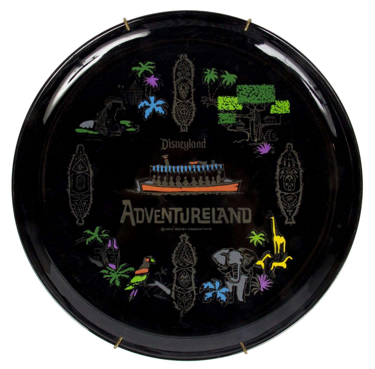 (Disneyland, 1960s) An extremely rare black Adventureland serving tray. The tray features stylized imagery of the Jungle Cruise and the Swiss Family Robinson Treehouse with colorful accents. Measuring 10.5" in diameter, this plastic vintage souvenir is in very good condition with faint scuffs and minor surface wear.