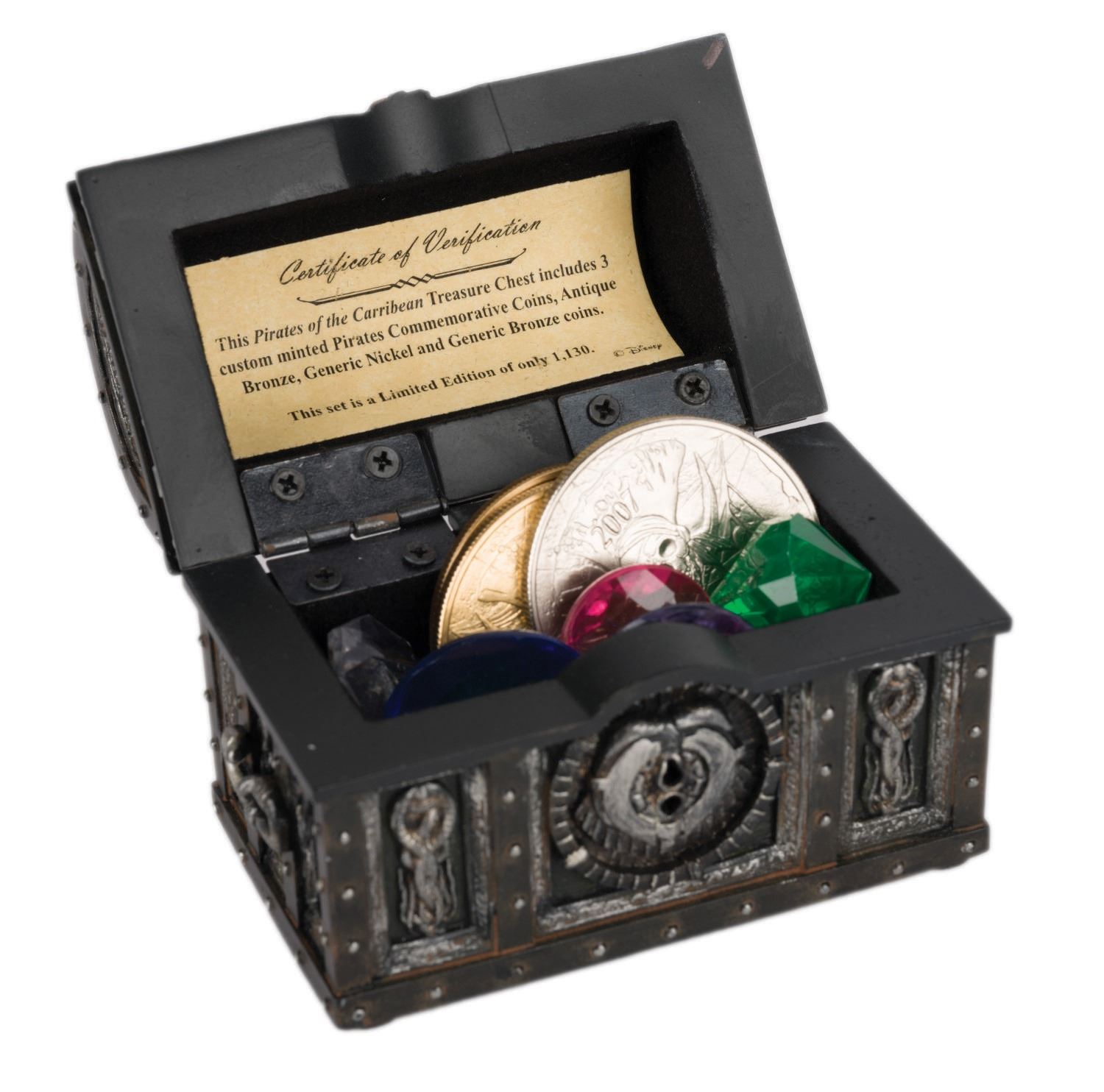 (Walt Disney World, 2007) A Davy Jones Locker souvenir of "Adventures on the Seven Seas Lagoon" held at Disney's Contemporary Resort from May 22-25, 2007. The event was highlighted by meet and greets with actors, Disney Legends, and limited-edition merchandise. This small chest with treasures was limited to an edition of 1,130 and contains faux jewels with custom minted commemorative coins of antique bronze, generic nickel and generic bronze. Measuring 3.5"x2.5" and 2" deep, the box and contents are in very good condition with COA and few signs of wear.