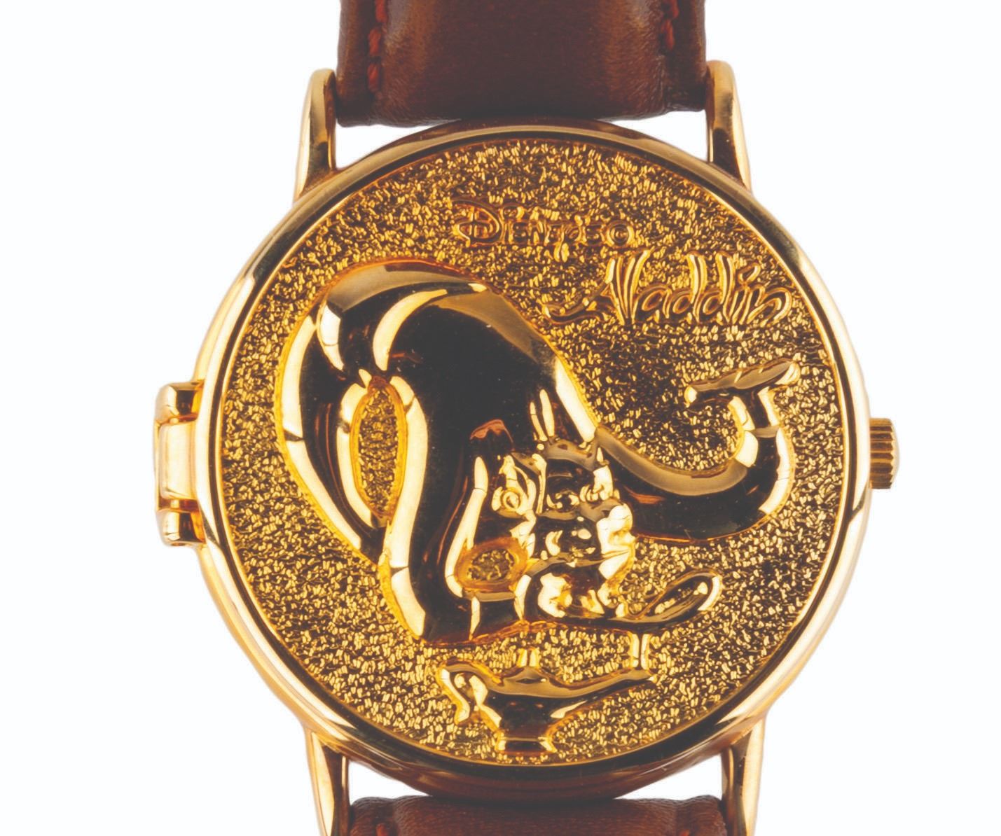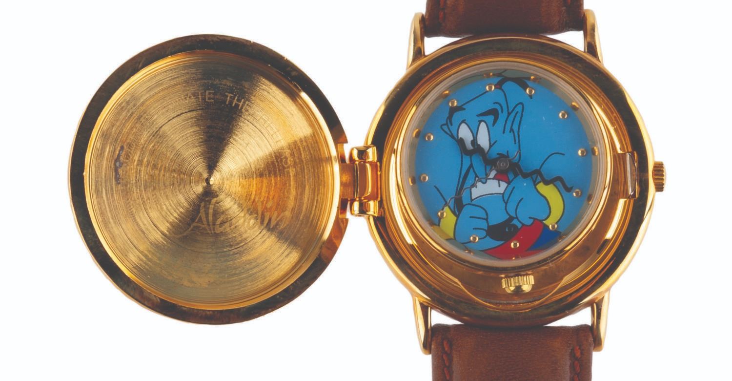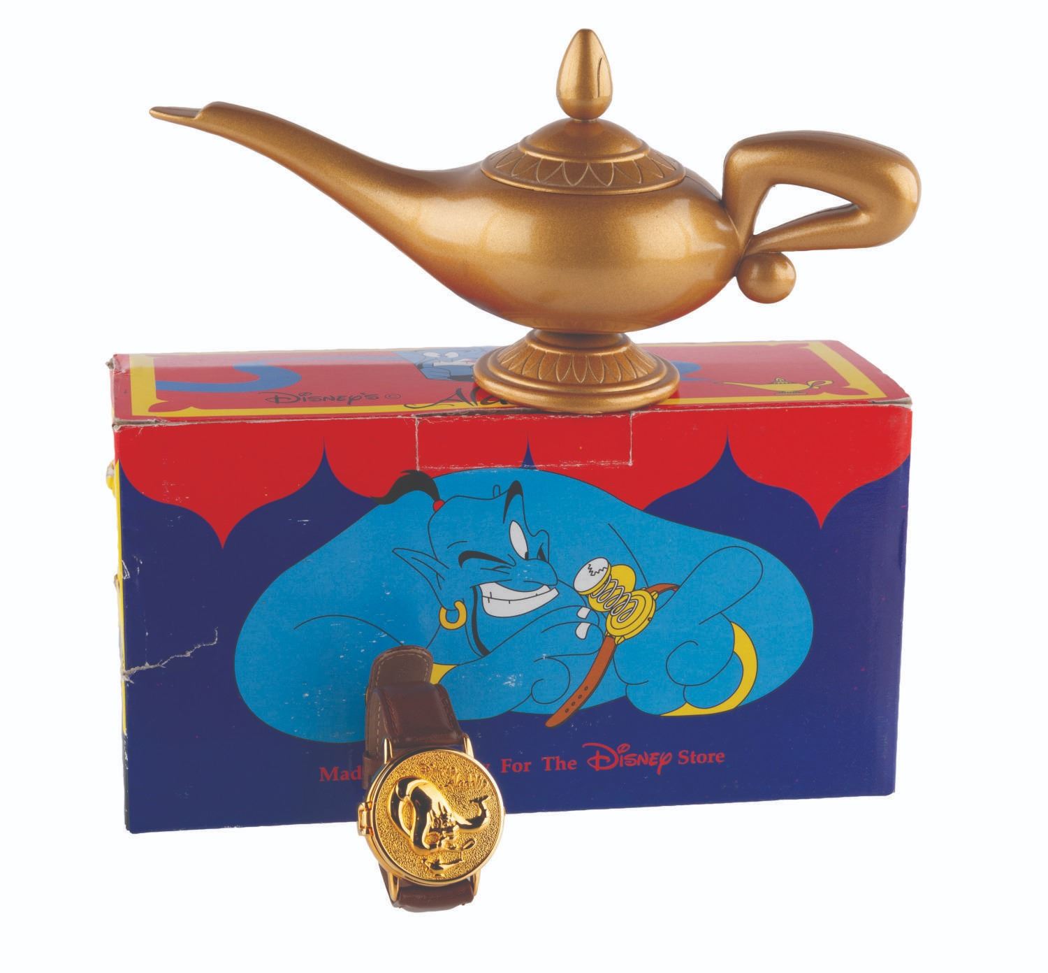 (Disney Store, 1992) A Disney Store-exclusive pop-up genie wristwatch and lamp released in time with the theatrical debut of Disney's "Aladdin." The hinged cover on the watch face pops open to reveal the Genie on a spring-mounted pop-up clock face. The set comes with a metal reproduction of the genie's lamp and the original box. The watch and the 8" x 3" x 4" tall lamp are in fine condition. The watch requires a battery and possibly service to function properly. The box is in fair condition with heavy edge wear and one torn side.
