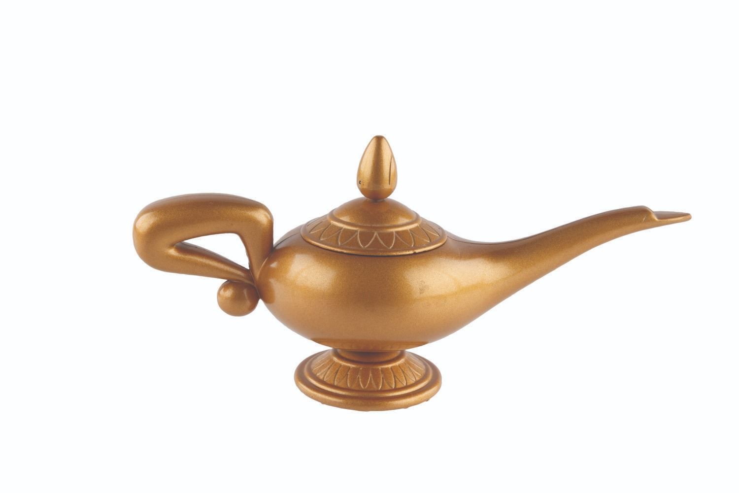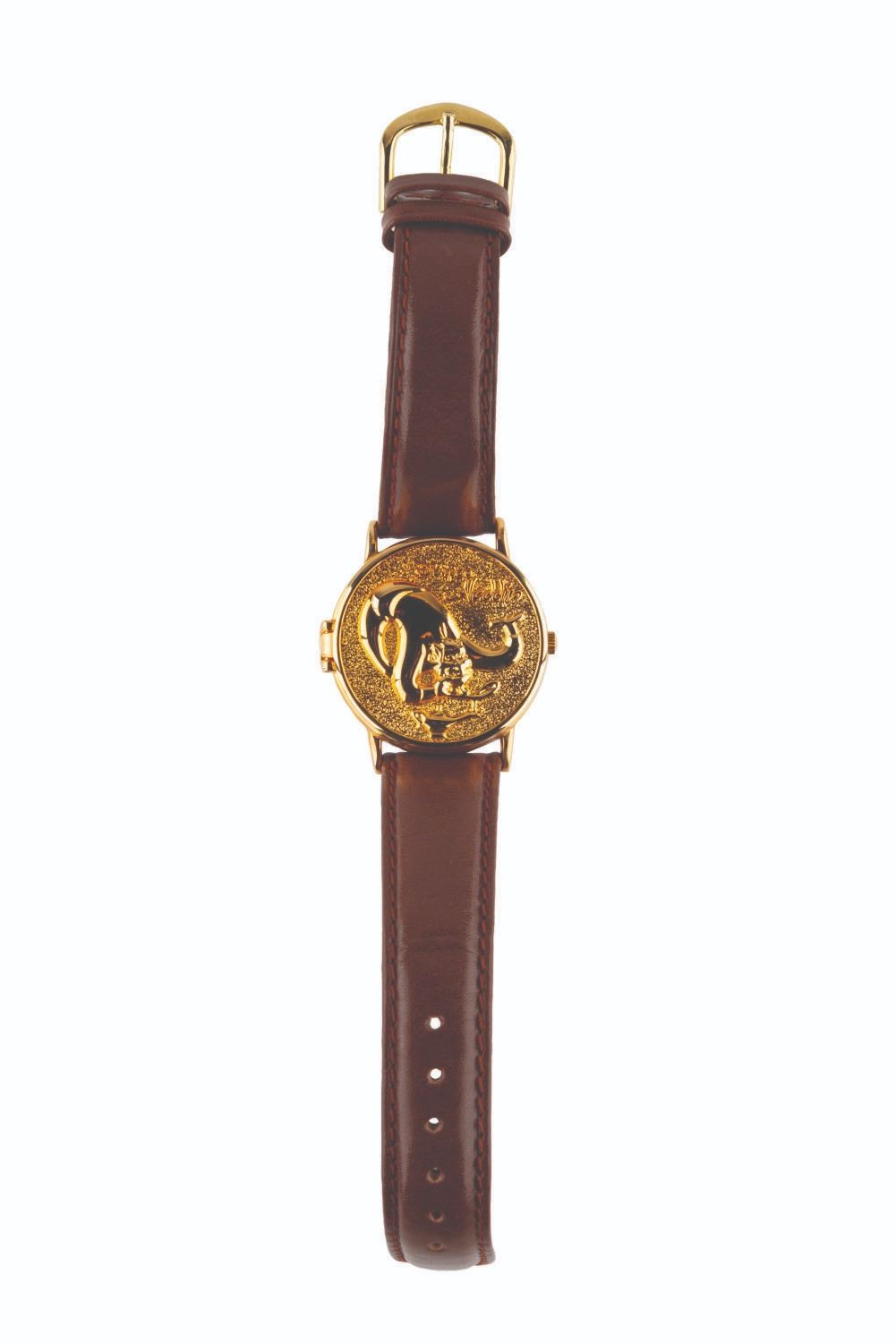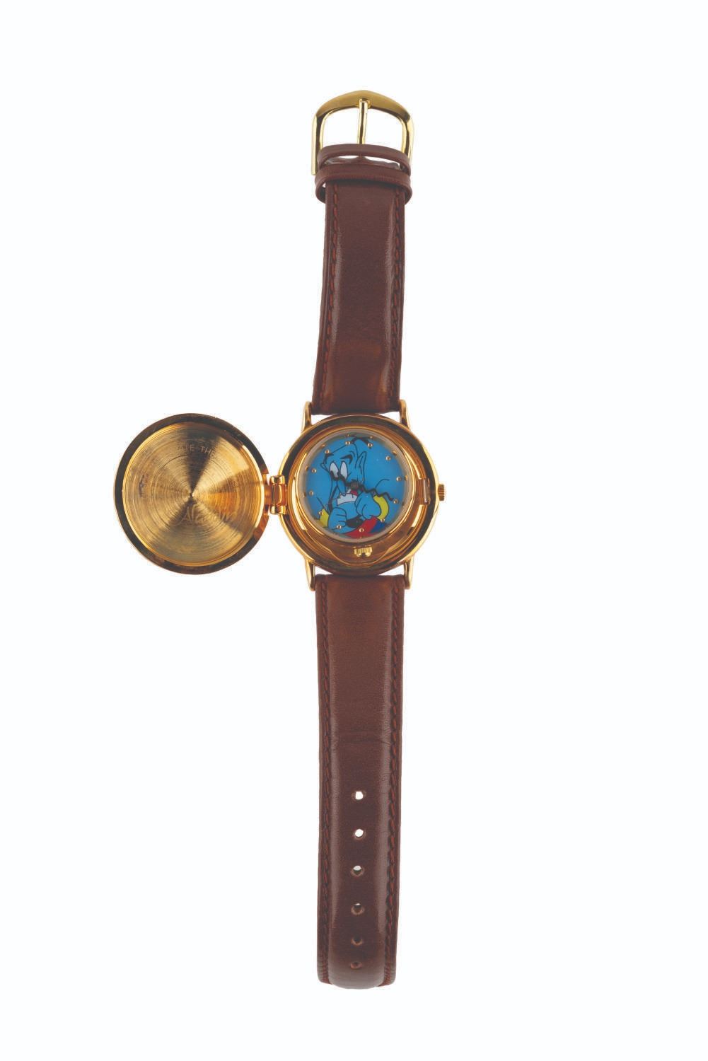 (Disney Store, 1992) A Disney Store-exclusive pop-up genie wristwatch and lamp released in time with the theatrical debut of Disney's "Aladdin." The hinged cover on the watch face pops open to reveal the Genie on a spring-mounted pop-up clock face. The set comes with a metal reproduction of the genie's lamp and the original box. The watch and the 8" x 3" x 4" tall lamp are in fine condition. The watch requires a battery and possibly service to function properly. The box is in fair condition with heavy edge wear and one torn side.
