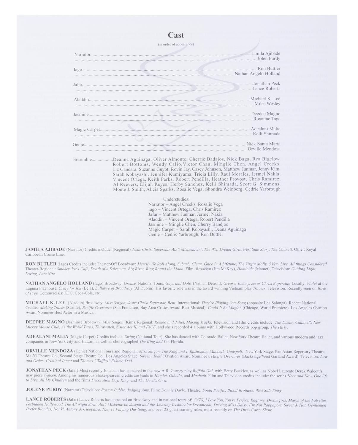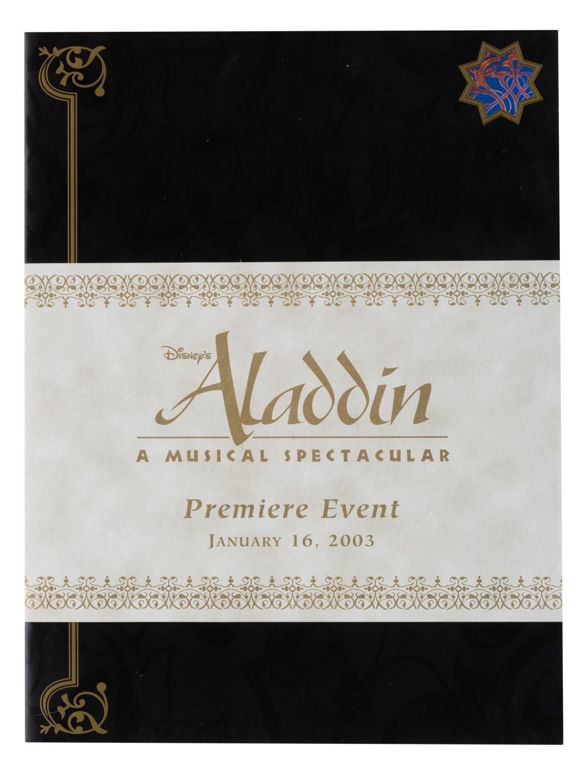 (Disney's California Adventure, 2003) A souvenir program for the Aladdin Musical Spectacular in the Hyperion Theater at Disney's California Adventure, with a cover band and cast list from the premiere on January 16, 2003. Measuring 9" x 12", the program is in very good condition with typical light handling wear, including small creases to the spine.