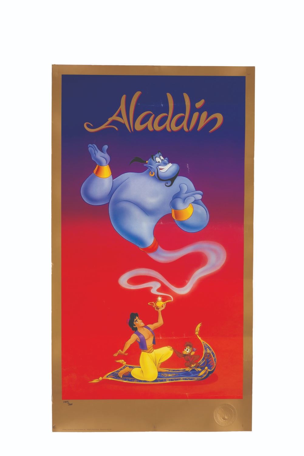 (Disney Art Editions, 1992) A Cast Member-exclusive "Aladdin " poster designed by Ron Dias commemorating the release of the film. Numbered 1987/5000 and measuring 18 " x 33 ", the poster is in fair condition with heavy creasing, edge wear, and spots on the reverse.