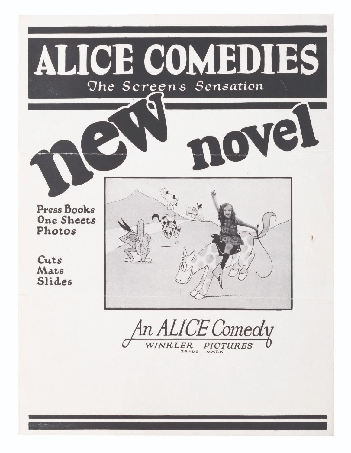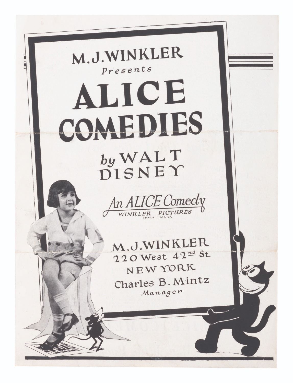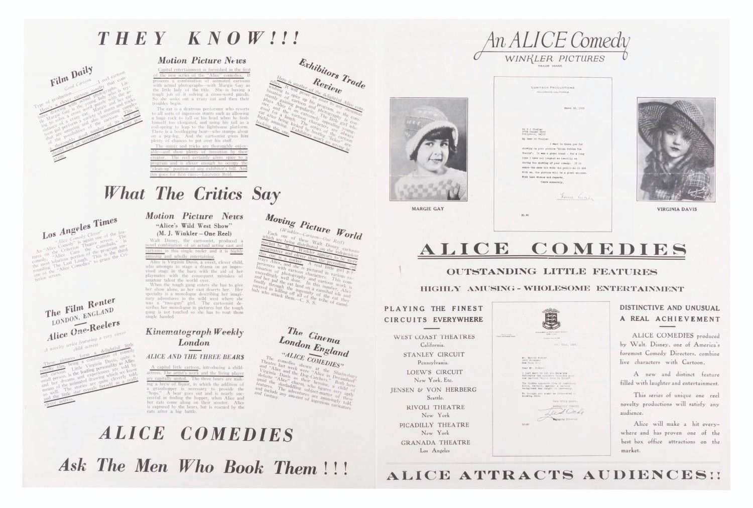 (Winkler, 1920s) A mid-1920s exhibitor program promoting Walt Disney’s Alice Comedies. The single-sheet fold-out features critics reviews and promotes the series stars Margie Gay and Virginia Davis. Measuring 18” x 12” unfolded, the program is in good condition with several creases from being folded and wear from age. From the estate of Carl Stalling.