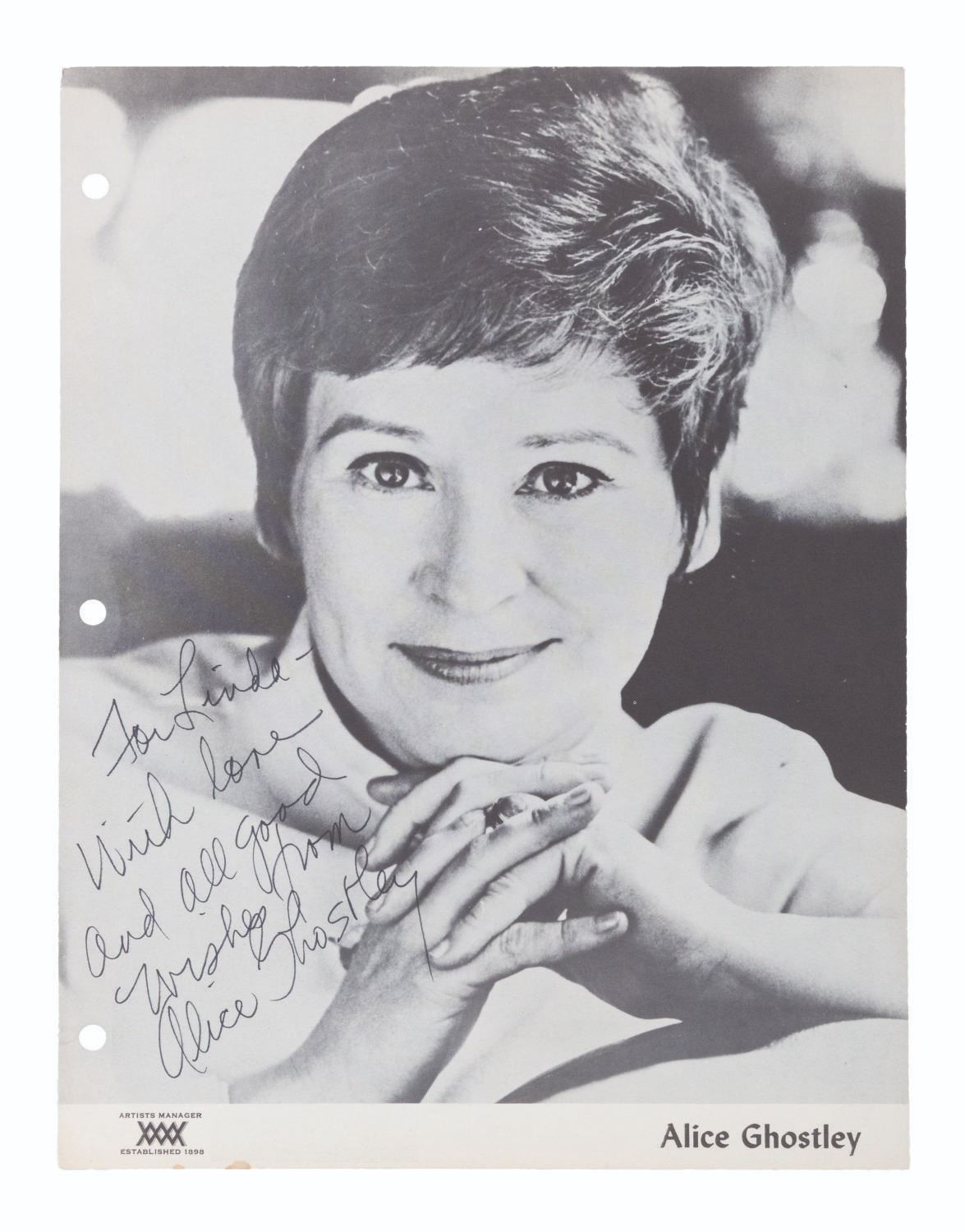 (Ghostley, 1970s-80s) A photo of Alice Ghostley signed with a dedication. Ghostley is best known as the bumbling witch Esmeralda from "Bewitched." Measuring 8.5" x 11", the photo is in good condition with light edge wear, a tiny stain along the left bottom edge, and residue on the reverse from photo album removal.