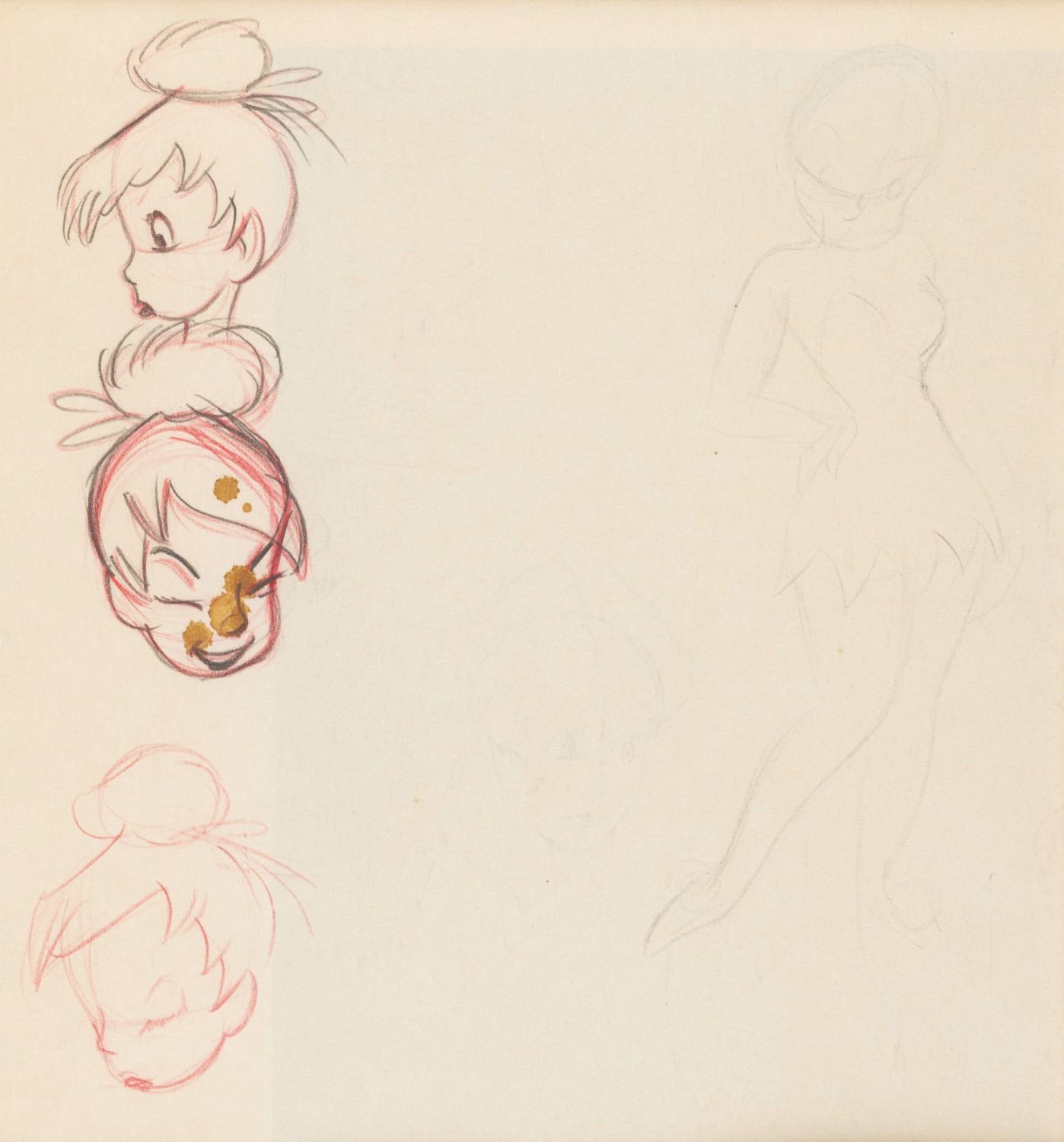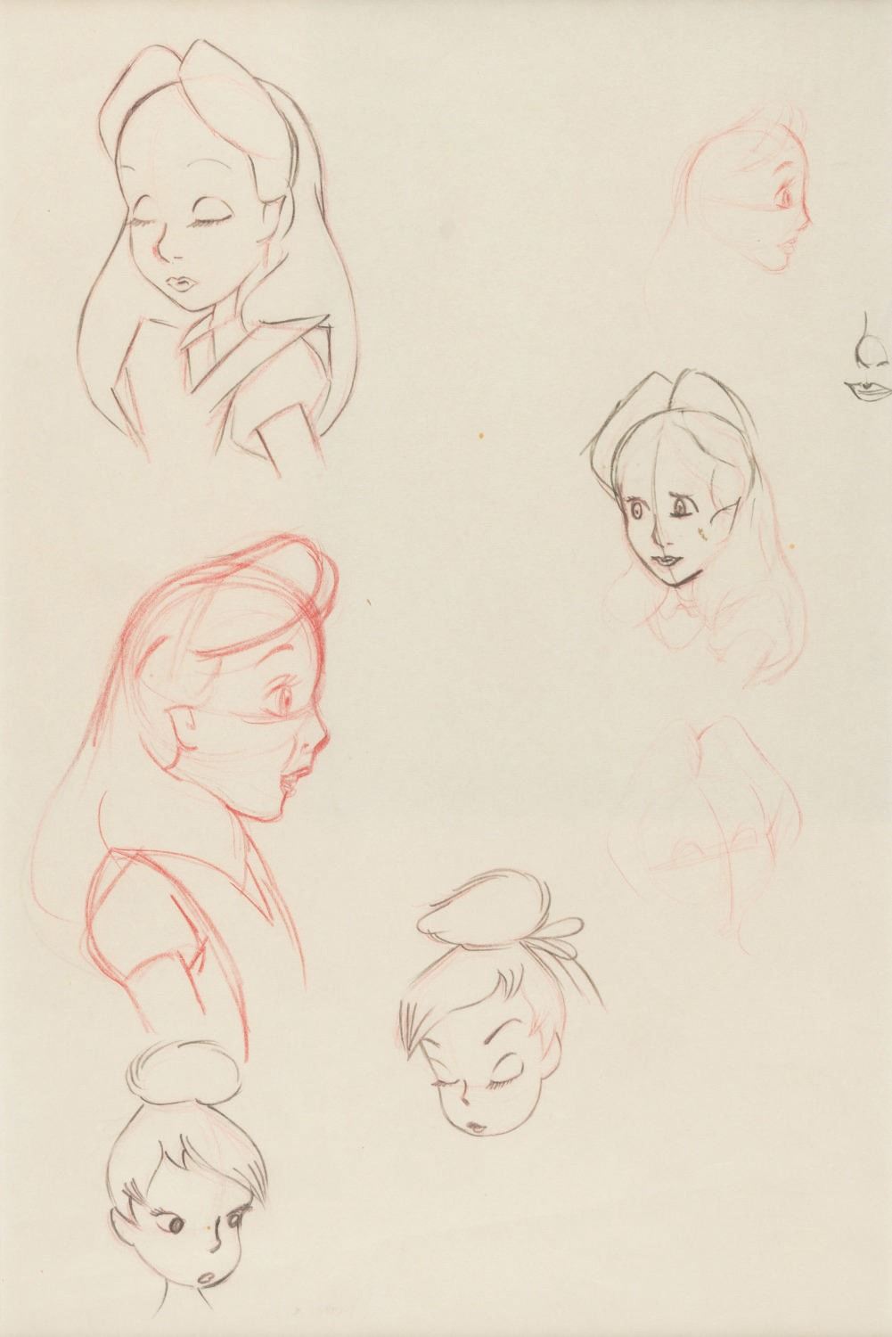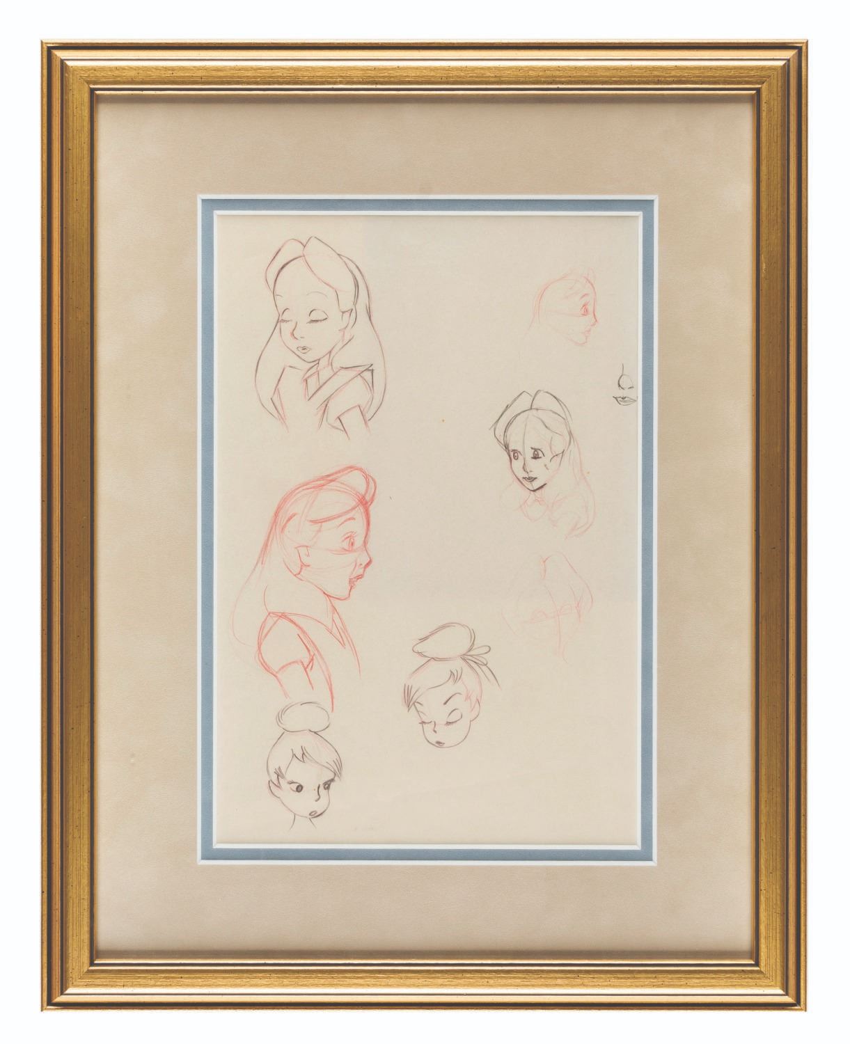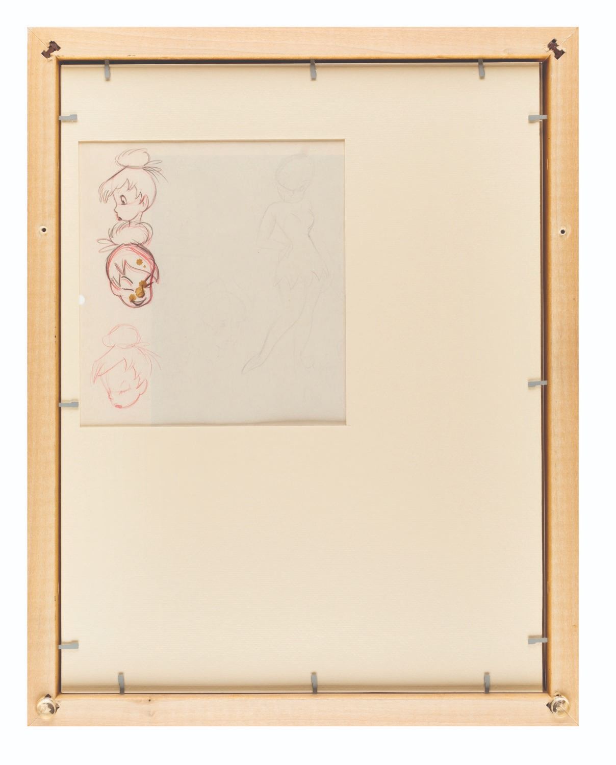 (Disney, 1950s) A sheet of character studies of Alice and Tinker Bell. Accomplished in graphite and colored pencils, the double-sided piece is framed in a way that allows visibility from either side. With image sizes measuring 1.25" x 1.5" to 2.5" x 3.75" in a 7" x 10.5" visible matte, the piece displays in very good condition with water damage to one sketch on the reverse side of the frame.