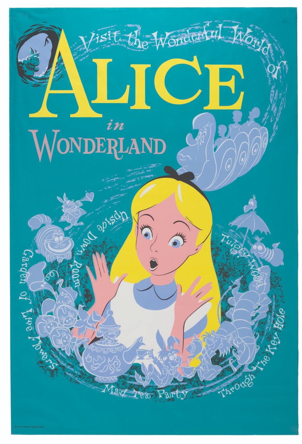 (Disneyland, 1958) An original hand-silkscreened attraction poster for Alice in Wonderland, designed by Disney Legend Sam McKim. Measuring 36" x 54", the poster is in good condition with edge wear, scratches, creases, staple holes, adhesives on the reverse corners, and scuffs, including one below the"L" in"Alice."