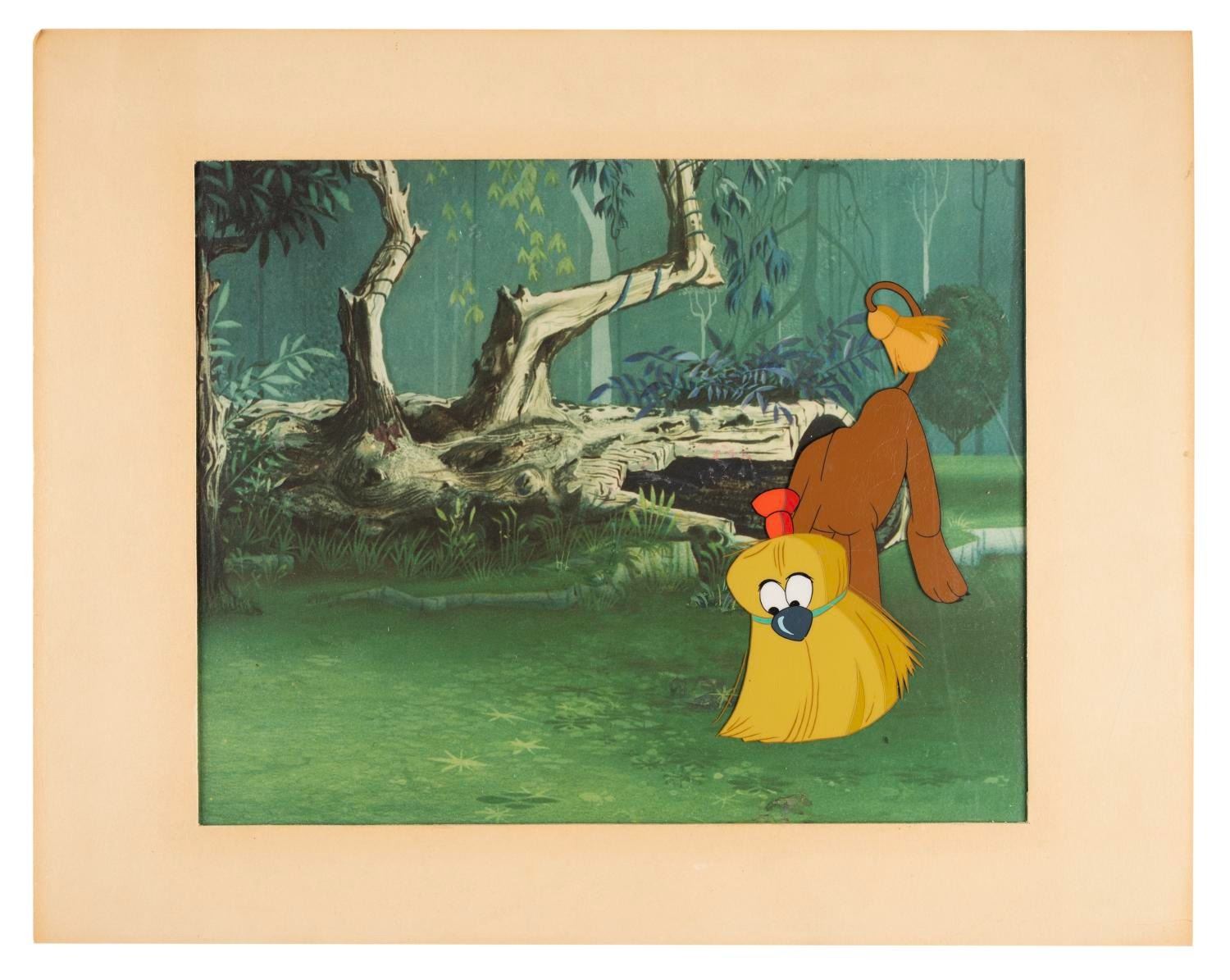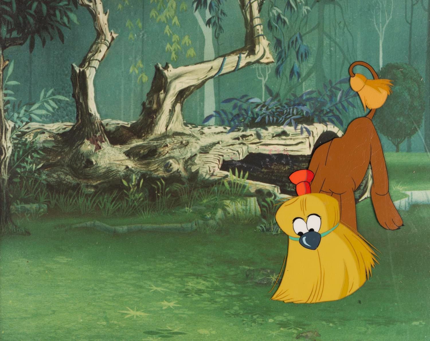 (Disney, 1951) A hand-painted production cel of the Tulgey Wood Broom Dog from “Alice in Wonderland,” presented with a “Sleeping Beauty” forest background reproduction. The production cel was originally sold at The Art Corner at Disneyland and retains the gold sticker of authenticity on the reverse of the matte. With a character image size of 3” x 5.5” on a 10.25” x 12.25” trimmed cel in a 11” x 14” matte, the piece displays in fair condition with wear, scuffs, discoloration from age on the matte, and heavy scratches throughout the cel.
