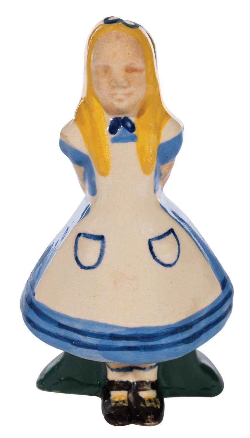 (Brayton Laguna, 1930's) A glazed painted ceramic figurine of Alice by Brayton Laguna Pottery of California. This Alice predates the Disney version of the character by at least ten years. Measuring 6" tall, the figure is in very good condition, with light crazing.