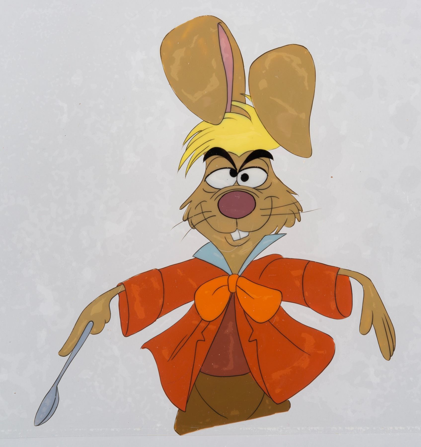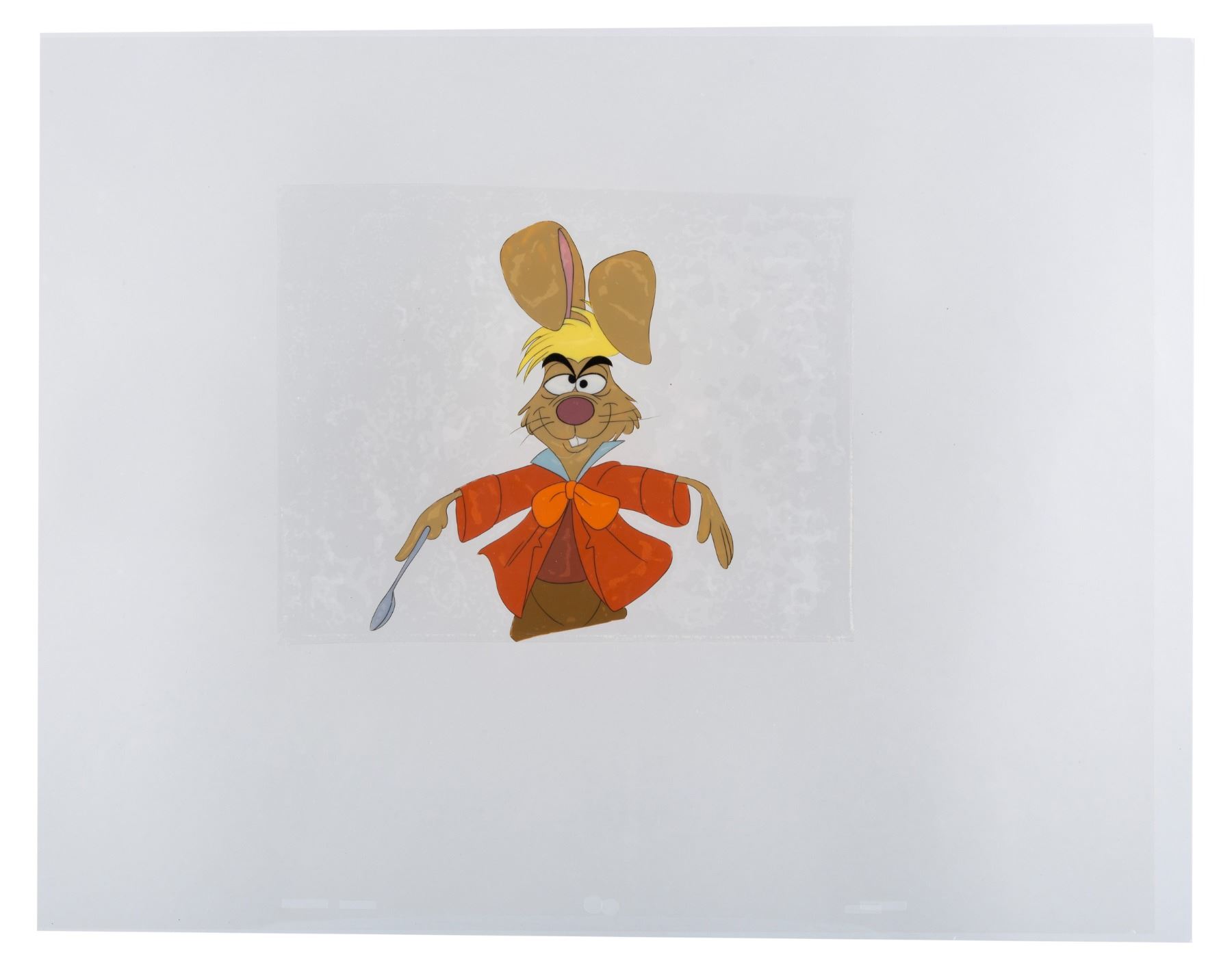 (Disney, 1951) A March Hare original production cel from the animated classic "Alice in Wonderland." With an image size of 5" x 6" on a trimmed 6.25" x 8" cel adhered to a 12" x 16" cel, the art displays in very good condition with light scratches and smudges.