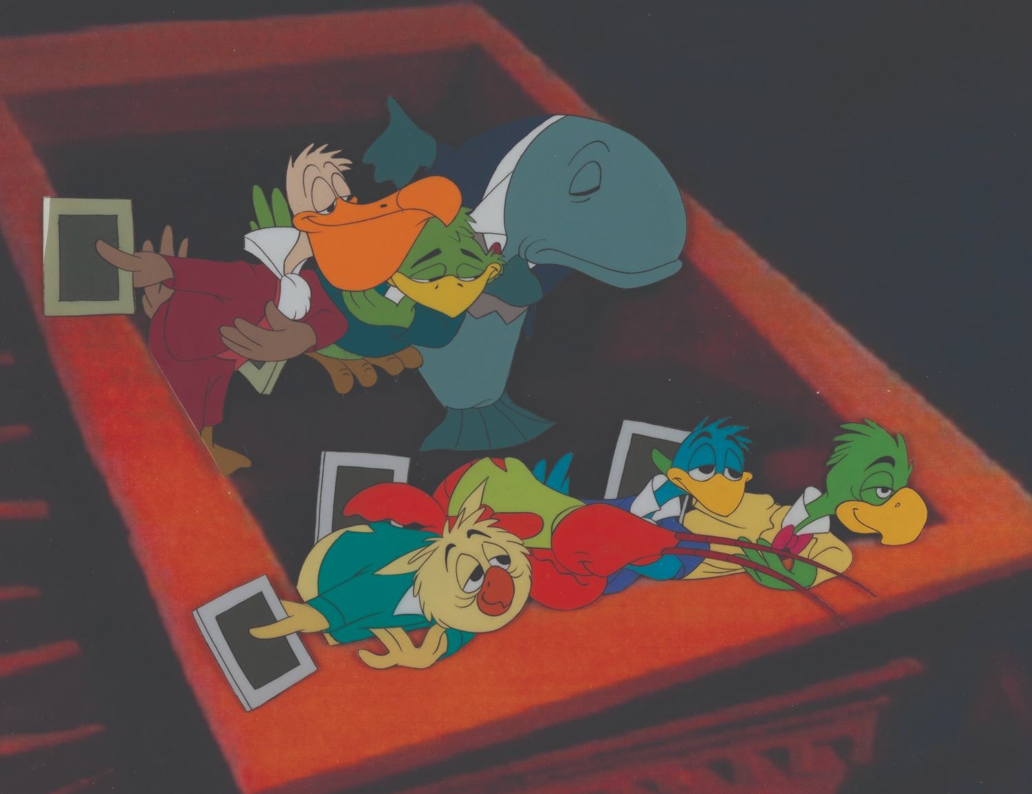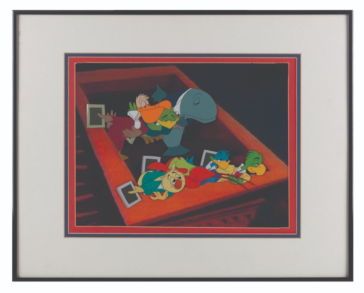 (Disney, 1951) An original production cel of the animal jury at Alice’s trial from "Alice in Wonderland,” with a color copy background. The characters have an image size of 7.5” x 10.5” trimmed to character on a 9.75” x 12.5” visible background. The entire framed and matted piece measures 16.25” x 20.25”. The cel displays in fine condition. The framed matte is in very good condition with light wear to the inner matte.