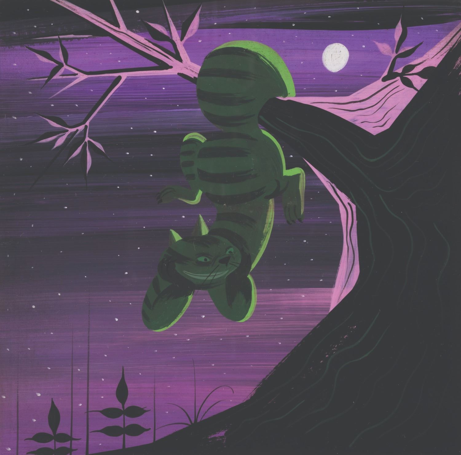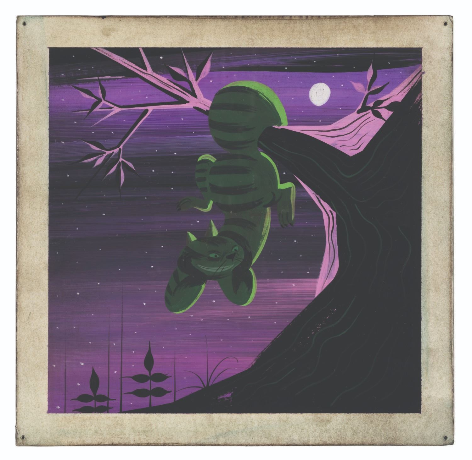 (Disney, 1951) An original concept painting of the Cheshire Cat for "Alice in Wonderland" by Disney Legend Mary Blair. Blair had an immeasurable and invaluable influence on many of the animated films produced by Walt Disney in the 1940s and 50s, including “Cinderella” and "Alice in Wonderland.” Her stylistic brilliance and sophisticated technique are on full display here depicting the Cheshire Cat mischievously hanging from a tree branch in the dark Tulgey Woods. Accomplished in gouache, the piece has a painted image size of 7.5" x 7.5" on an artist's board measuring 9" x 9" and displays in fine condition with pin holes in the corners and light wear to the edges from age.