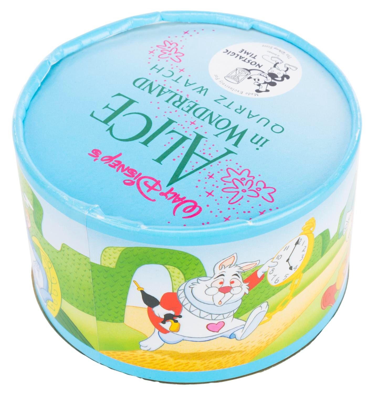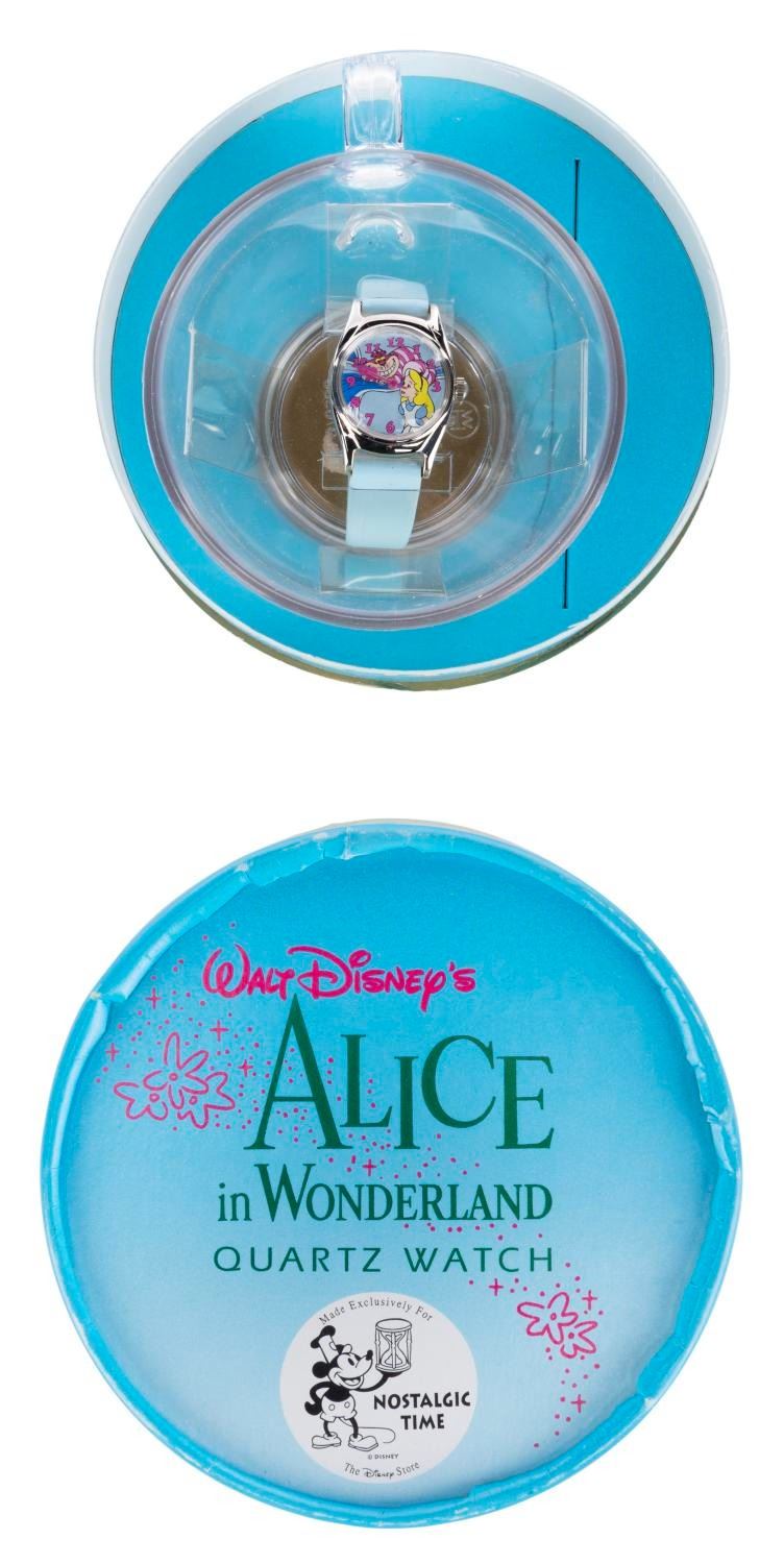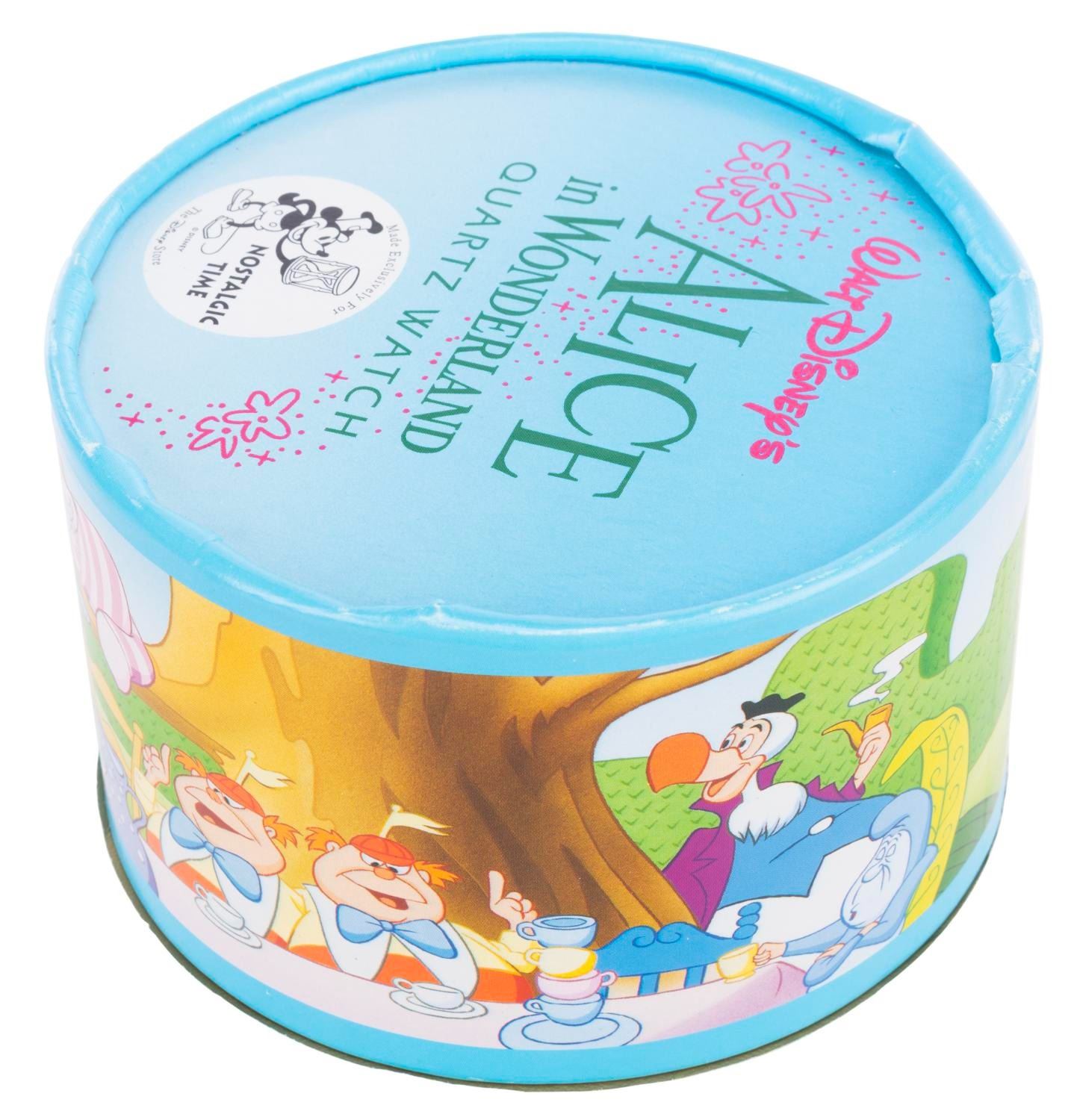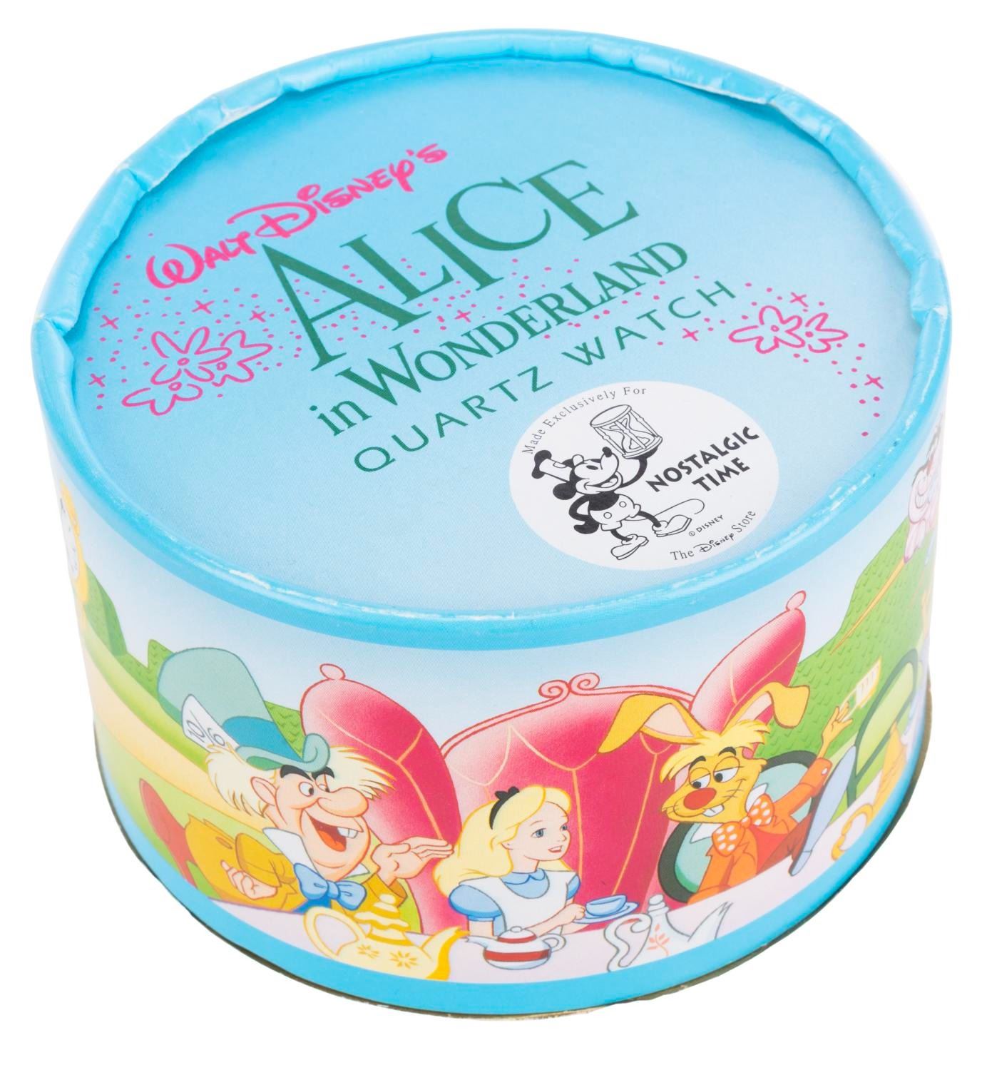 (Disney, 1990s) An "Alice in Wonderland" quartz watch, part of The Disney Store's Nostalgic Time collection, displayed in a plastic teacup. The watch did not work when tested, likely requiring repair or a new battery. The watch comes with its original case and is in very good condition with light wear.
