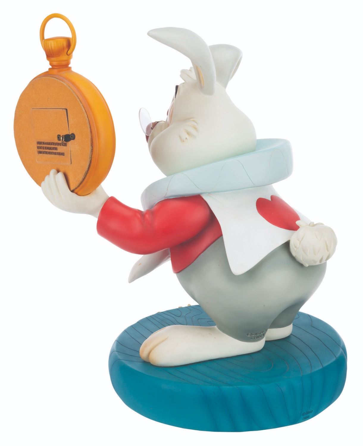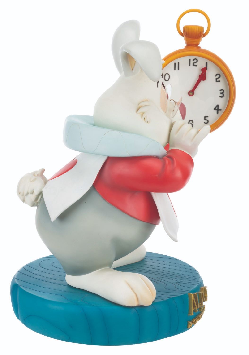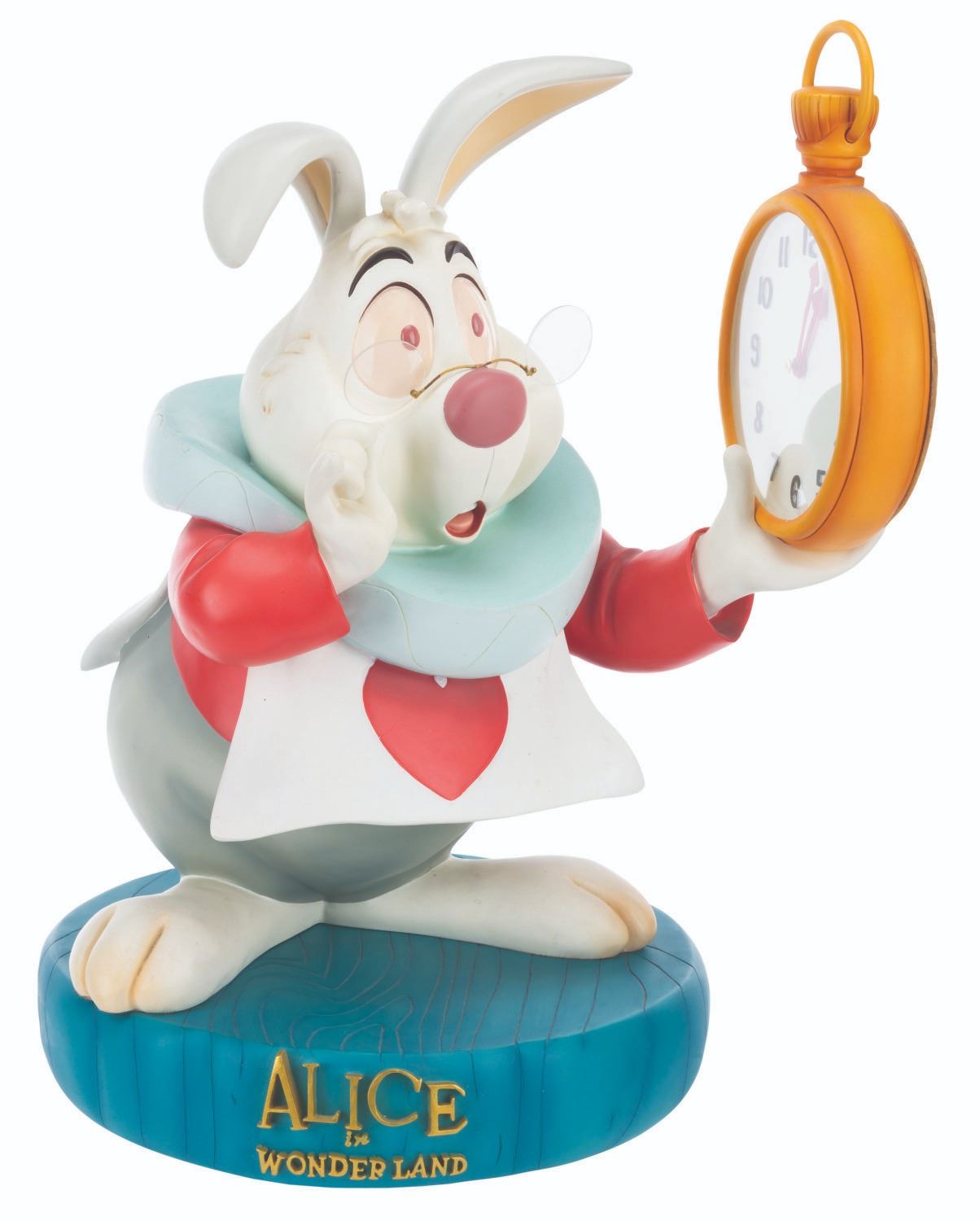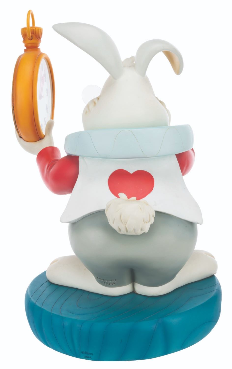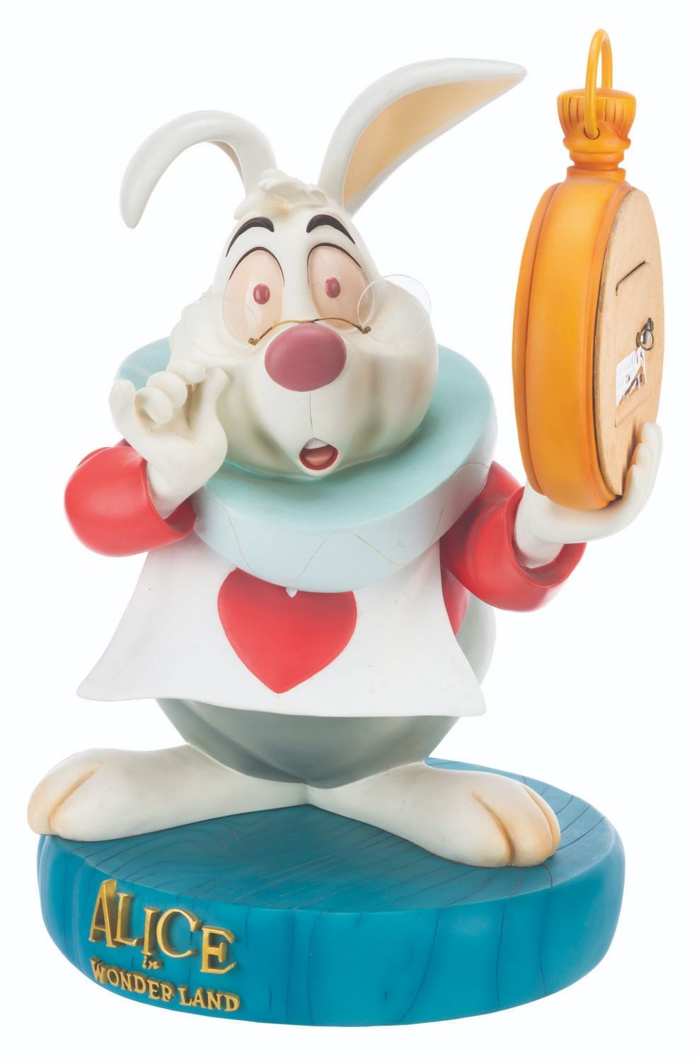(Disney, 2001) A Big Fig of the White Rabbit, released for the 50th anniversary of"Alice in Wonderland." This first Big Fig designed by Kevin Kidney, has a pocket watch that functions as a real clock. The clock worked when tested and required one AA battery (not included). Measuring 19" tall and 12" in diameter, the Big Fig displays in very good condition with light stains, scratches, discoloration, and wear.