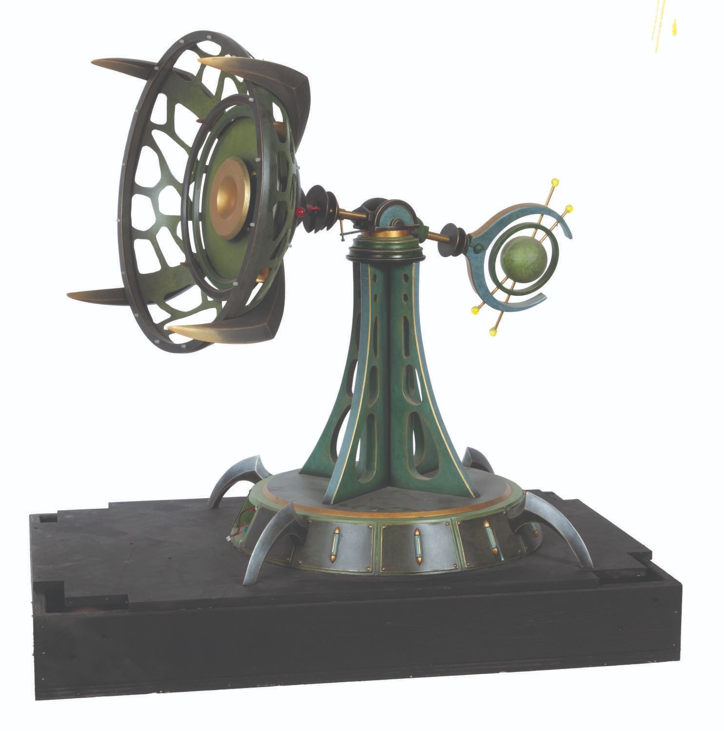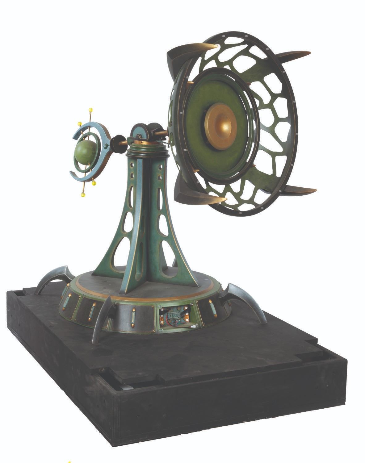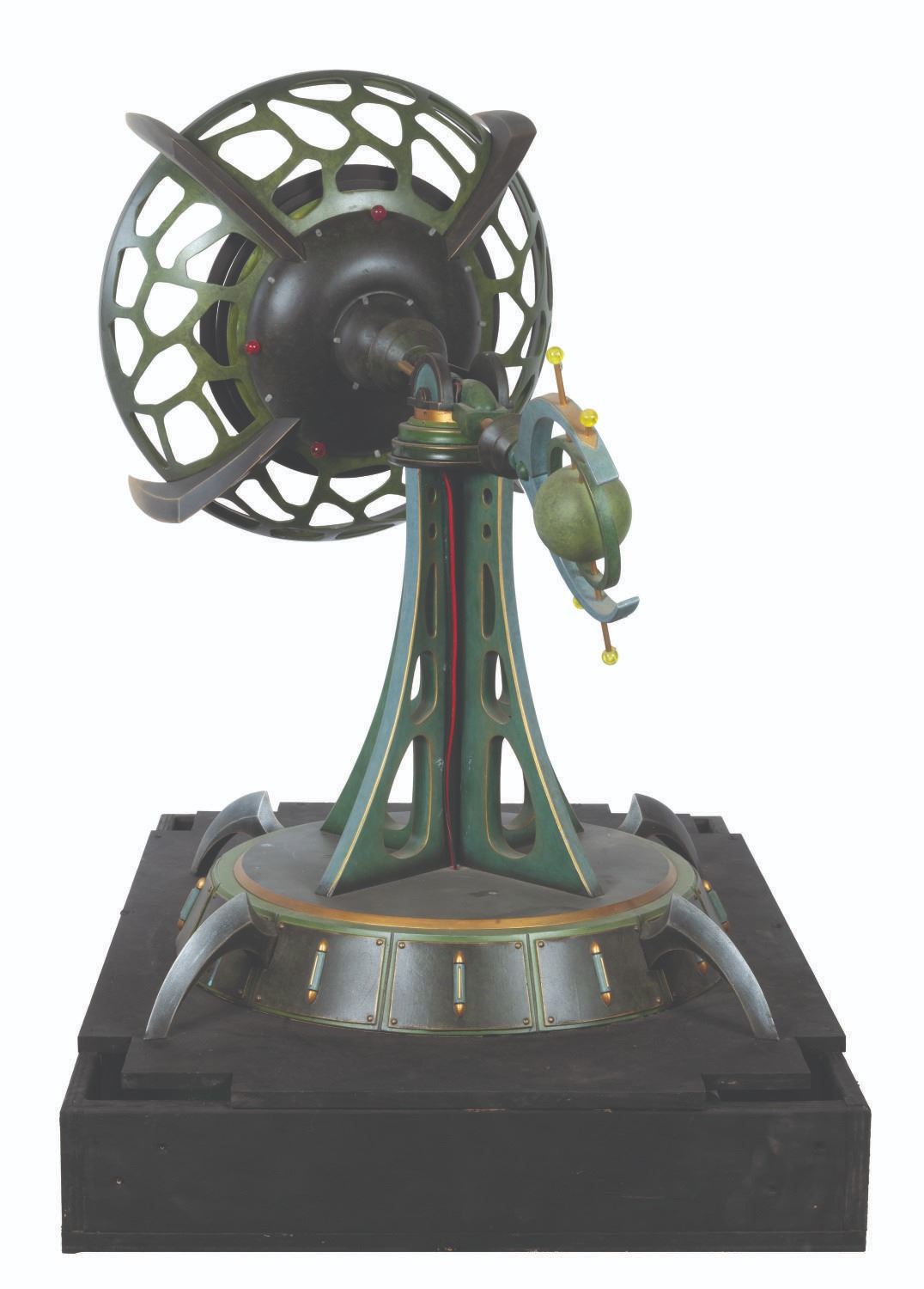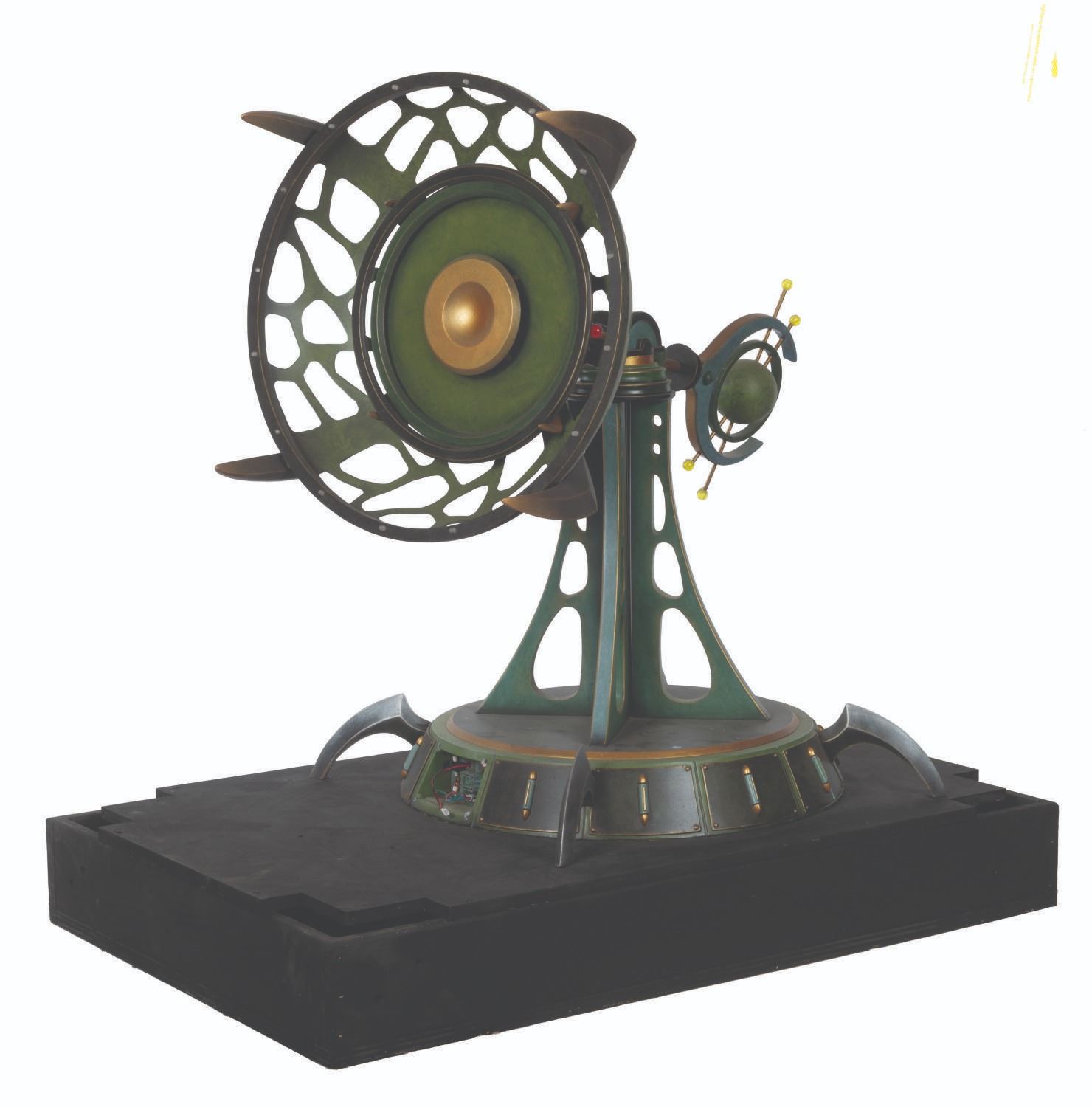 (Netflix, 2020) A Gyrotron prop from “Alien Xmas.” This is the device built by X at the North Pole to eliminate Earth's gravity, allowing the Kelpt aliens to collect all of the planet’s valuables as it floats into orbit. Measuring 28.25” x 9.25” x 29.75” and 35” tall mounted to a base, the Gyrotron is in very good condition with light wear from production use. This item requires special shipping arrangements. Please inquire before bidding.