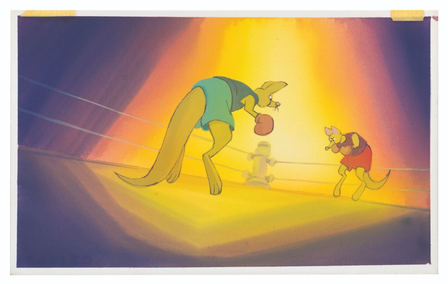 (Bluth, 1989) A color key concept painting of kangaroos boxing for the Don Bluth Studios film"All Dogs Go to Heaven." Color keys are preliminary paintings created to establish the color palette, style, and emotional tone of the scene. Measuring 5" x 8.25", the artwork is in very good condition with light spots of paint and line loss.
