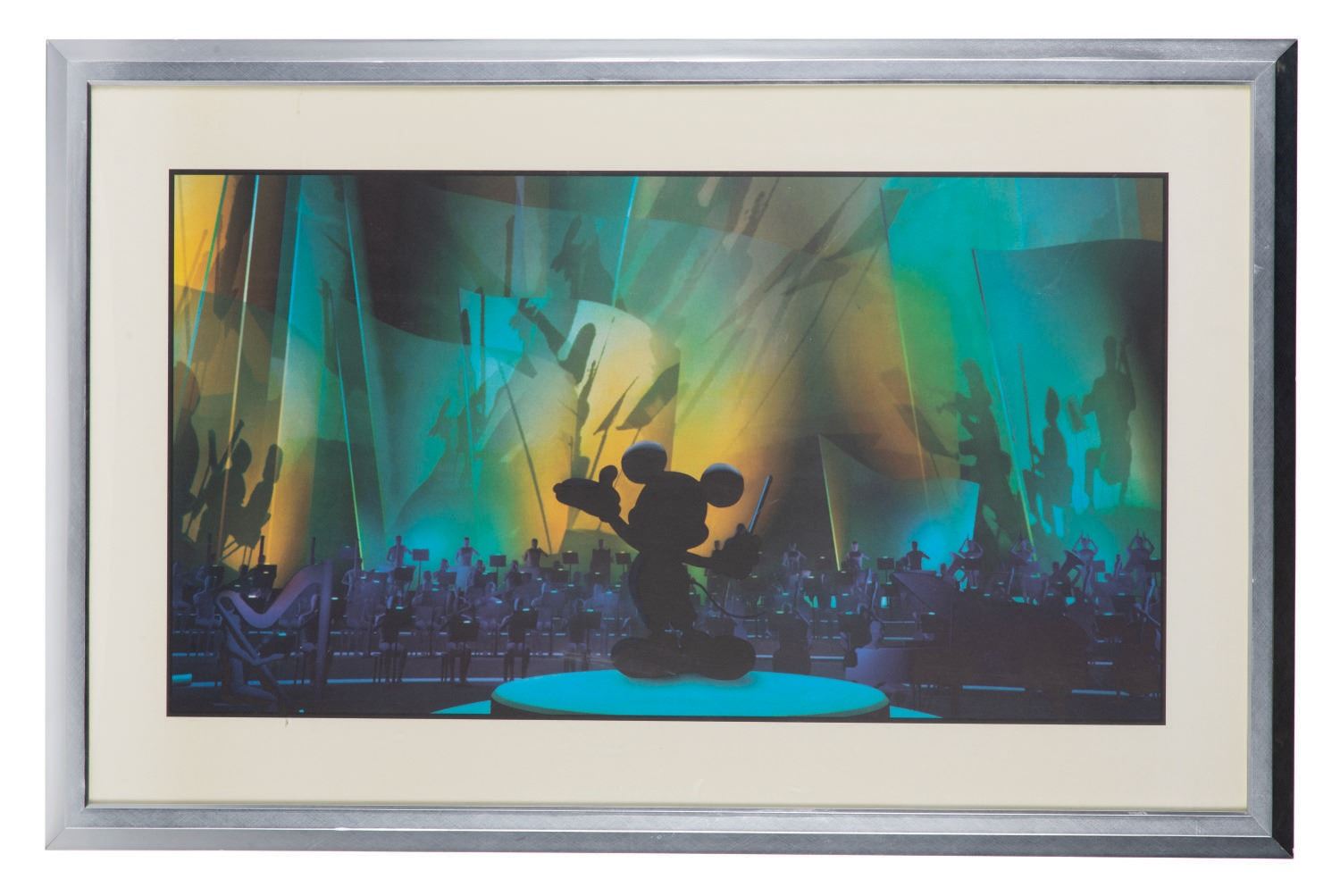 (Disney's All-Star Resort, 1990s-2000s) A large print of Mickey Mouse conducting an orchestra, created as room decor for Disney's All-Star Resort at Walt Disney World. The artwork has an image size of 32"x17.5" and is still in its original 40.25"x26.25" frame. The piece is in very fine condition, with the frame in very good condition showing some wear from display.