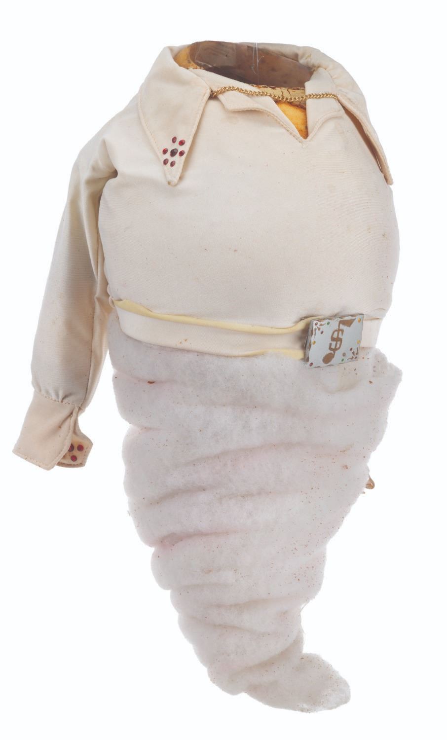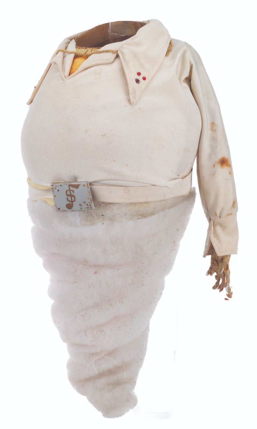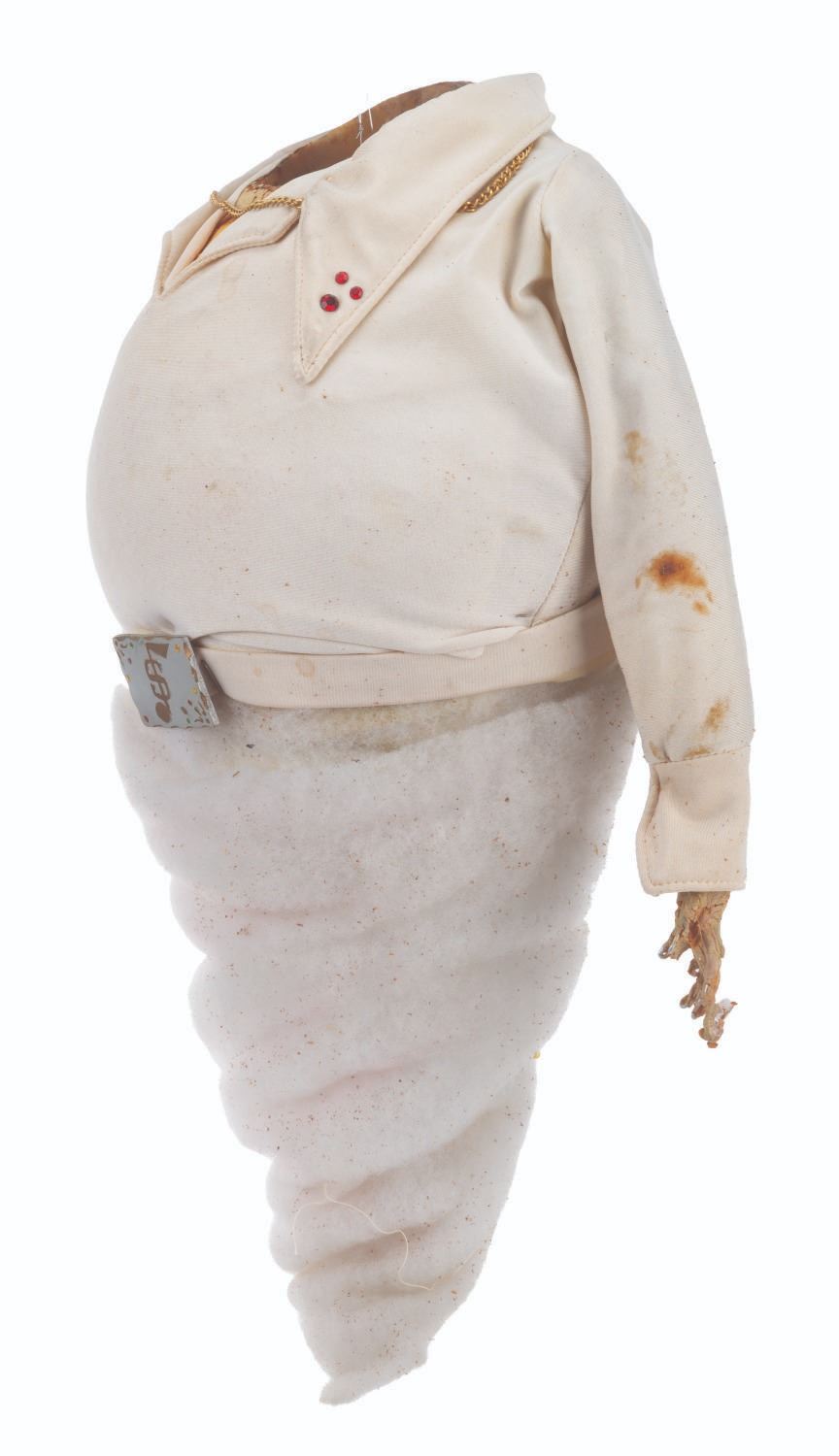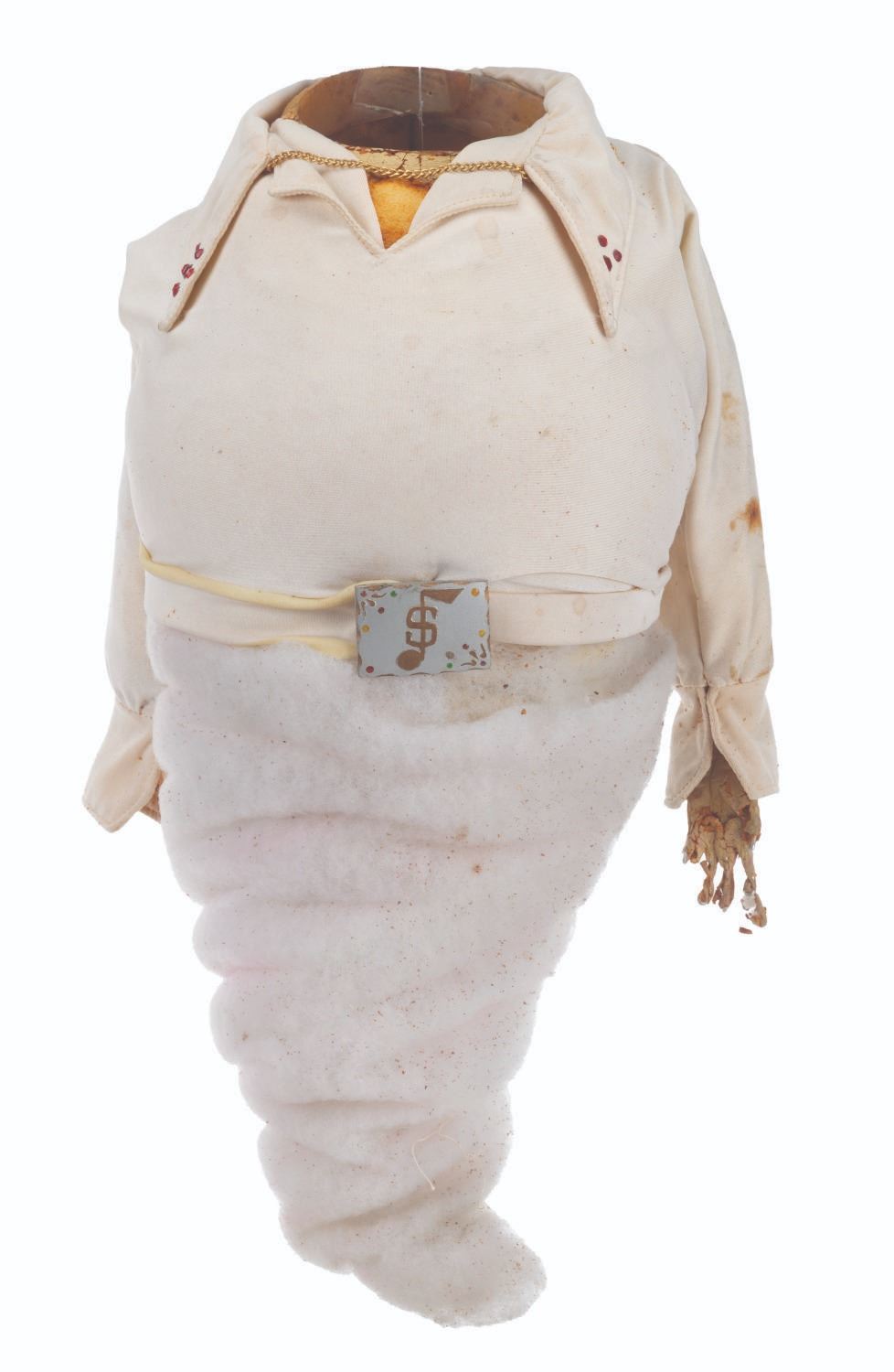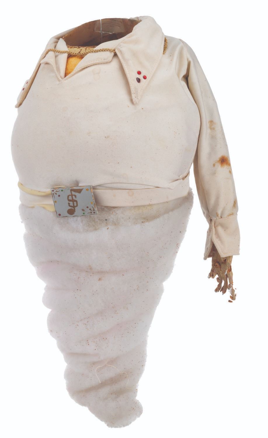 (CBS, 1992) An original handcrafted Elvis ghost puppet body from the live-action television series"The Amazing Live Sea Monkeys." At the end of the episode"Haunted Lighthouse," this ghost of Elvis Presley appears, scares off the bad guys, and asks for a cheeseburger. The ghost's head is not included in this lot. Measuring 18.5" tall and 8" in diameter, the puppet body displays in fair condition with heavy material loss throughout, the right arm detached, and wear from production use.