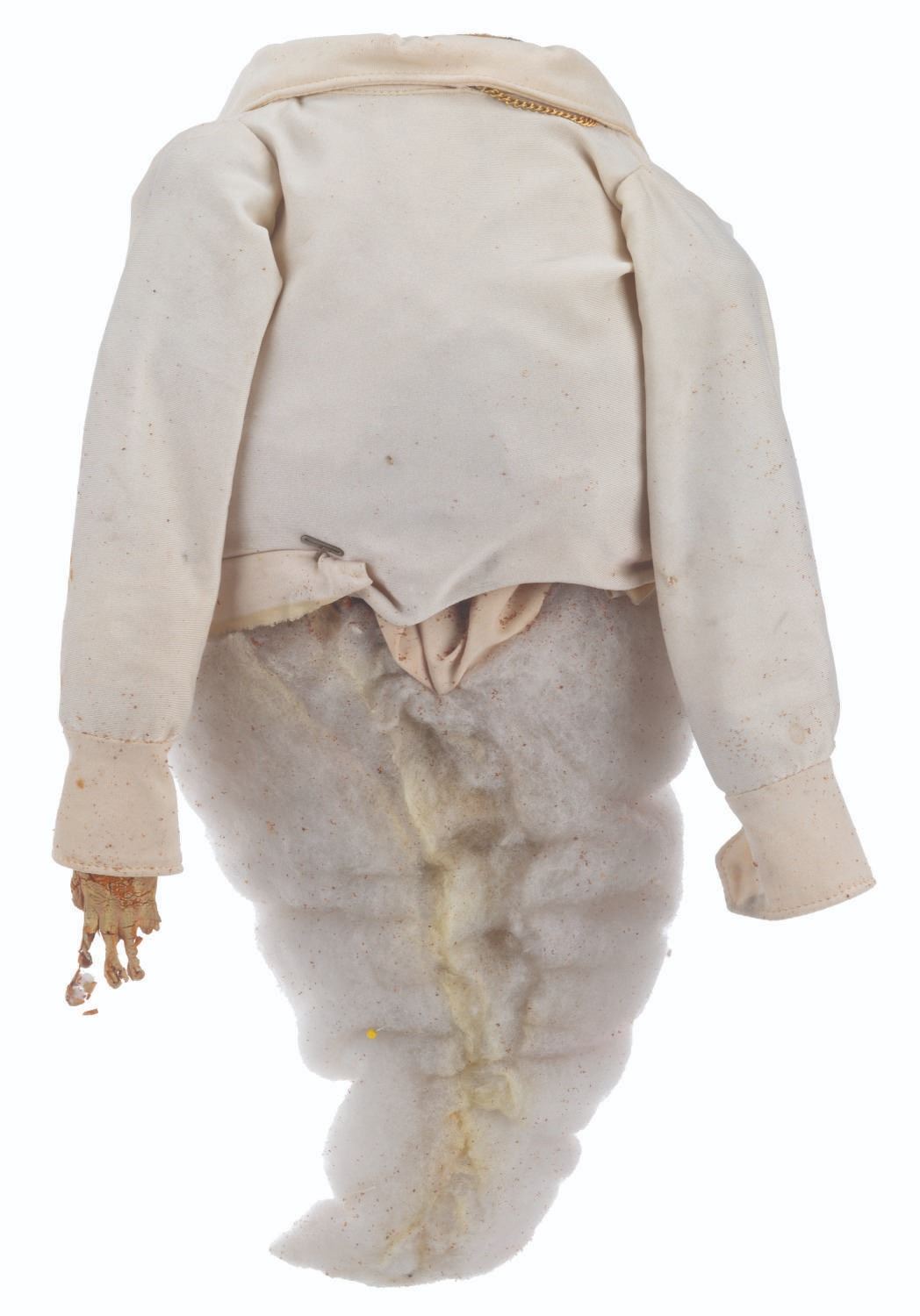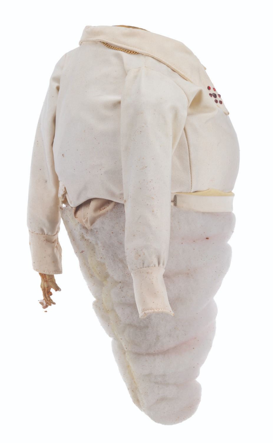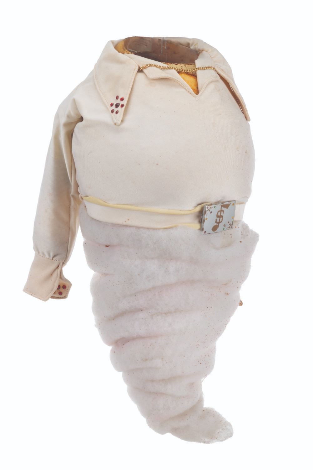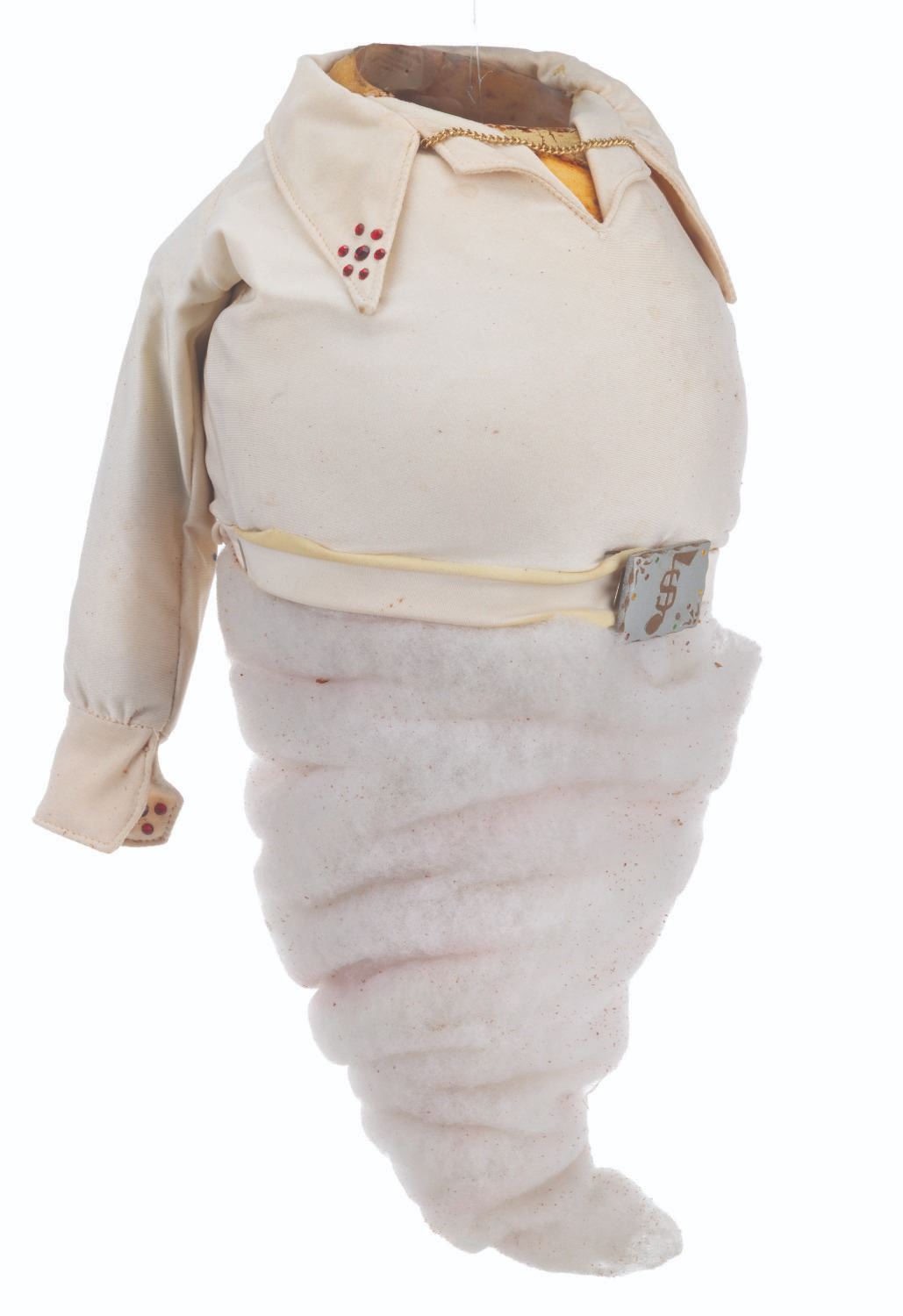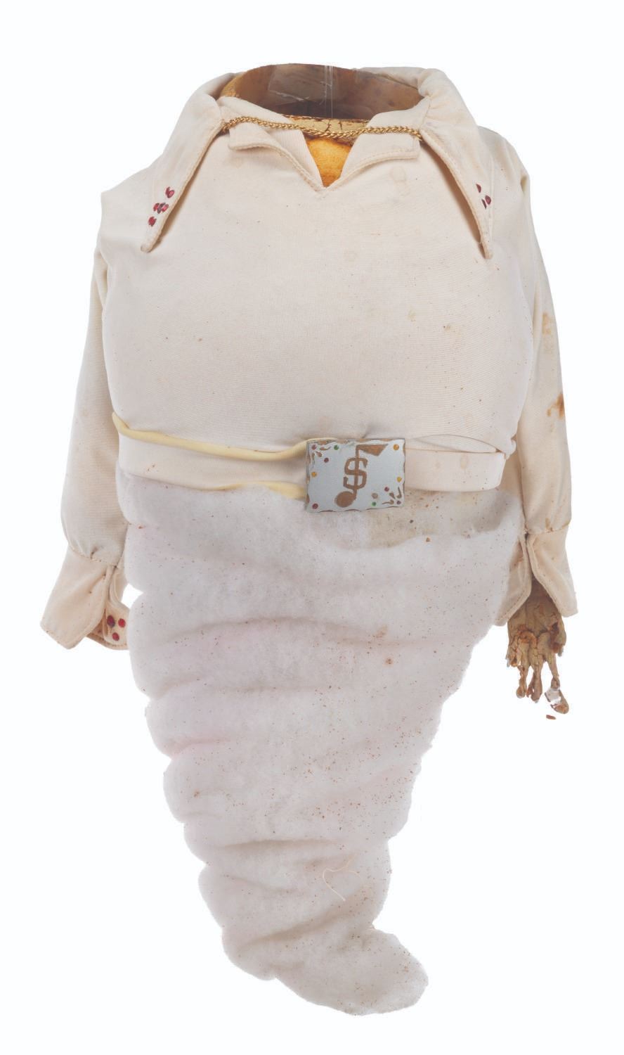 (CBS, 1992) An original handcrafted Elvis ghost puppet body from the live-action television series"The Amazing Live Sea Monkeys." At the end of the episode"Haunted Lighthouse," this ghost of Elvis Presley appears, scares off the bad guys, and asks for a cheeseburger. The ghost's head is not included in this lot. Measuring 18.5" tall and 8" in diameter, the puppet body displays in fair condition with heavy material loss throughout, the right arm detached, and wear from production use.
