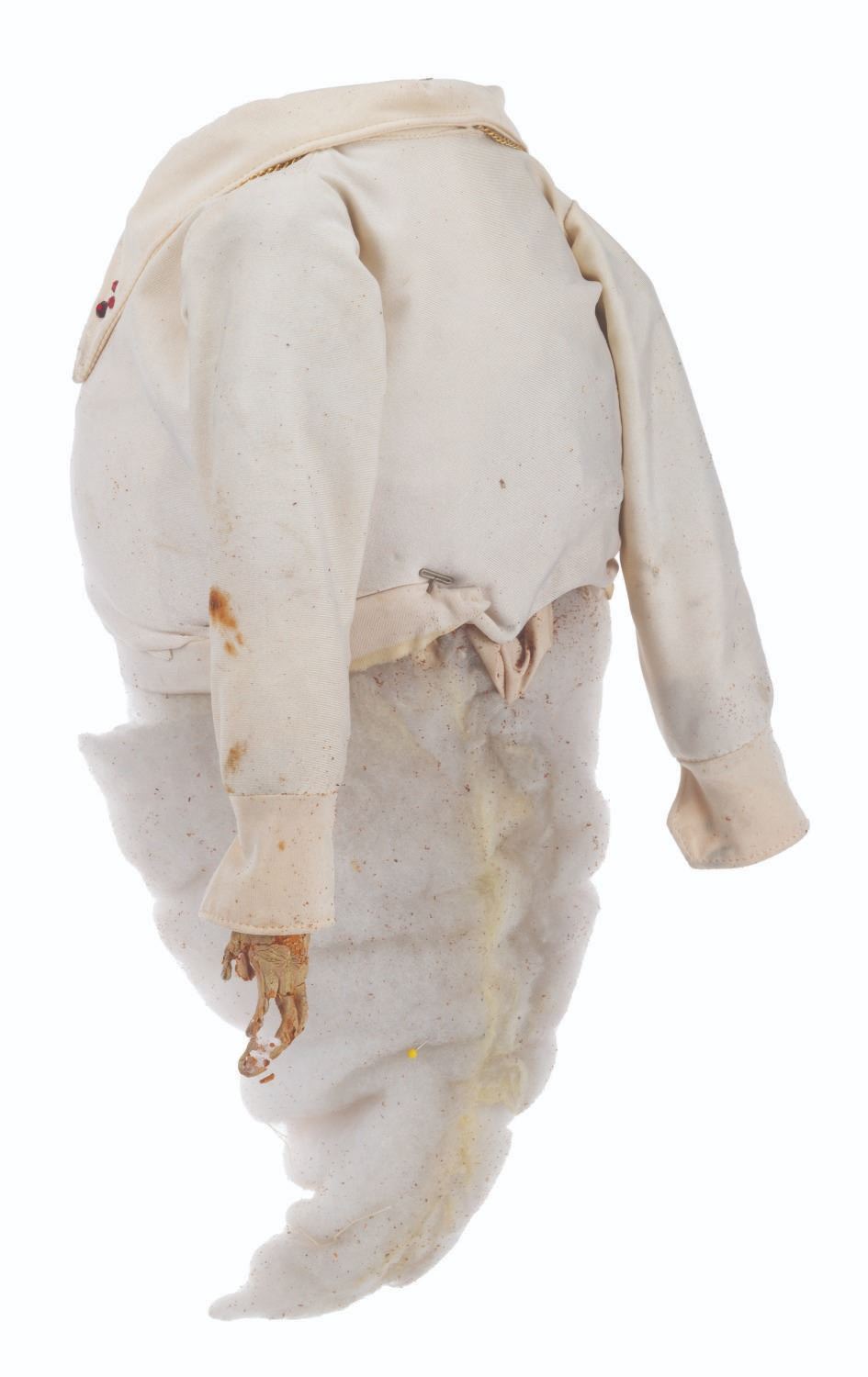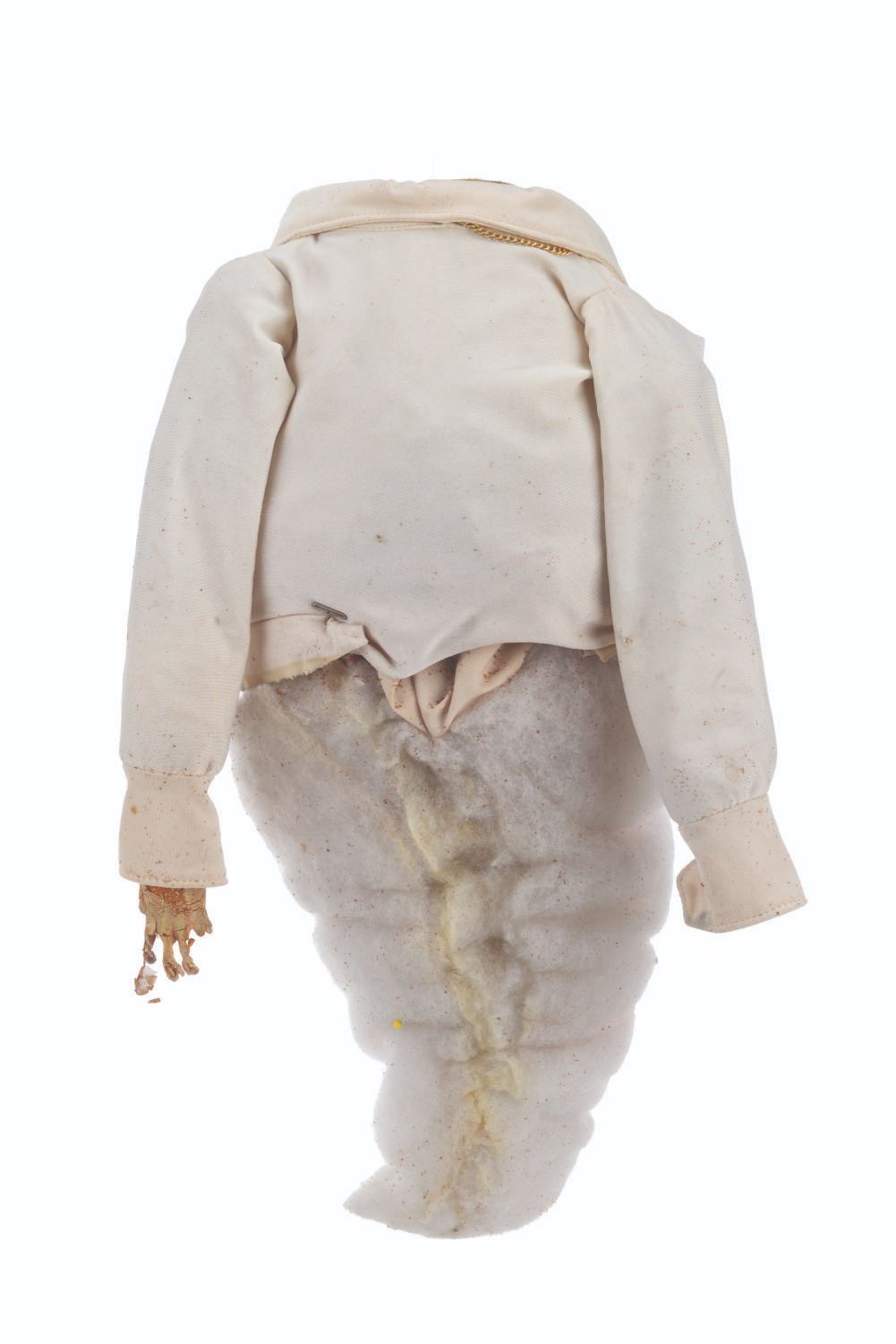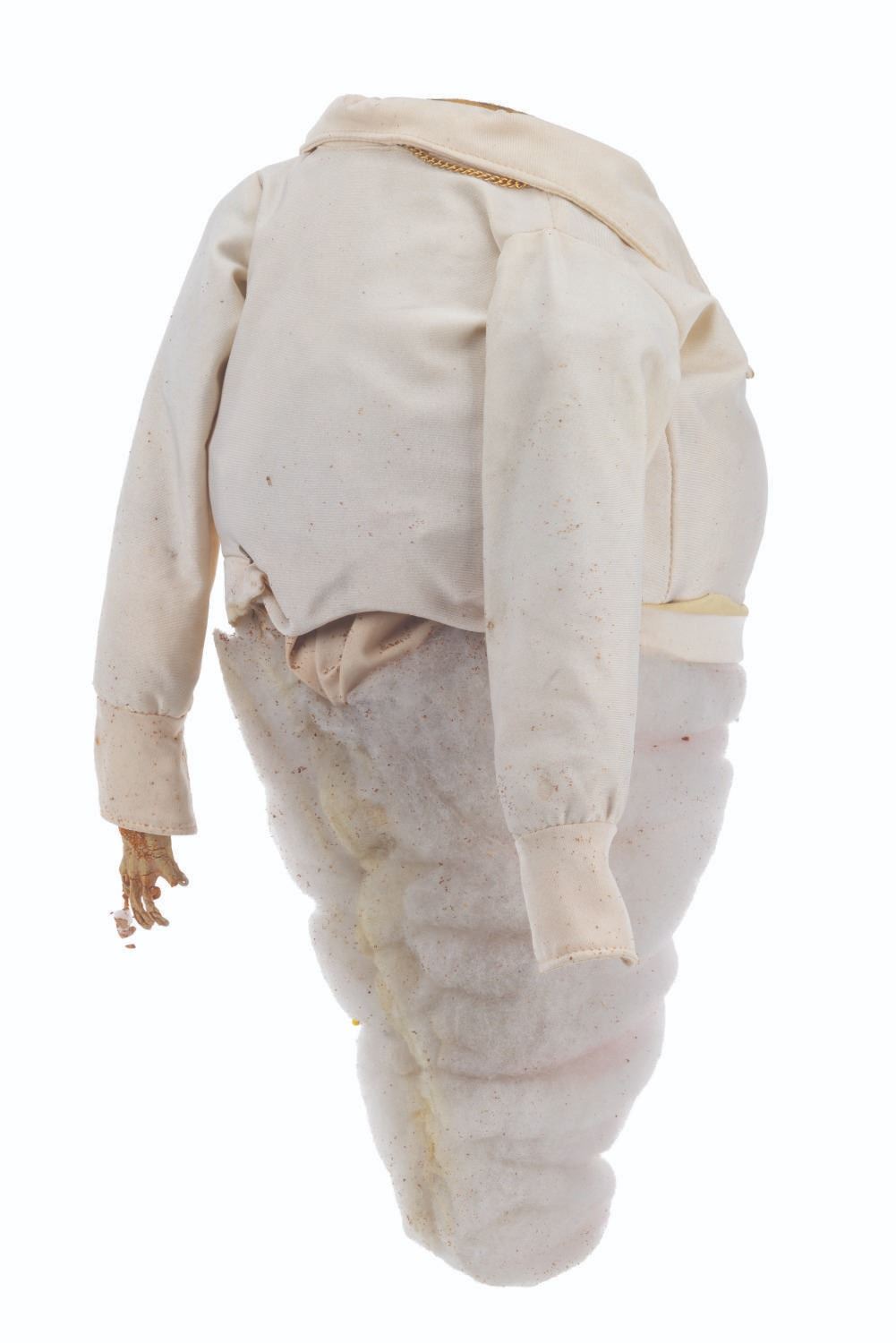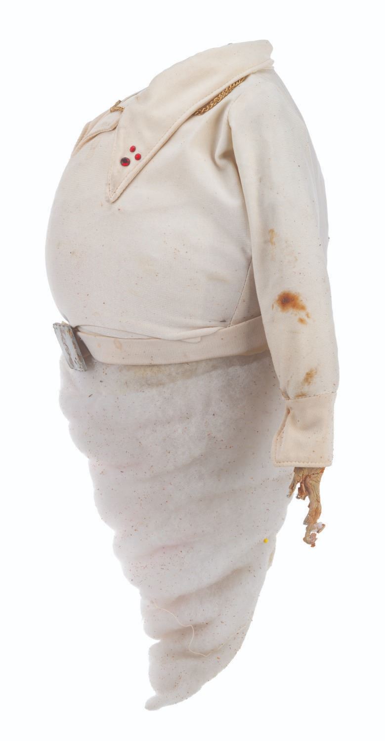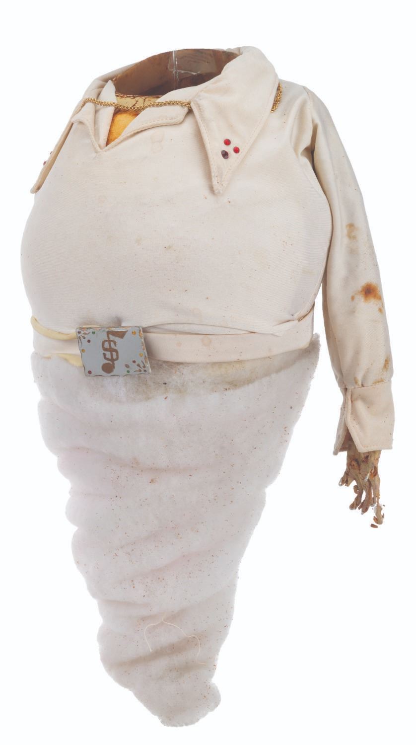 (CBS, 1992) An original handcrafted Elvis ghost puppet body from the live-action television series"The Amazing Live Sea Monkeys." At the end of the episode"Haunted Lighthouse," this ghost of Elvis Presley appears, scares off the bad guys, and asks for a cheeseburger. The ghost's head is not included in this lot. Measuring 18.5" tall and 8" in diameter, the puppet body displays in fair condition with heavy material loss throughout, the right arm detached, and wear from production use.