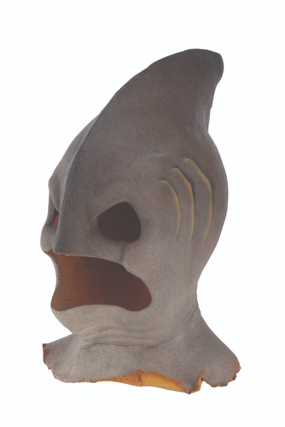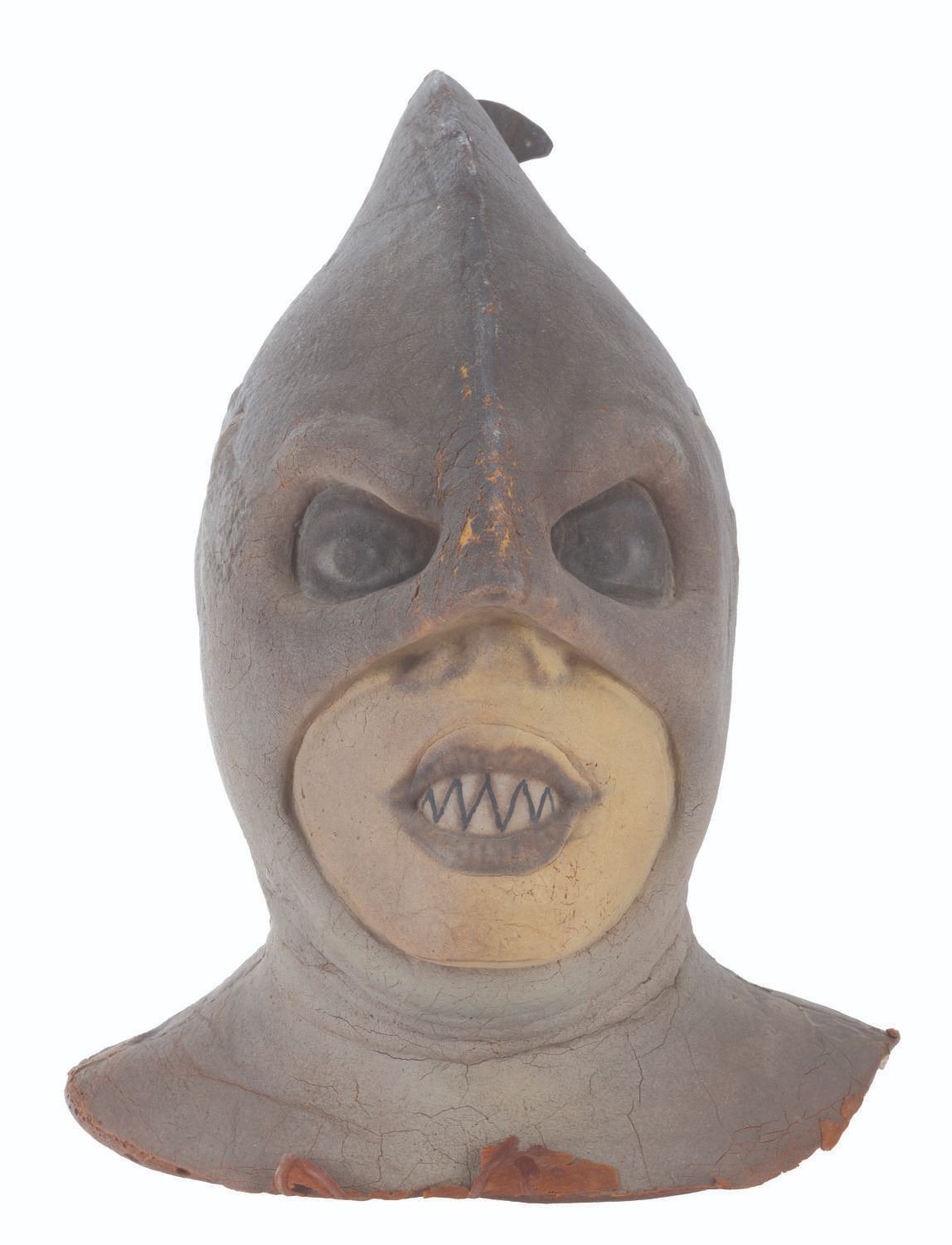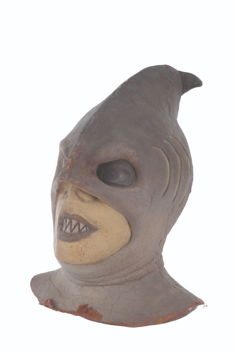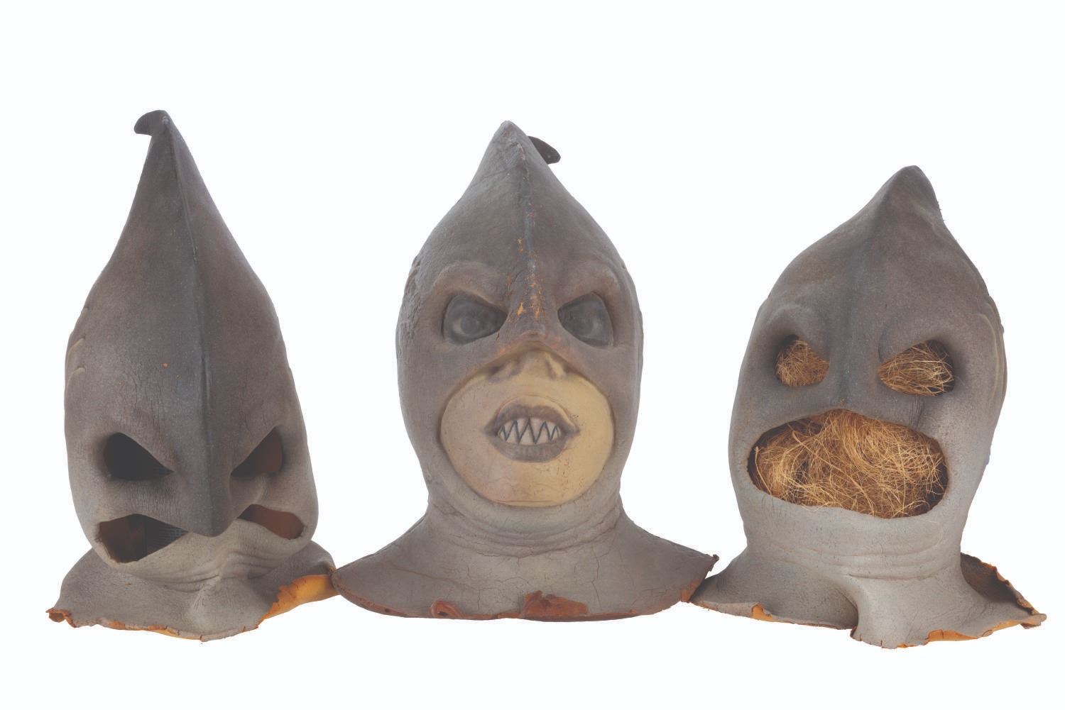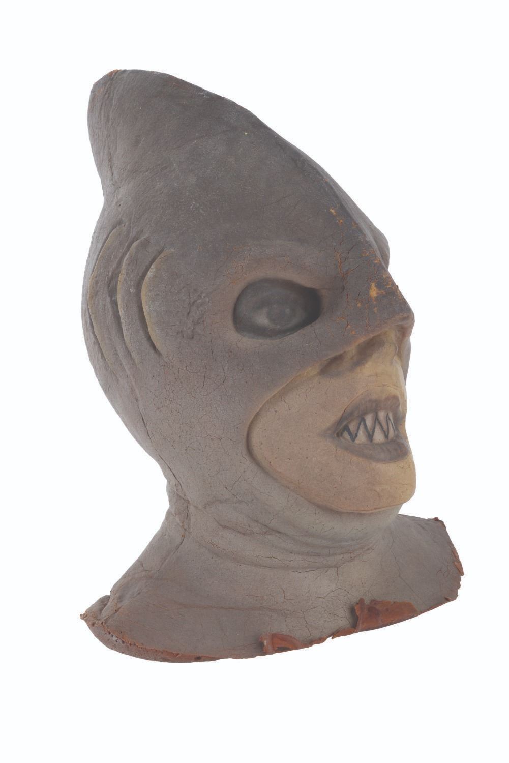 (CBS, 1992) A three-part head prosthetic collection for The Shark Guy from"The Amazing Live Sea Monkeys." The villain appeared in the episode "Top Secret," played by actor Vernon Wells, known for "The Road Warrior" and "Commando." Included are two hand-painted foam Shark Guy cowls that would fit over the performer's head and one full-head representation of what the cowl would look like on the performer. Also included are a handful of foam prosthetic face parts that would be attached to the performer's face while in the cowl. Measuring 12" x 15" x 15" tall, the prosthetics are in fair to good condition with the cowls exhibiting light paint loss and edge wear, and the full head in fair condition with extreme foam brittleness and paint cracking.