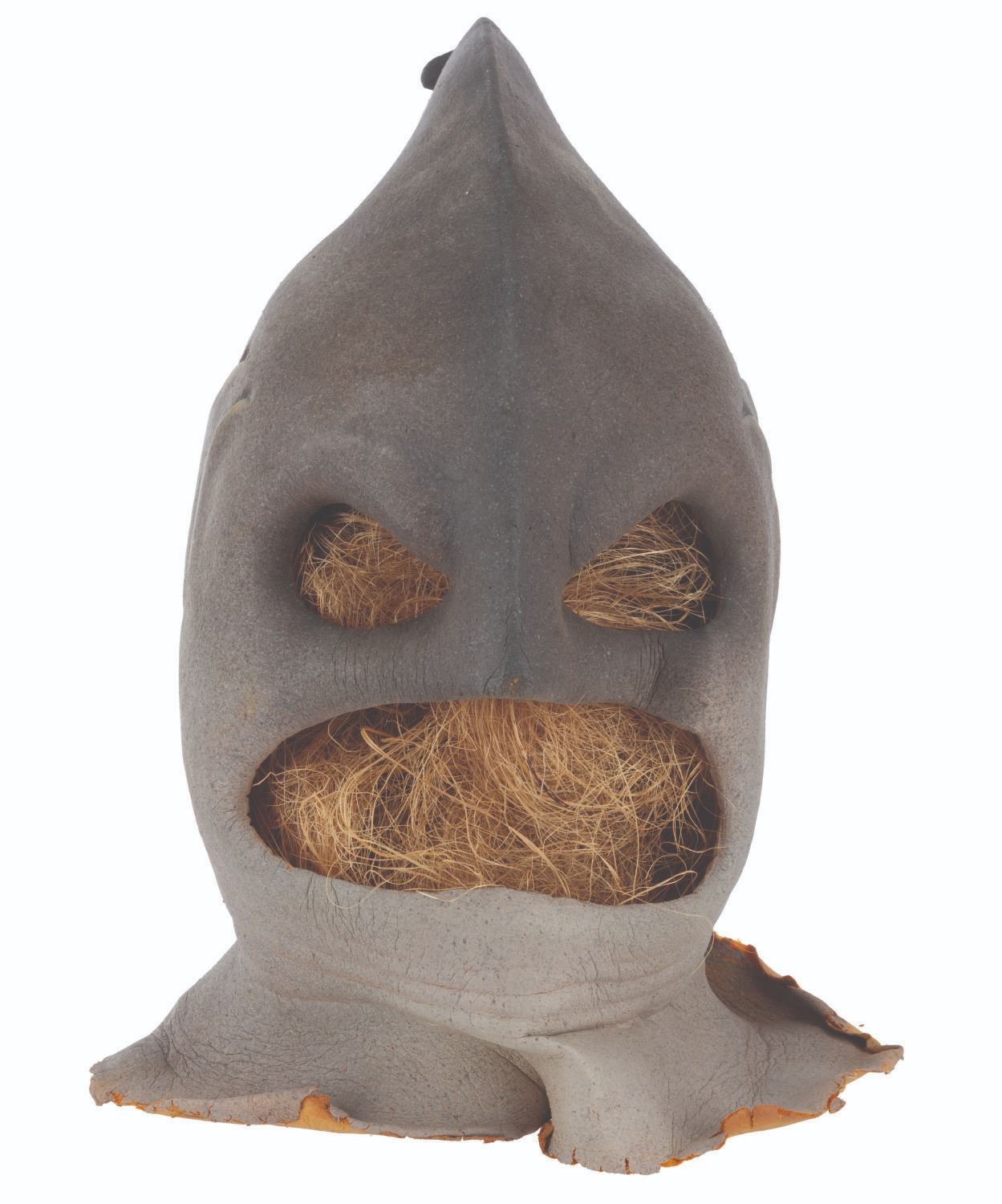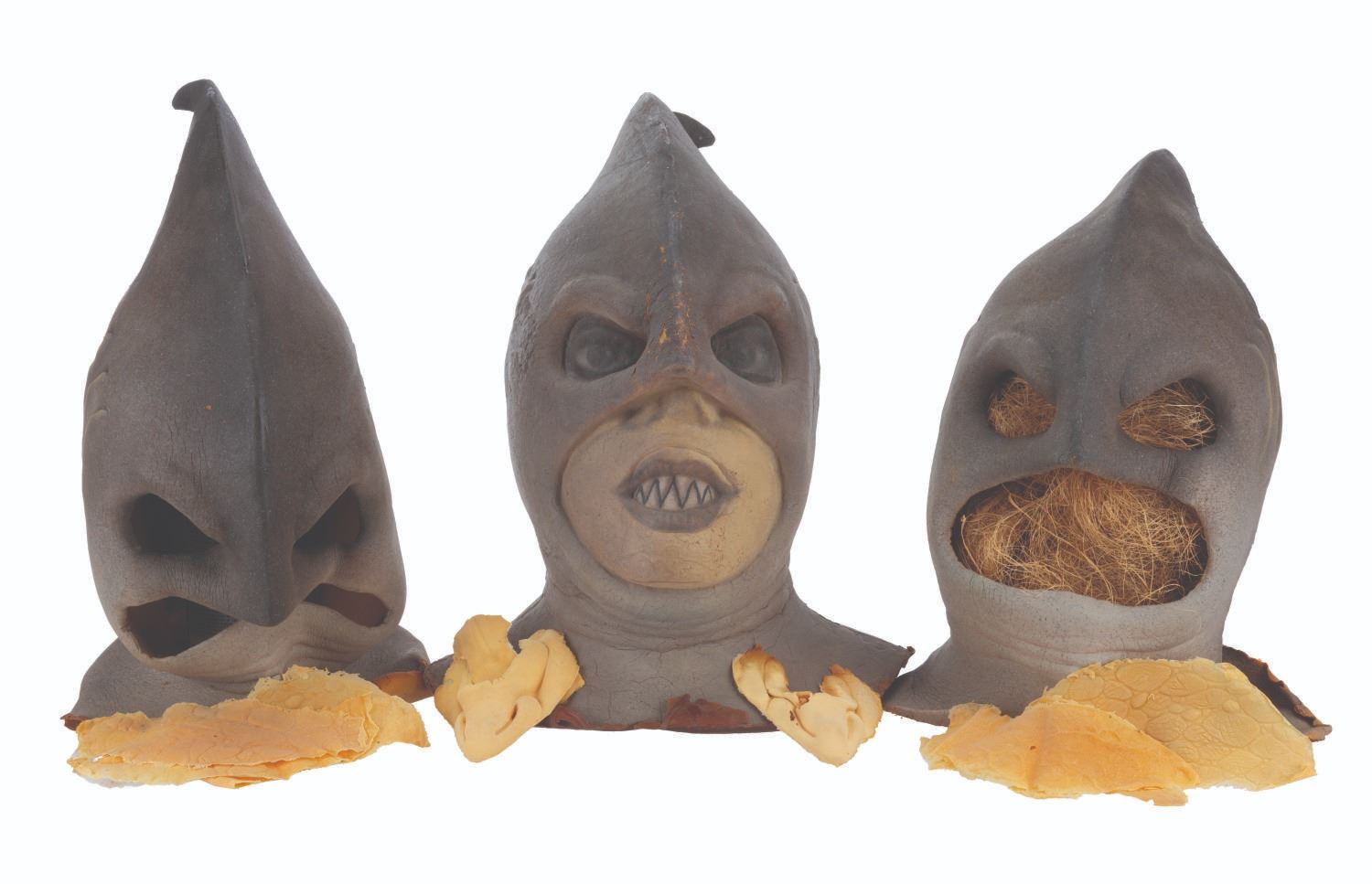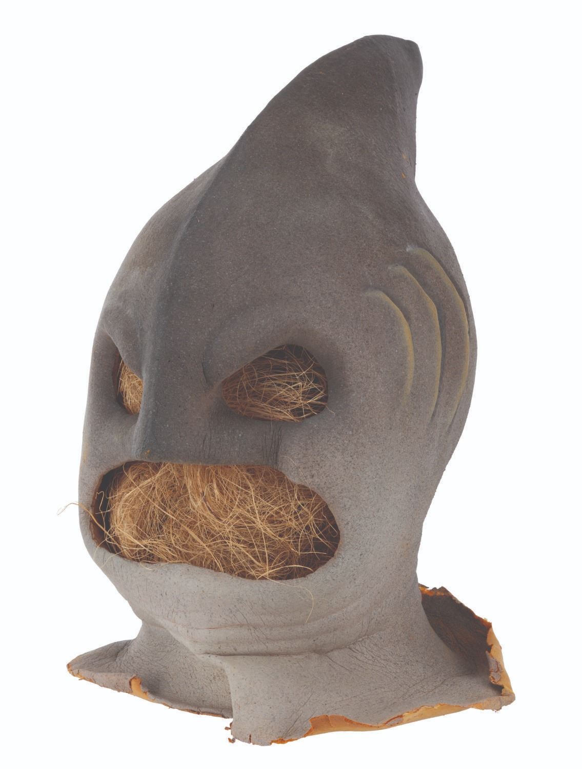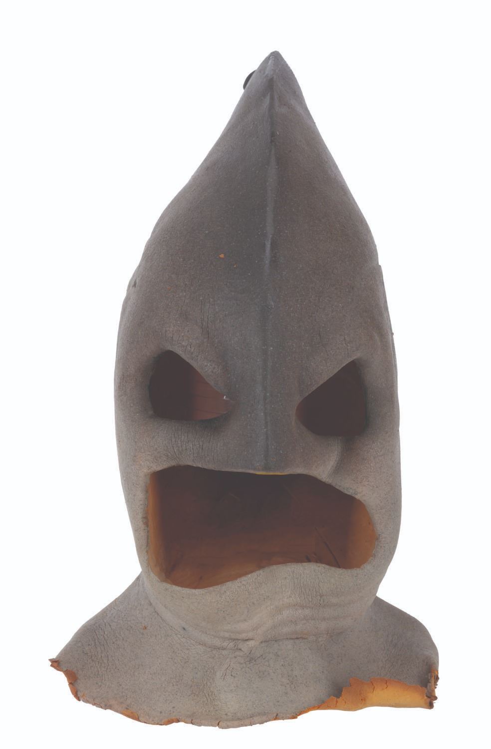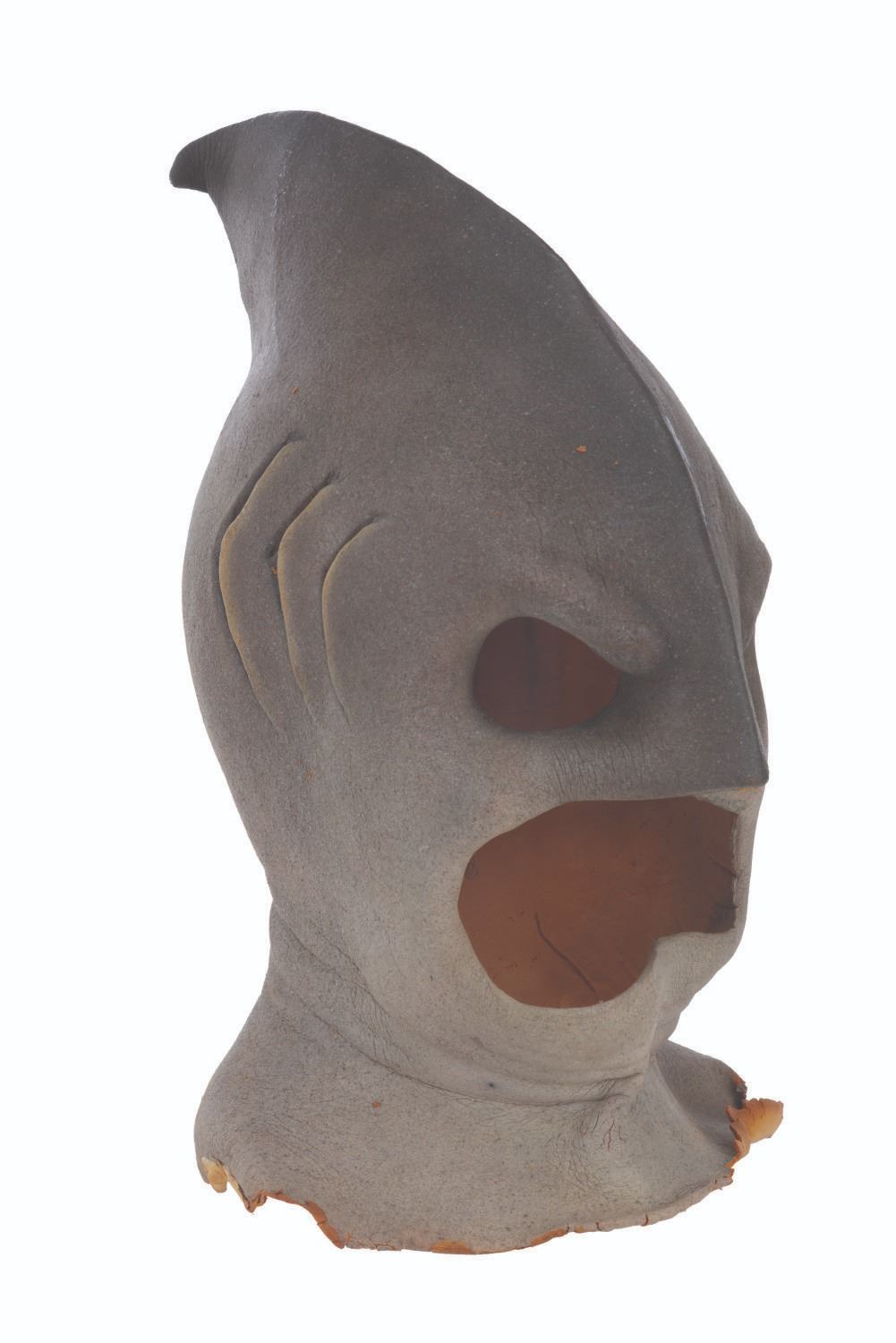 (CBS, 1992) A three-part head prosthetic collection for The Shark Guy from"The Amazing Live Sea Monkeys." The villain appeared in the episode "Top Secret," played by actor Vernon Wells, known for "The Road Warrior" and "Commando." Included are two hand-painted foam Shark Guy cowls that would fit over the performer's head and one full-head representation of what the cowl would look like on the performer. Also included are a handful of foam prosthetic face parts that would be attached to the performer's face while in the cowl. Measuring 12" x 15" x 15" tall, the prosthetics are in fair to good condition with the cowls exhibiting light paint loss and edge wear, and the full head in fair condition with extreme foam brittleness and paint cracking.
