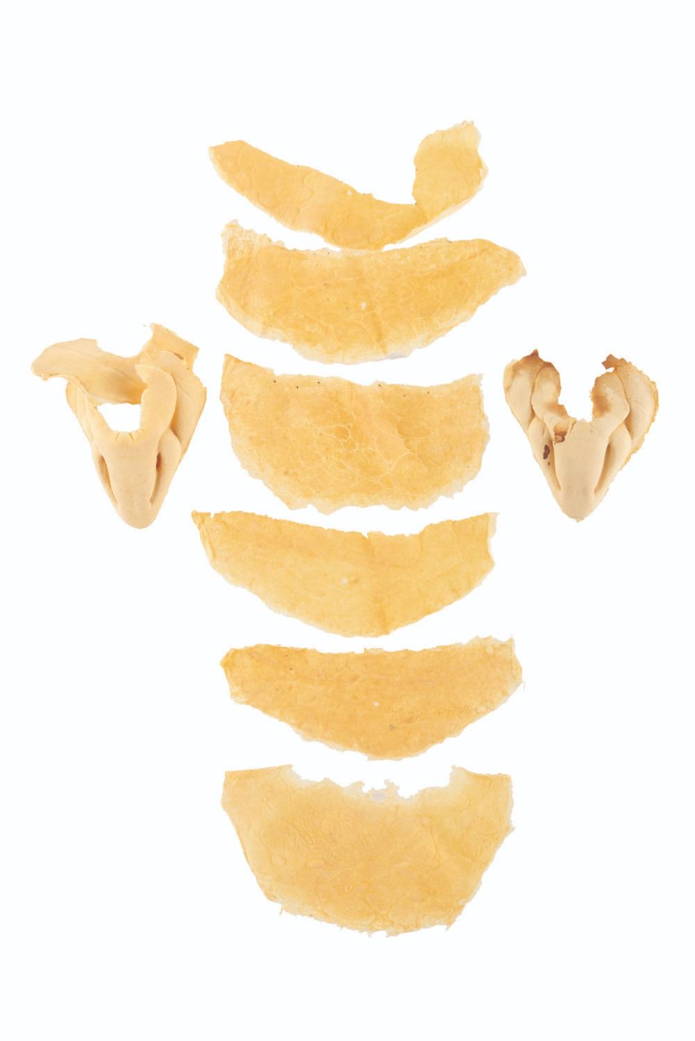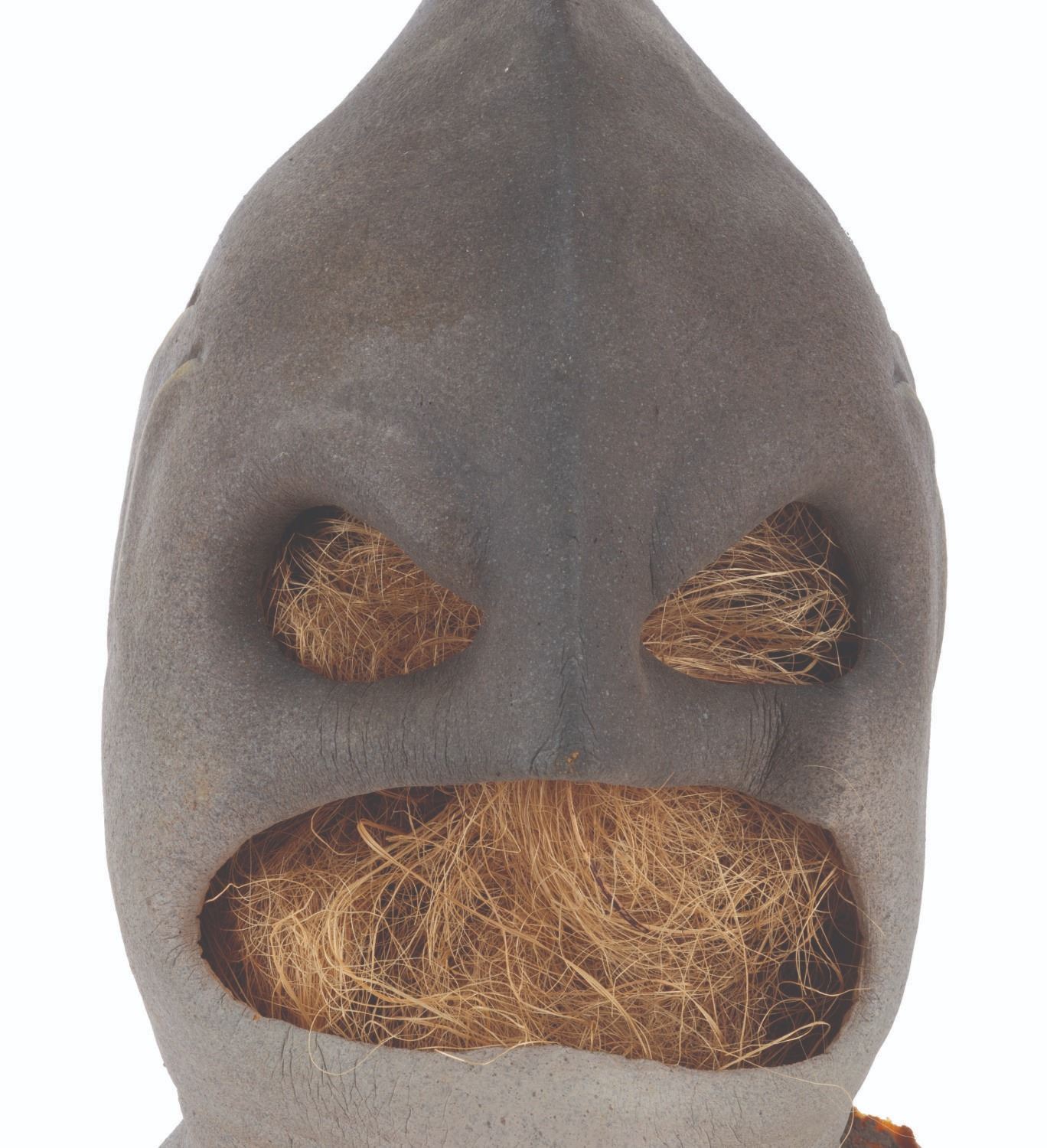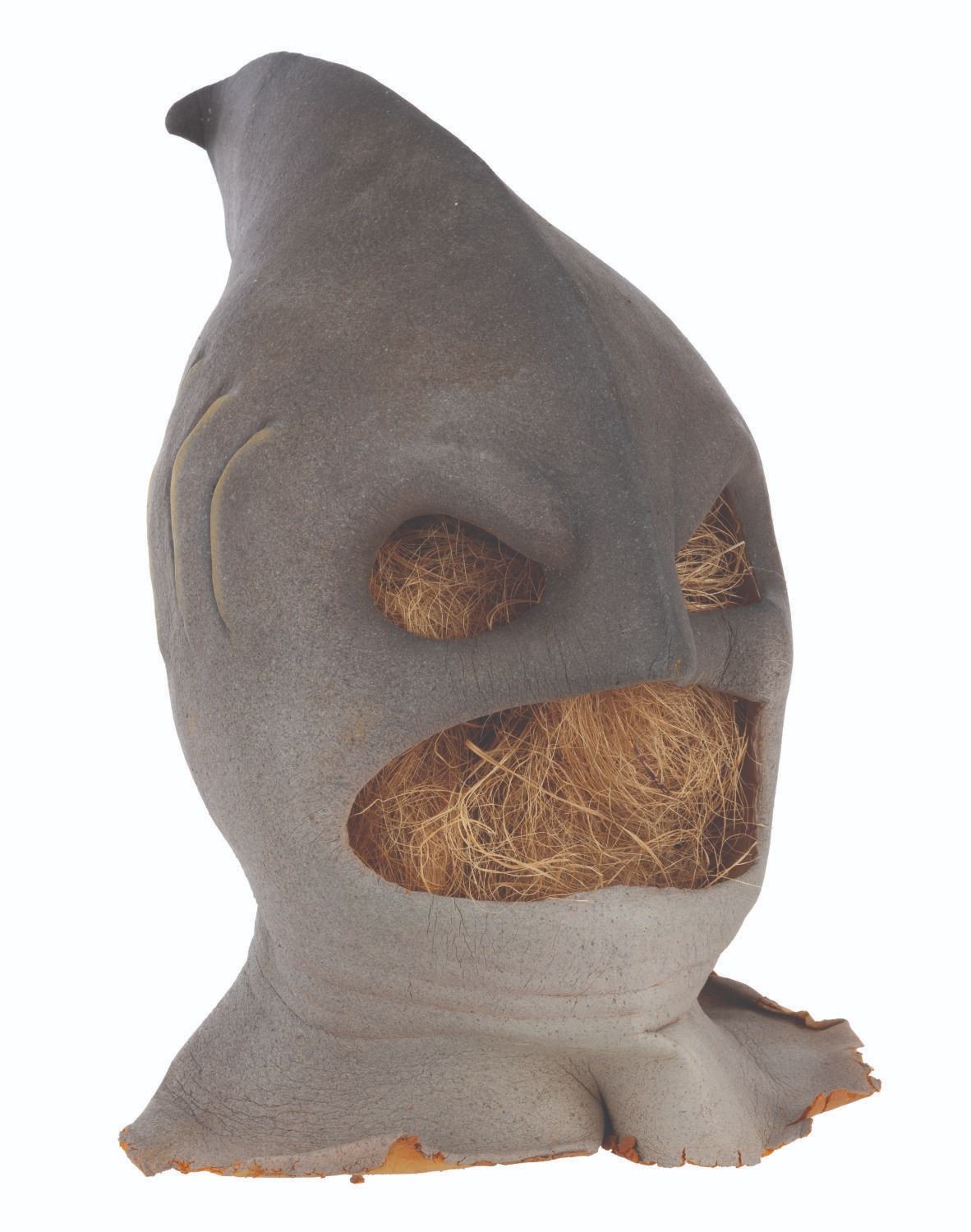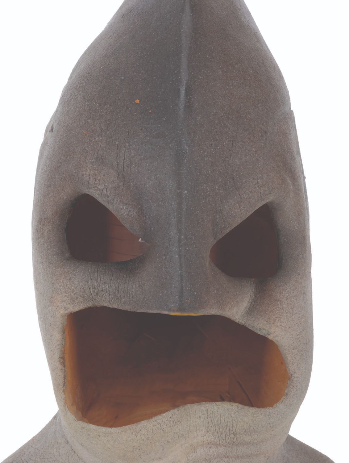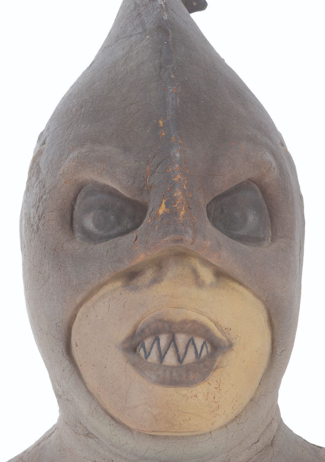 (CBS, 1992) A three-part head prosthetic collection for The Shark Guy from"The Amazing Live Sea Monkeys." The villain appeared in the episode "Top Secret," played by actor Vernon Wells, known for "The Road Warrior" and "Commando." Included are two hand-painted foam Shark Guy cowls that would fit over the performer's head and one full-head representation of what the cowl would look like on the performer. Also included are a handful of foam prosthetic face parts that would be attached to the performer's face while in the cowl. Measuring 12" x 15" x 15" tall, the prosthetics are in fair to good condition with the cowls exhibiting light paint loss and edge wear, and the full head in fair condition with extreme foam brittleness and paint cracking.