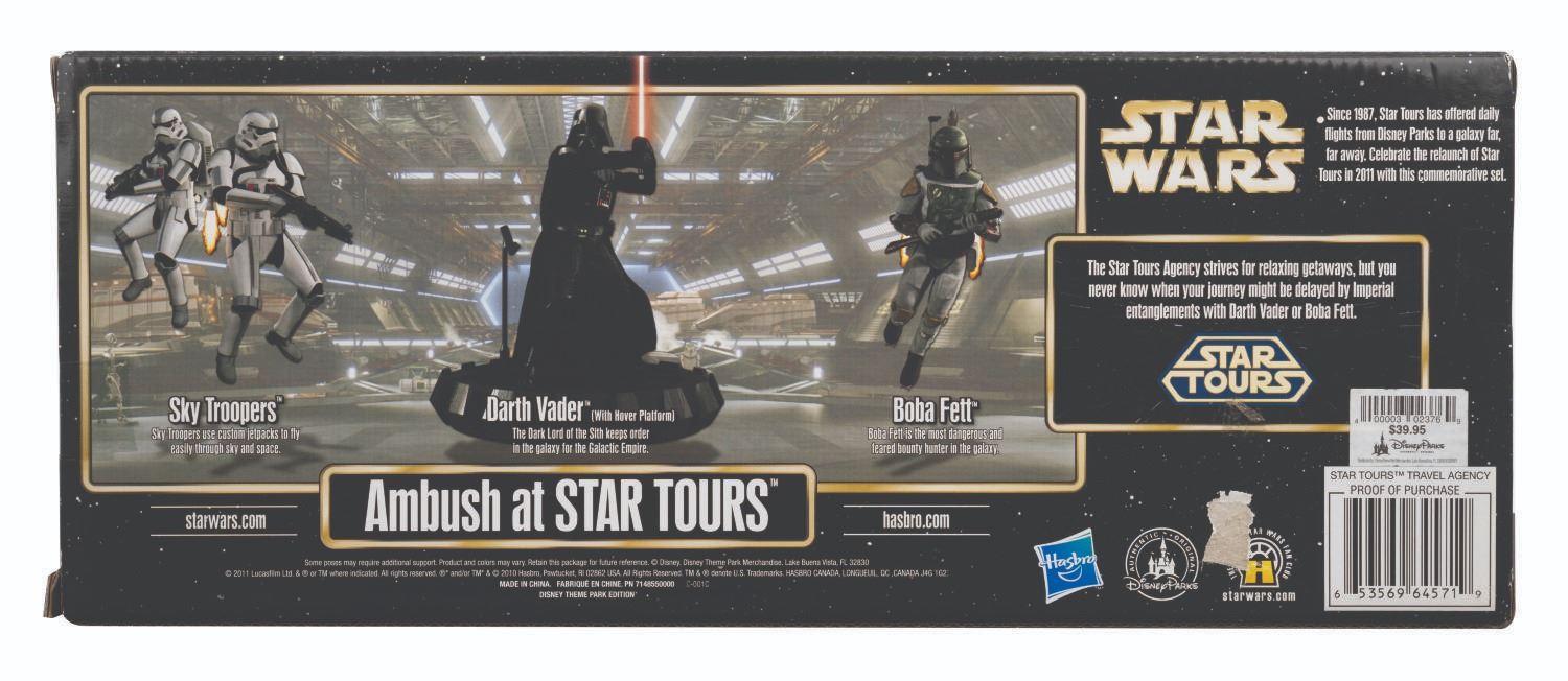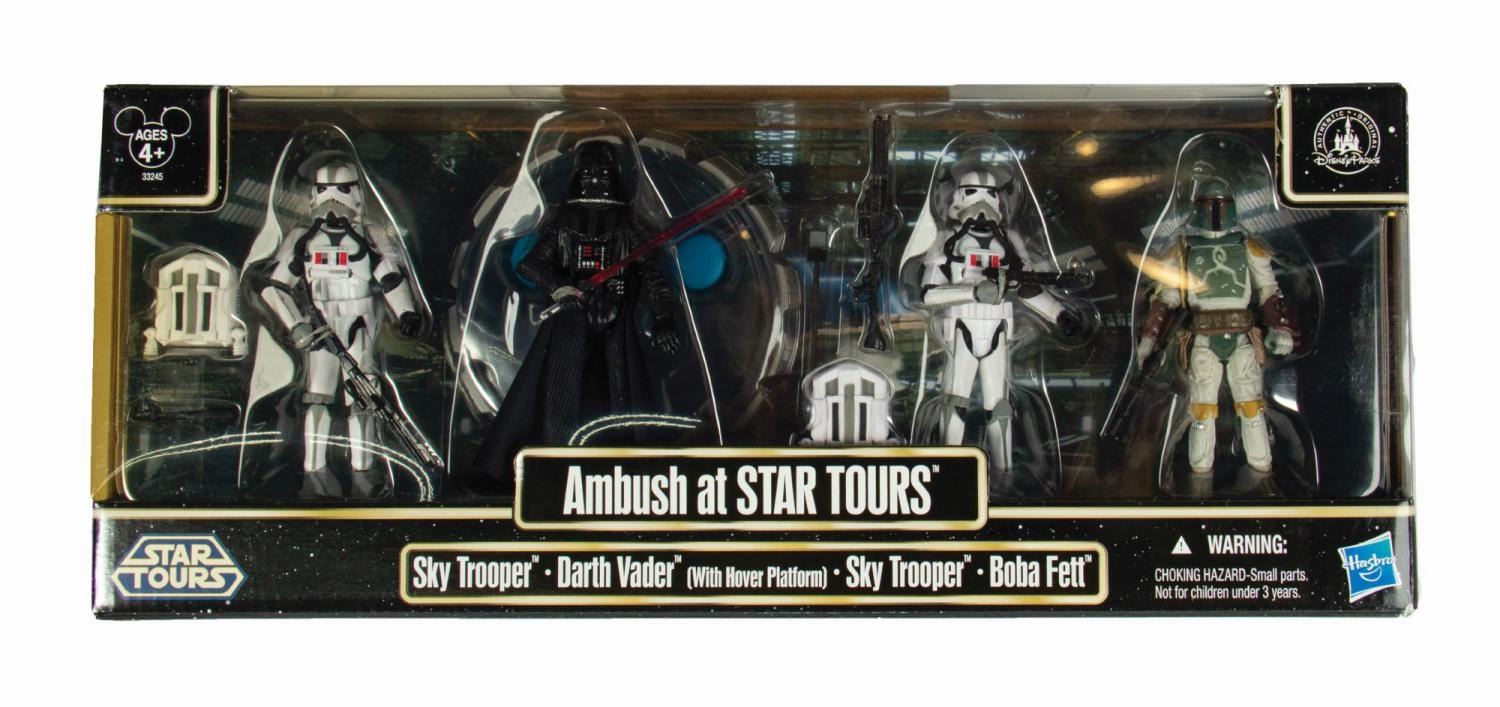 (Disney Parks/Hasbro, 2011) An Ambush at Star Tours Action Figure Set. This set of four action figures includes (2) Sky Troopers, Darth Vader, and Boba Fett as featured in the popular Disney Parks attraction. This set of 3.75"-scale figures was exclusively released through nearby merchandise locations at Disney Parks. The figures are in fine condition within their original 15"x6"x2.5" box.