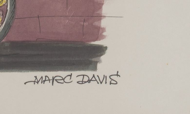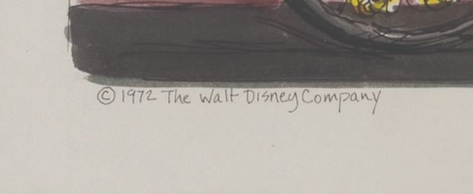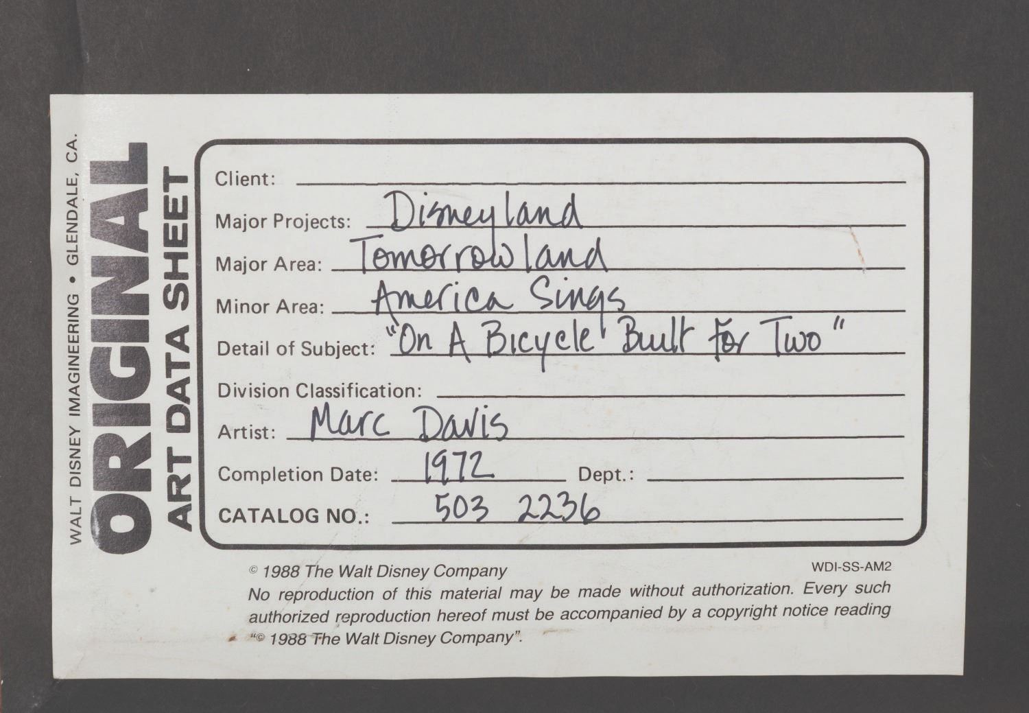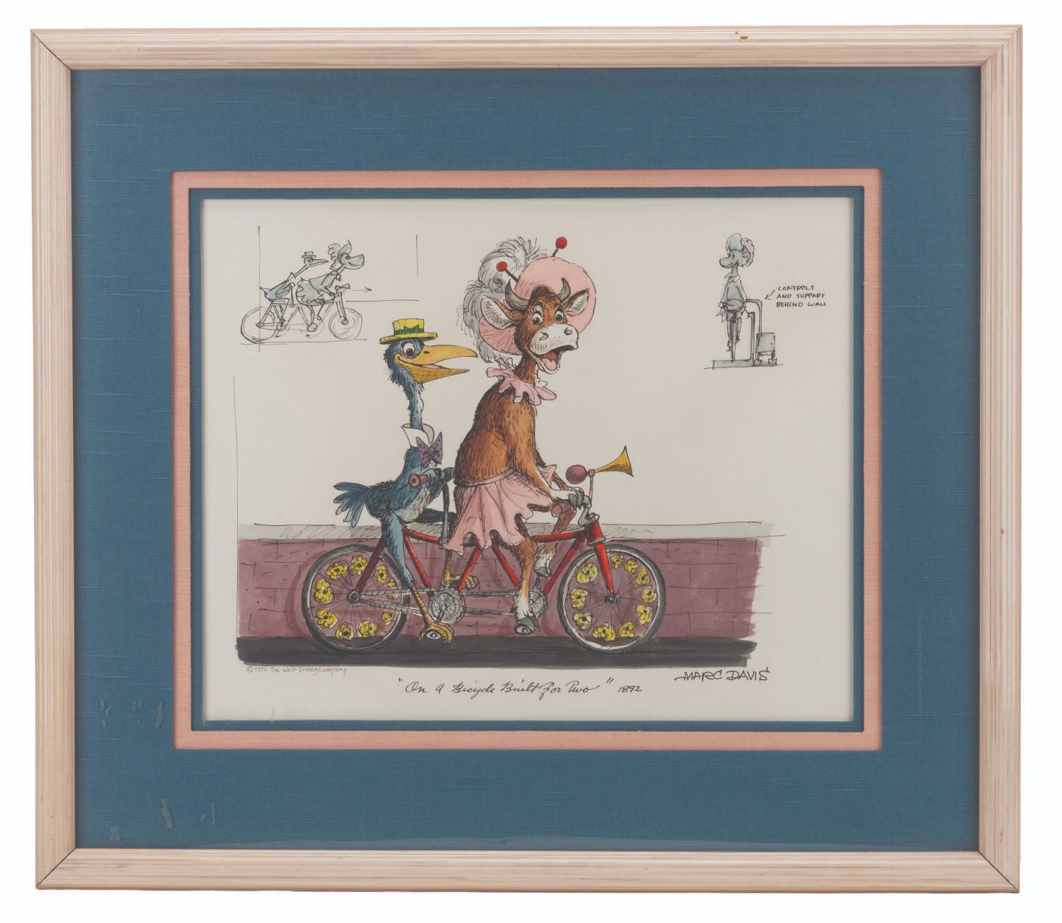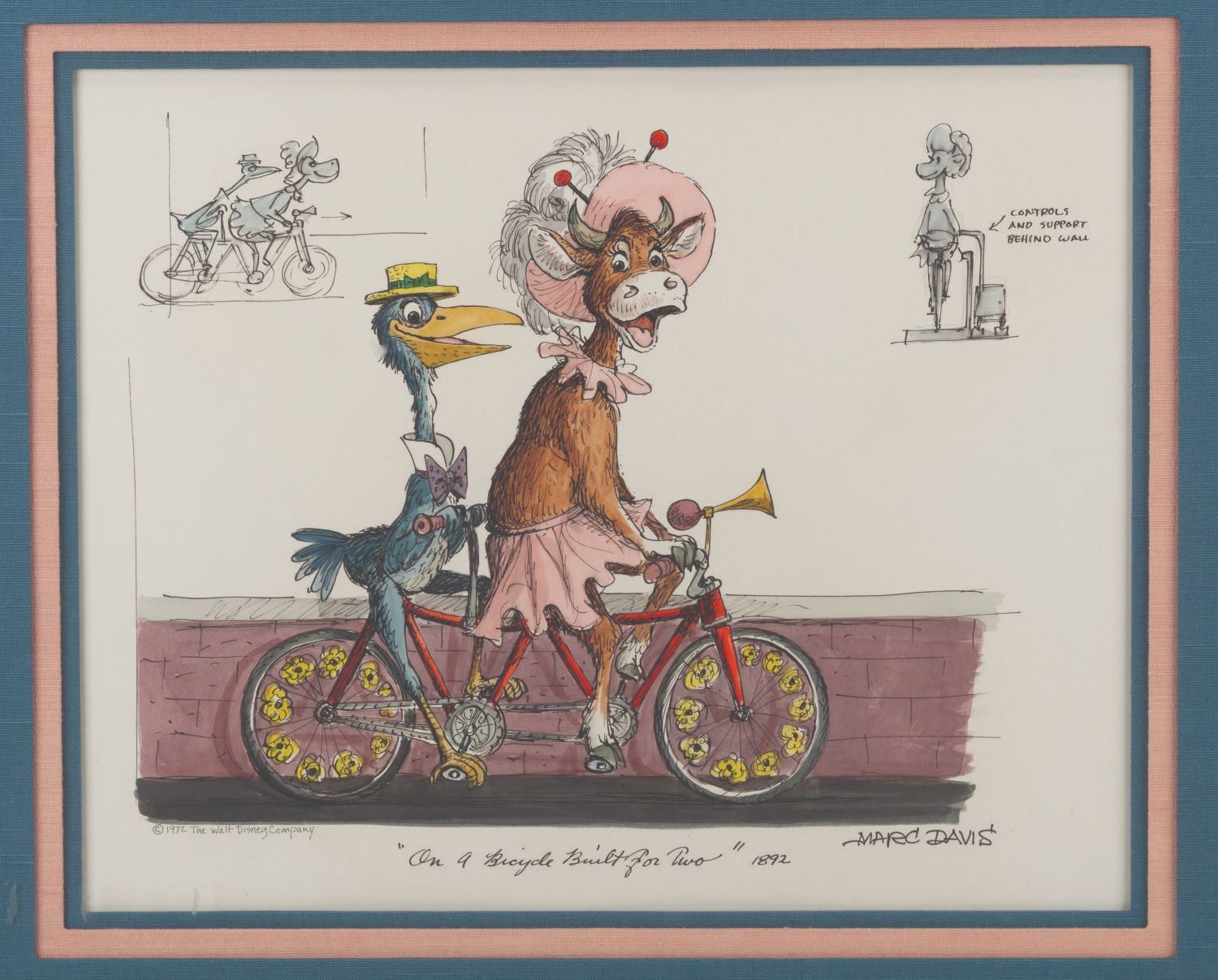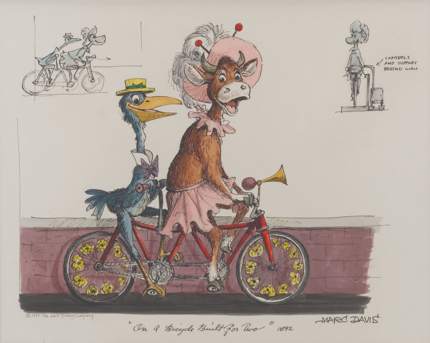 (Disneyland, 1972) An original concept painting by Marc Davis for America Sings titled"On a Bicycle Built for Two." The artwork, signed by Davis, depicts a scene of a cow and a stork on a bicycle, which was not used in the attraction. The art came from the Walt Disney Imagineering Art Library and maintains its original tag on the reverse. Measuring 13" x 16" visible in a 21.75" x 24.75" frame, the ink and watercolor artwork is in fine condition. The frame is in good condition with light handling wear, gaps in the framing and adhesive residue, and scratches to the glazing.