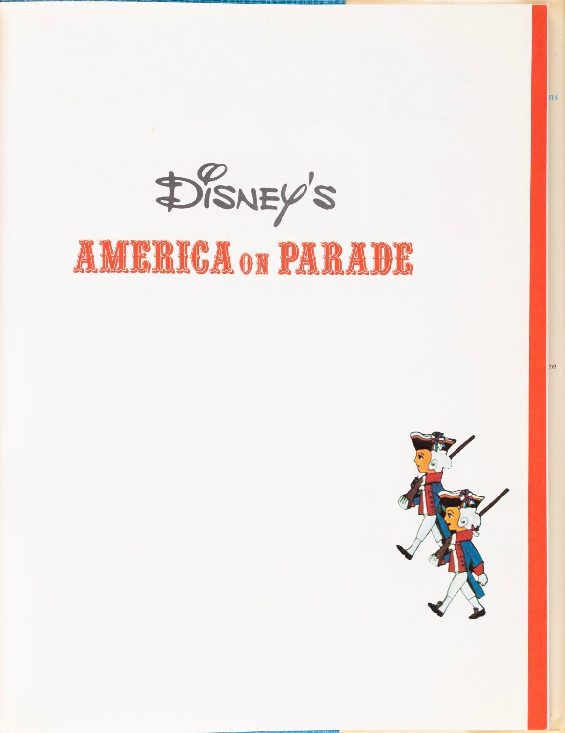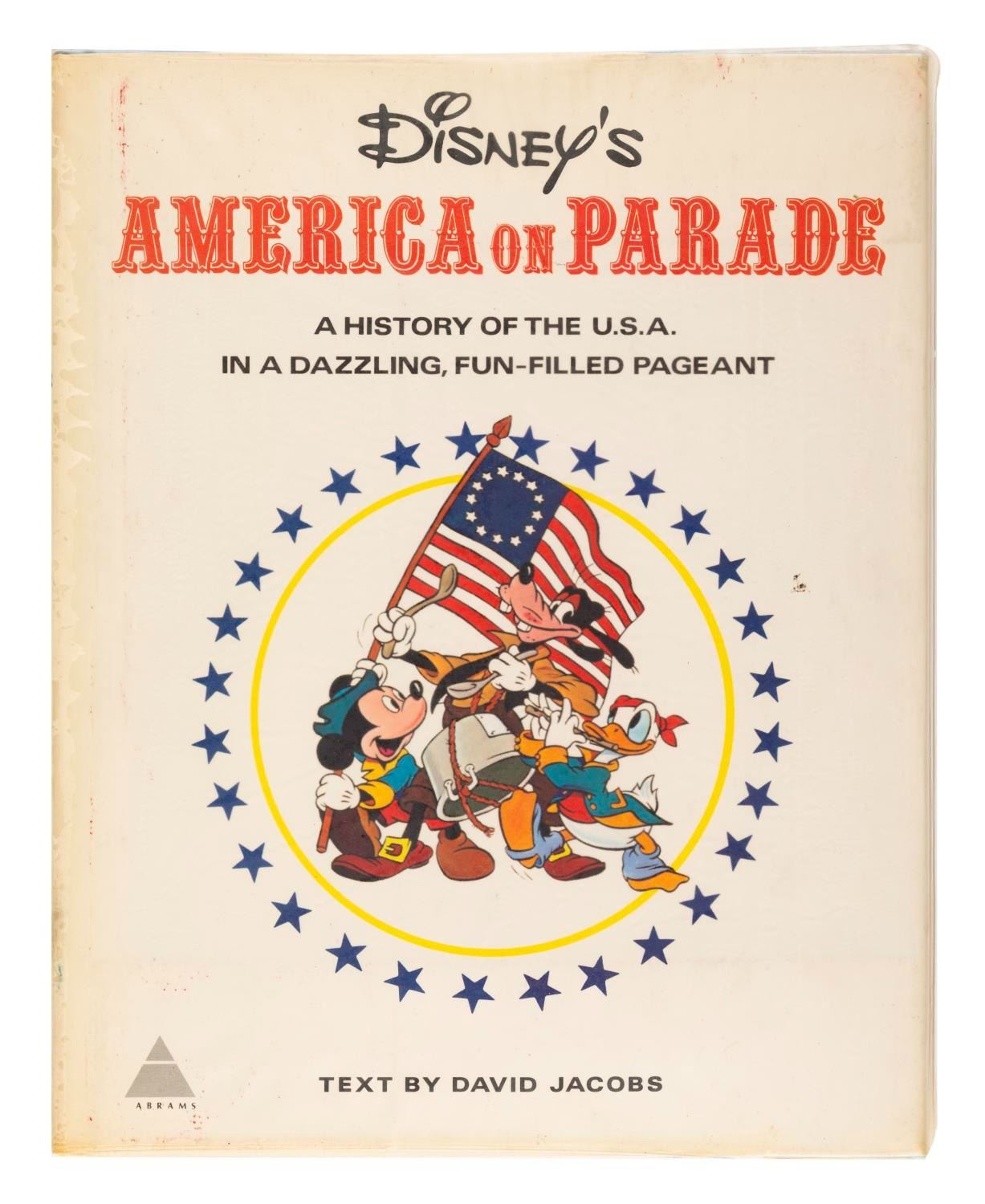 (Disney, 1975) A Disney's America On Parade: A History of the U.S.A. in a Dazzling, Fun-Filled Pageant book. Written by David Jacobs, the book provides a retrospective primer of American history leading to the bicentennial celebration, with illustrations and photographs of concept drawings and models used to produce the parade floats for Disneyland and Walt Disney World. Measuring 9.25" x 11.5", the 143-page book is in good condition with wear to the front and back of the jacket, very light edge wear to the cover, foxing and light wear on the page edges, and overall discoloration from age.