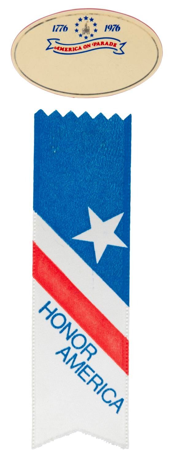 (Disneyland, 1975-1976) An unused Cast Member name tag and ribbon for Disneyland's "America on Parade" bicentennial celebration. Measuring 2.5"x1.5" with ribbon length of 5", the name tag and ribbon are in good condition with surface scratches on both the ribbon and tag, and a small pin hole, likely from the name tag, on the ribbon.