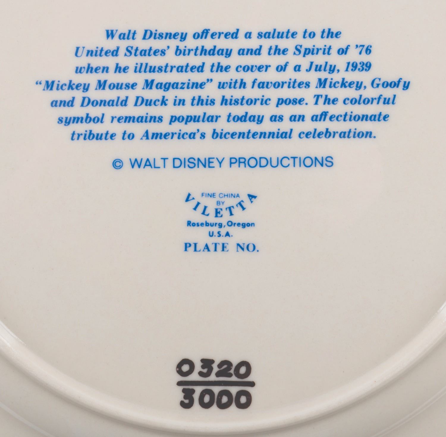 (Disneyland/Walt Disney World, 1975-76) A limited edition decorative plate manufactured by Viletta from the America on Parade bicentennial celebration. The plate features Mickey, Donald, and Goofy recreating the Spirit of ‘76 painting by Archibald M. Willard. Numbered 0320/3000, the plate measures 10.75" in diameter and displays in good condition with scratches, wear, and heavy scuffs on the blue ring.