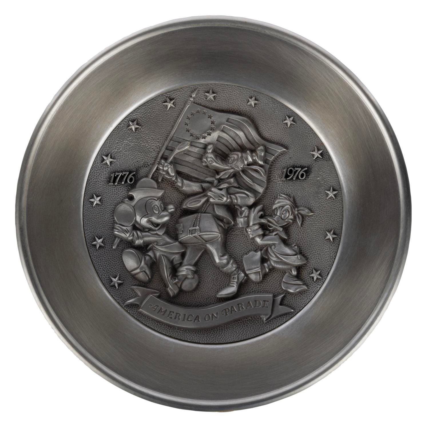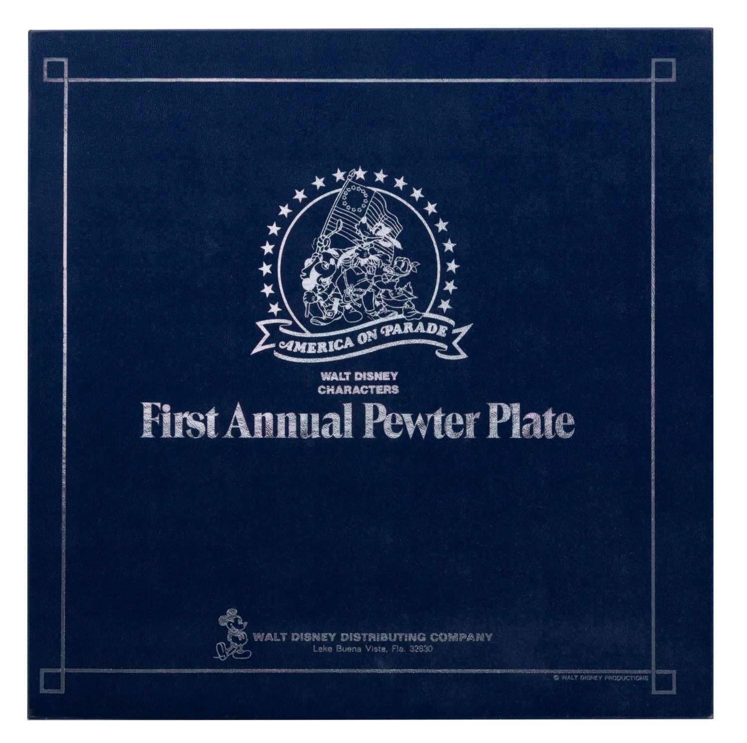 (Disneyland/WDW, 1976) A First Annual Pewter Plate manufactured by B&J released for the "America on Parade" bicentennial celebration. Measuring 9" in diameter, the plate is in very good condition with slight tarnishing on the reverse, and comes in the original box which measures 11"x11" and 1" thick.