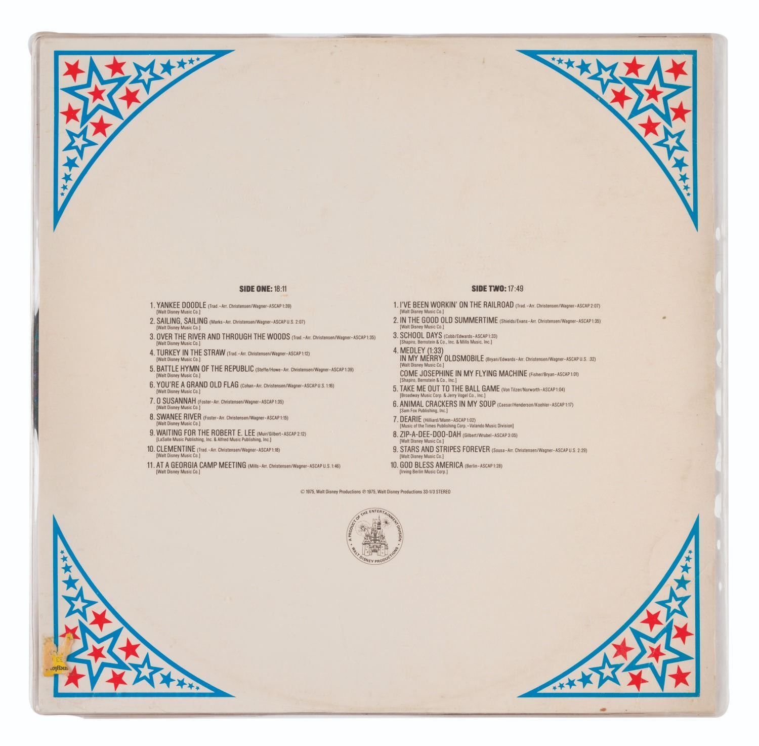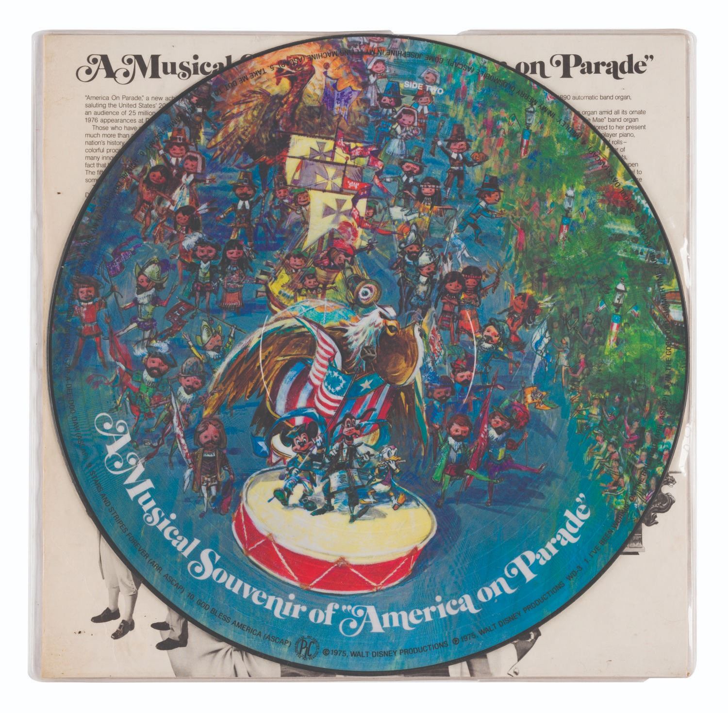 (Disneyland, 1975) A picture disc featuring music and imagery from the Disneyland Bicentennial celebration, "America on Parade." Measuring 12" in a 12.25"x12" sleeve, the record is in very good condition with some light creasing to the cardboard backing, and splitting to the center of two edges of the plastic sleeve.