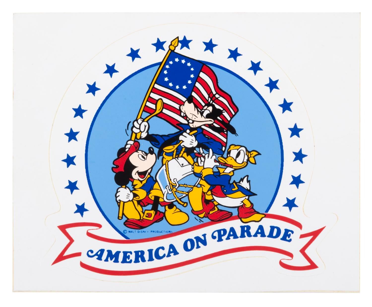 (Disneyland, 1976) A souvenir decal from America on Parade, Disneyland's celebration of America's bicentennial. Measuring 3.5” x 4” on its original 3.75” x 4.5” backing, the sticker is in fine condition.