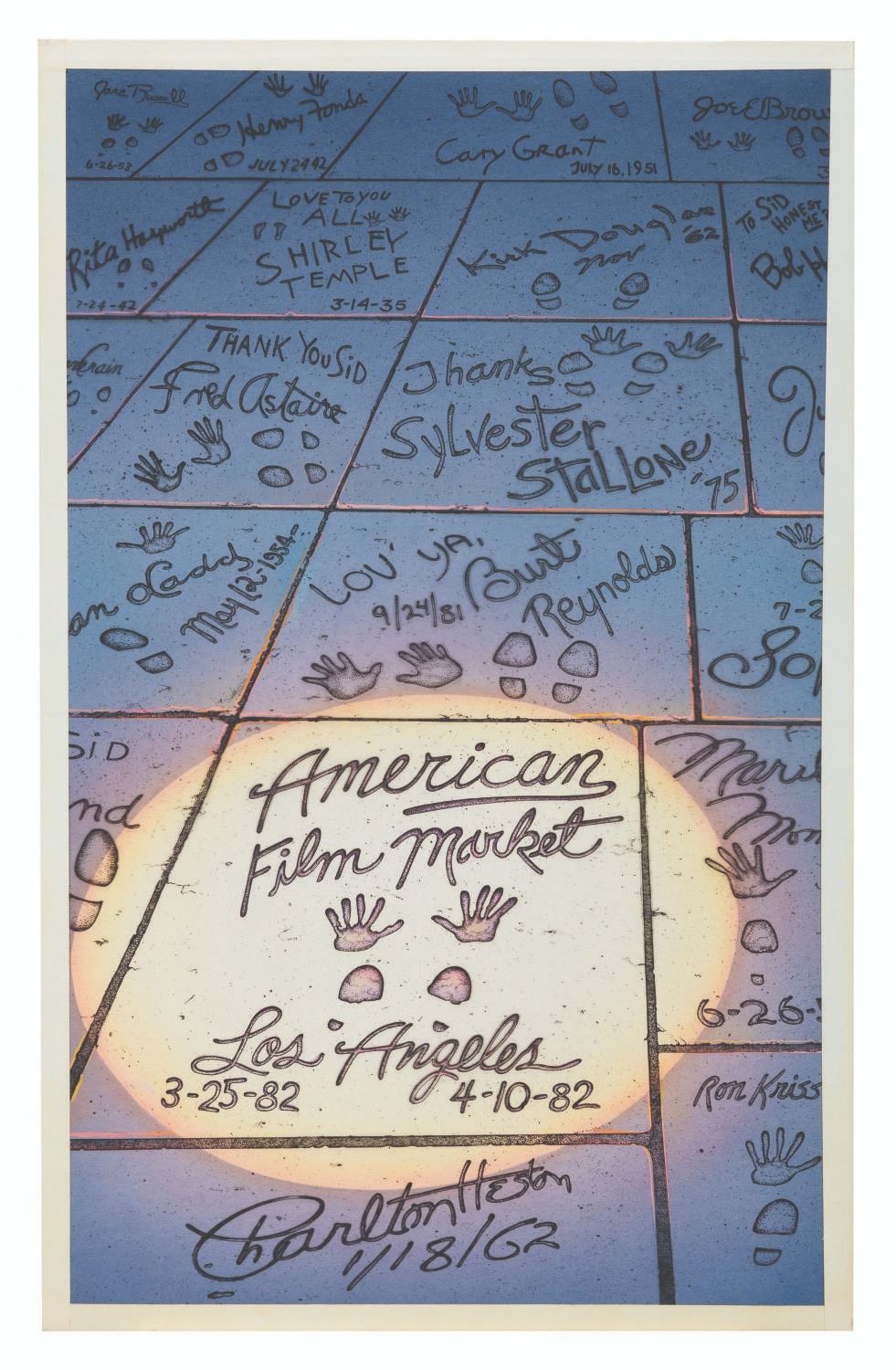 (American Film Market, 1982) An original poster layout for the 2nd annual American Film Market, the premier entertainment industry event for the sale and acquisition of movies for release. Similar to the celebrity handprints at Grauman's Chinese Theatre in Hollywood, the art features the hands of stars such as Fred Astaire, Shirley Temple, Kirk Douglas, Sylvester Stallone, Burt Reynolds, and Charlton Heston. This piece from artist Bill Wallen's collection is composed of painted accents on an artist's board, covered with a hand-painted cel bearing the handprints, footprints, and names of the stars. Measuring 15.25" x 24", the layout is in very good condition with light scratches and wear.
