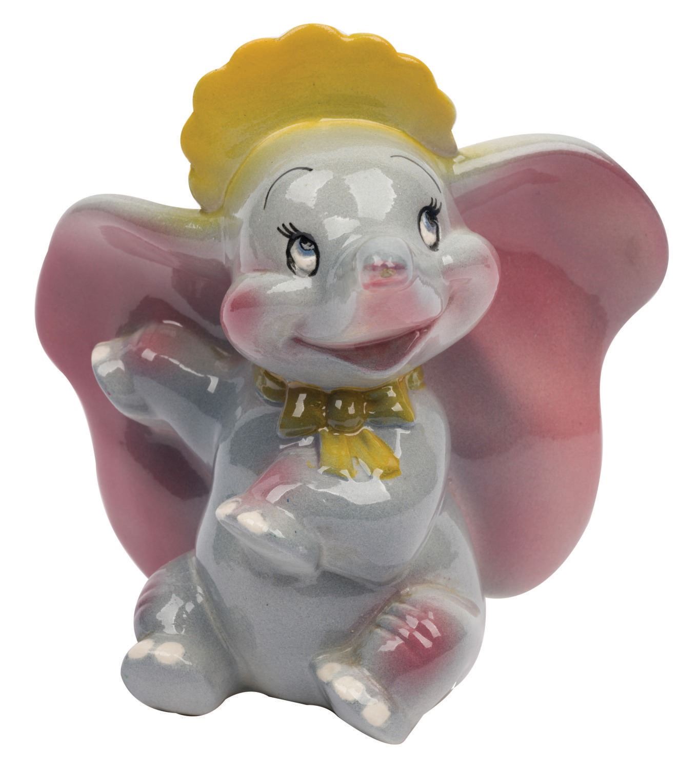 (American Pottery, 1940s) A charming painted glazed ceramic figurine of Baby Dumbo produced by American Pottery in the 1940s. The 5.5" tall figurine is in fine condition with good paint and glaze.