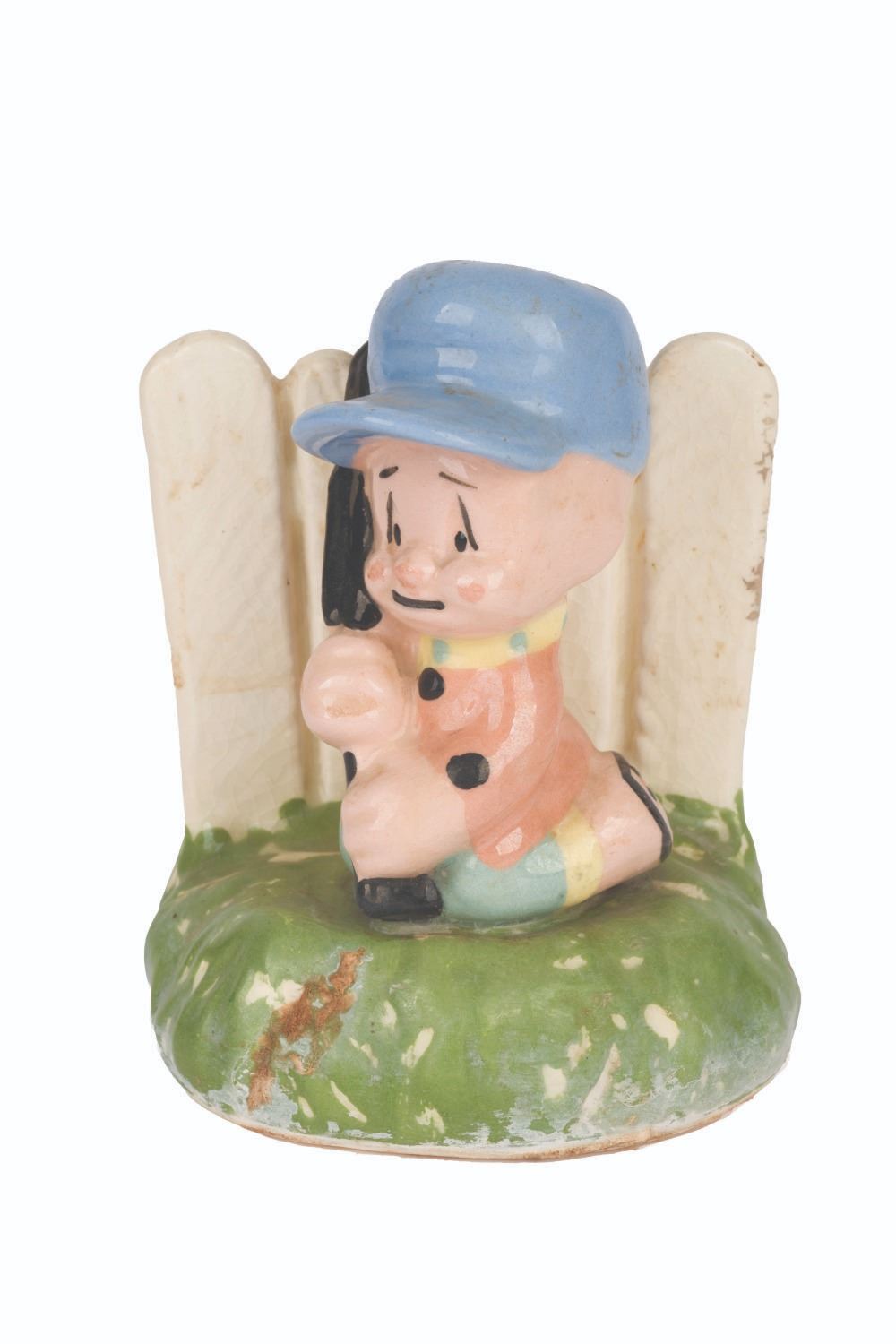 (American Pottery, 1940s) An Elmer Fudd painted glazed ceramic planter by American Pottery of Los Angeles. Measuring 4.25" x 4.5" x 5" tall, the planter is in fair condition with crazing throughout, paint loss, stains, adhesive on the bottom of the base, and wear.